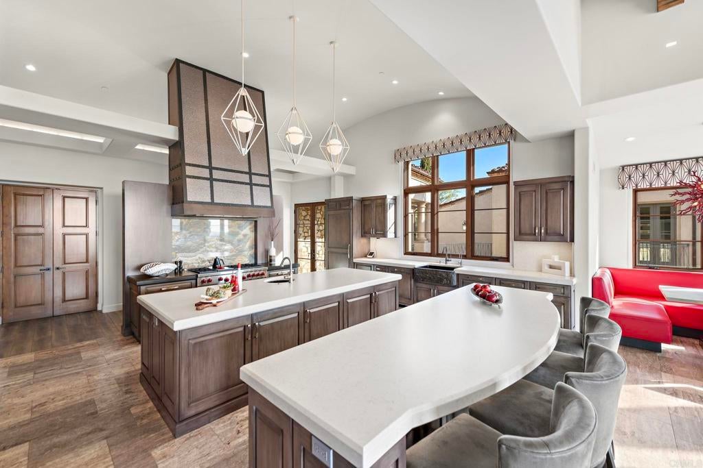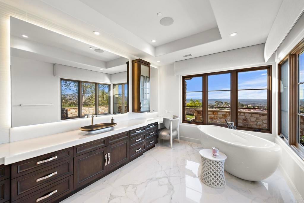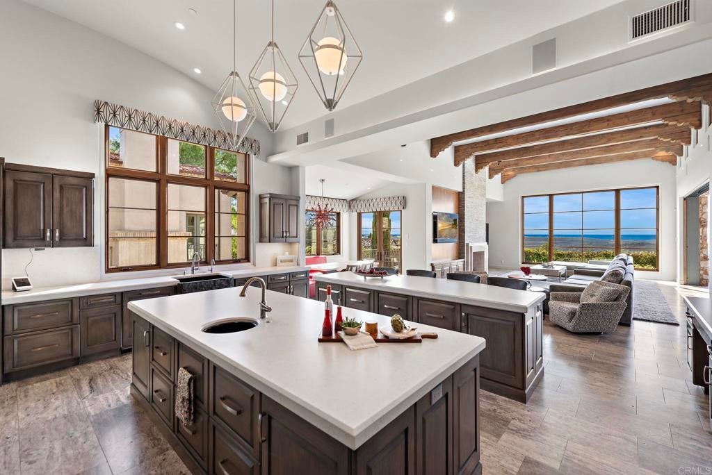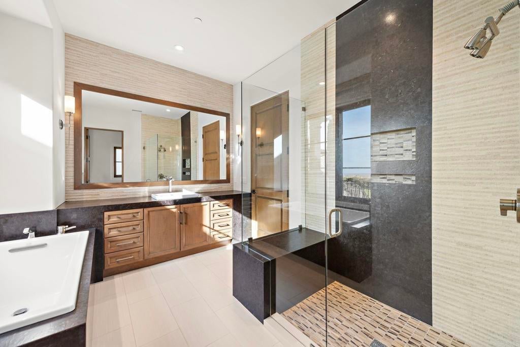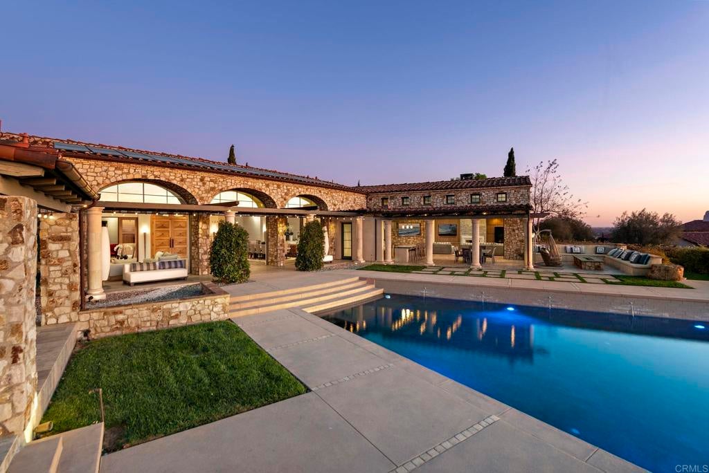 Nestled in the guarded enclave of Santaluz, 8114 Sendero de la Pradera is a 2015 Mark Agee custom built masterpiece located on the 17th hole of this stunning Rees Jones championship golf course. Spanning over 10,800 sq ft on a one-acre parcel, this elegant estate offers 5 bedrooms, 8 baths, and breathtaking ocean, valley, and mountain views. Seamless indoor-outdoor living features a vanishing-edge infinity pool, separate spa, a secondary pool with slide and al fresco entertaining pavilion. Detached, self-contained casita provides comfort for short- or long-term guests. The gourmet chef’s kitchen boasts premium appliances and marble finishes and custom cabinetry . Enjoy a private theater, game room, soundproof music studio, five-car garage, owner-owned solar, and whole-home water filtration. This property is the pinnacle of luxury, refinement, and privacy, ideally suited as an Entertainer’s CROWN JEWEL.