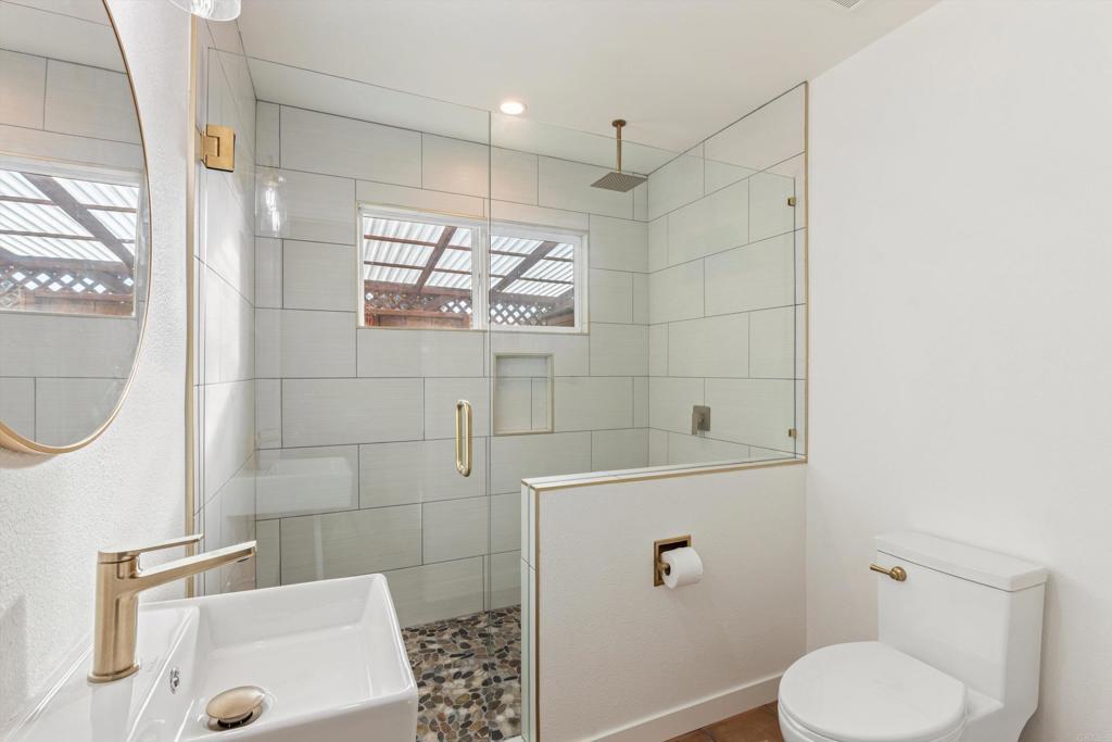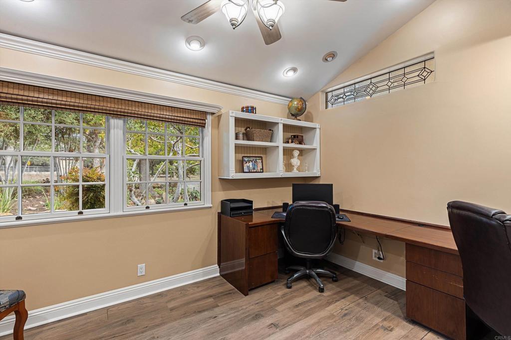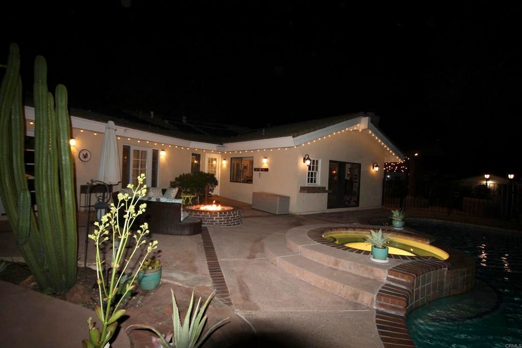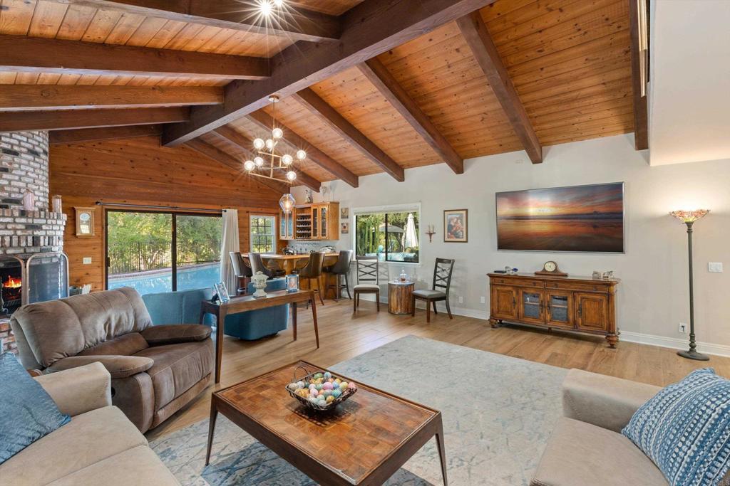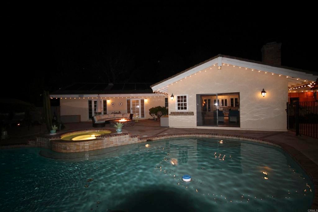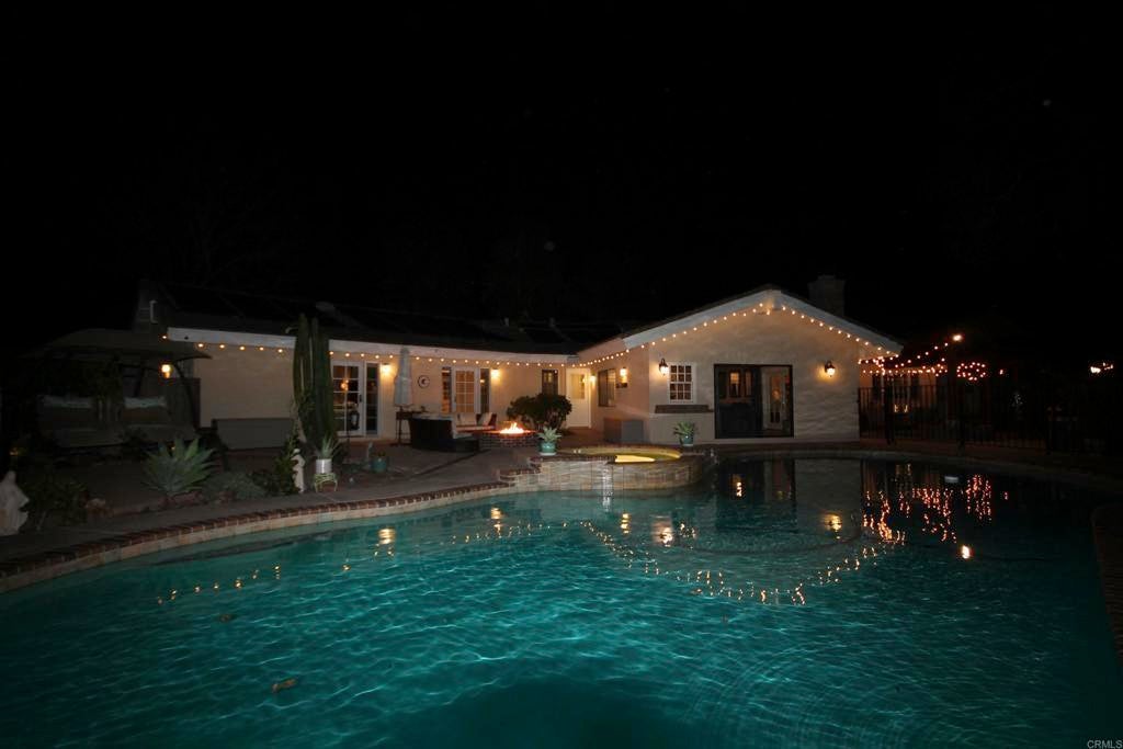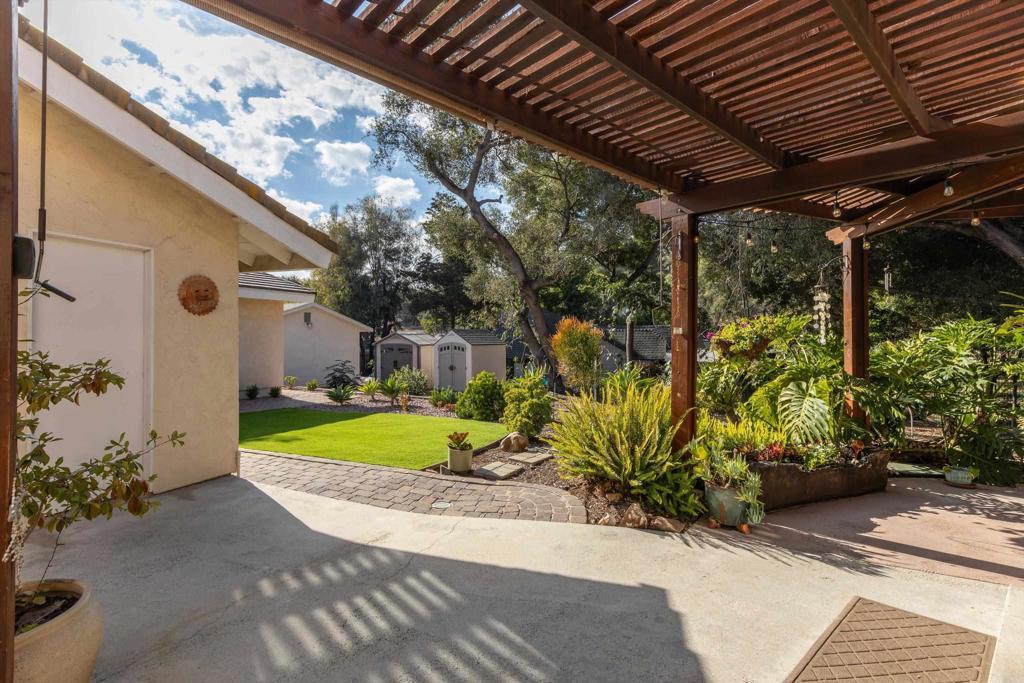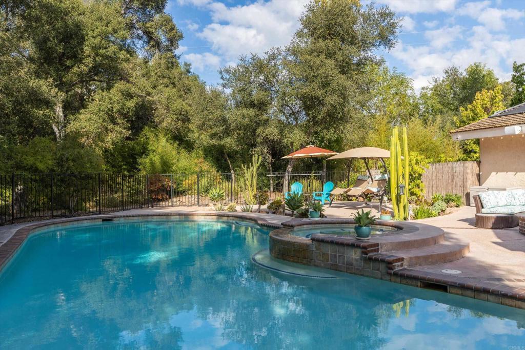 Exceptional 1-Story Home (4 Bedrooms + 3 Baths) w/Beautiful Pool & Spa, Solar System (paid) -and- a Brand New Detached Studio (w/kitchen, bath, yard, and parking) on a 1-Acre Lot. This singular home w/award-winning landscaping and exterior lighting, pergola, natural rock hardscape, rock water feature sounding like a babbling brook, and private patios that wrap around the back of home is like being in an exclusive resort. Enter into the formal living room w/open beamed ceiling, fireplace, a bar w/wine frig and large windows that overlook the pool and beauty of mature oak trees that run across the back of lot. Impressive Kitchen w/a 6-burner cook top, double oven w/warming drawer, new refrigerator, custom cabinets w/pull-out shelves, soft close doors and drawers, and a huge frameless bay window that overlooks patio/garden. Tile flooring throughout. The family room adjoins the kitchen's dining area and has beamed ceilings, lots of windows and a pellet stove for warmth. Crown molding and upscale door hardware thru-out home. All bedrooms have open beam ceilings and soffits w/recessed lighting and ceiling fans. Bdrm Office has a vaulted ceiling & built-in desks. The Primary Suite is a special retreat w/his-and-her closets, French doors out to the pool -plus- a small walled-patio to sit and enjoy the morning sun. Hall Bathroom is spa-like w/jetted soaking tub and shower has 12 shower heads. Laundry room w/cabinets. Third Full bathroom accommodates pool area. Detached 3-car garage next to house has RV Parking in driveway. New Detached 2-Car Garage (permitted) w/driveway access on Buena Creek. Two HVAC Systems one heating unit new 2025. Two Solar Systems--(house and pool - paid). Automated Sprinklers/Drip System. Alarm System. Fire Pit. Surround-Sound Speakers. Potting Shed, 8 raised garden beds and numerous fruit trees including orange, avocado, nectarine, lime, lemon and more. Two sheds in backyard stay. This home is more than special; it's one-of-a-kind. Come see what luxurious, resort-like living is all about.