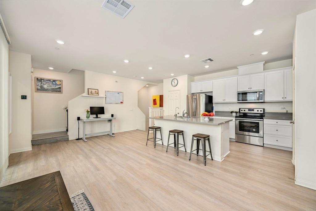 Experience easy, modern living in this beautifully maintained townhome—the perfect blend of style, efficiency, and convenience. Enjoy the modern comfort in this beautifully maintained 2021-built townhome located in the heart of San Marcos, surrounded by award-winning schools and everyday conveniences. With low HOA fees and a interest rate buy-down available, this home offers incredible monthly savings and an unbeatable opportunity for today’s buyers. The open-concept main living area feels bright and inviting with 9-foot ceilings, abundant natural light, and stylish Luxury Vinyl Plank flooring. The spacious kitchen features Quartz countertops, stainless steel appliances, a walk-in pantry, and a large island perfect for everyday living, hosting friends, or working from home. A private balcony extends the living space and offers a great spot to unwind. Upstairs, you’ll find two generously sized bedrooms, each with its own en-suite bathroom for comfort and privacy. The primary suite provides a peaceful retreat, while the hallway laundry closet with stackable washer and dryer adds everyday convenience. This home also includes solar, an EV charging outlet in the garage, central AC, and a two-car garage. Thoughtfully designed with modern finishes and energy-efficient features, it offers both comfort and practicality. Located in the desirable Viewpointe community, residents enjoy a park, playground, BBQ area, and dog park. The location is ideal—just minutes from Cal State San Marcos, Palomar College, dining, shopping, medical centers, and convenient freeway access.