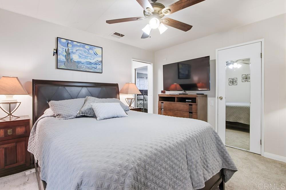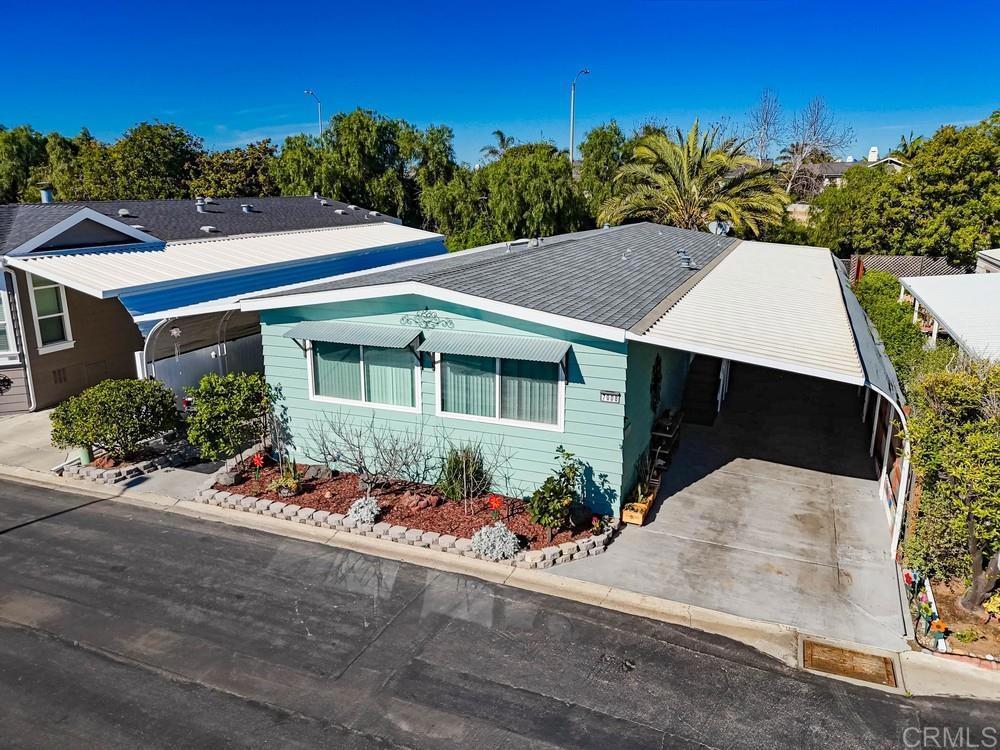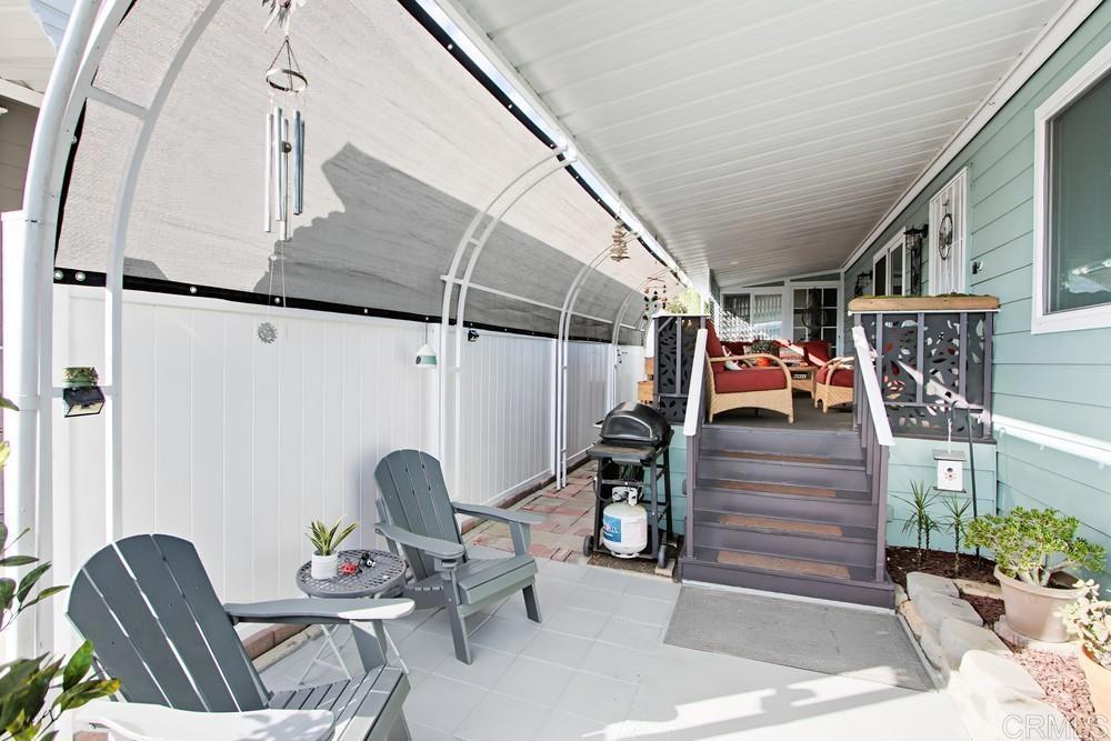 Beautiful turnkey, move-in ready home in highly desired Lakeshore Gardens located just minutes from South Carlsbad State Beach. Furniture is included with the home. The kitchen has had wonderful updating and both bathrooms have been exquisitely remodeled. Primary bath has both a walk-in shower and soaking tub. The large front porch gives you an outstanding outdoor living space to enjoy the wonderful Carlsbad weather. The California Room/enclosed porch, currently used as an office, gives you extra space not included in the square footage of the home. The home has dual-pane vinyl windows and sliding glass door. New roof was installed on the home in 2024. Exterior of the home was repainted in 2025. Curved awning poles give you more space for parking. The shed allows you to have a workshop or an area to store your extra items. This home is on registration which means NO PROPERTY TAX. Lakeshore Gardens is a gated 5 star park with beautiful landscaped grounds with lakes and greenbelts. The community has many activities and amenities including a beautiful clubhouse, pool, spa, and gym. Shopping center is located across the street and the nearby Carlsbad village has many restaurants, shops, and cafes.