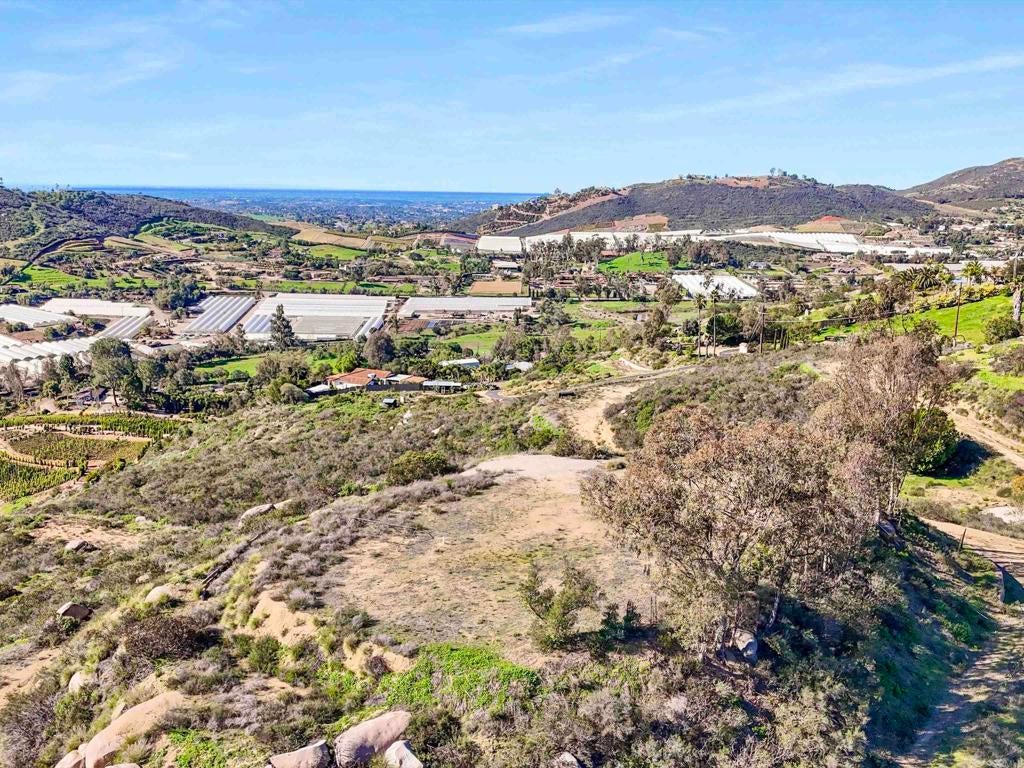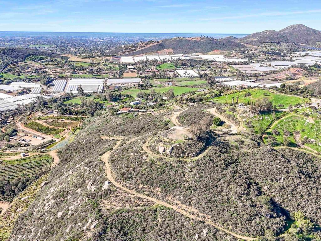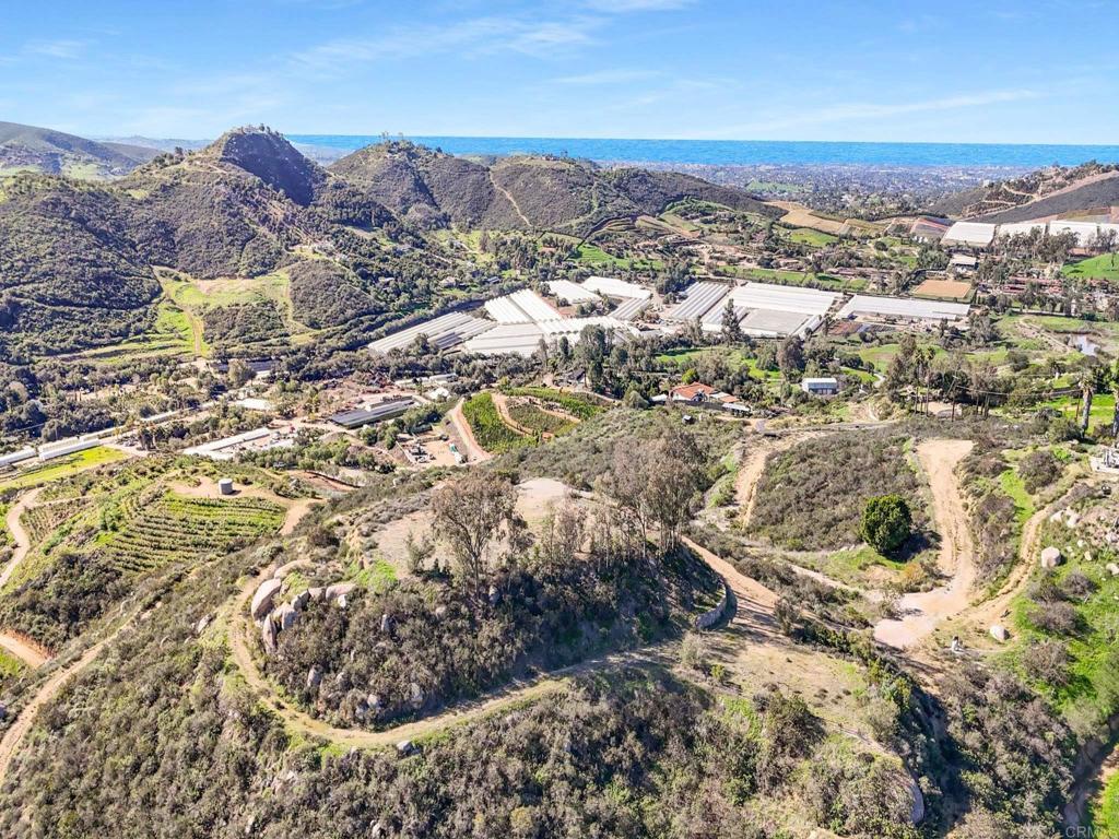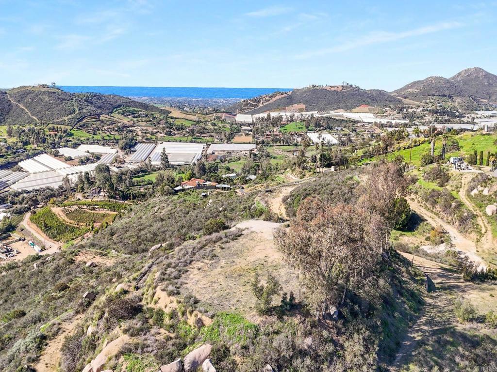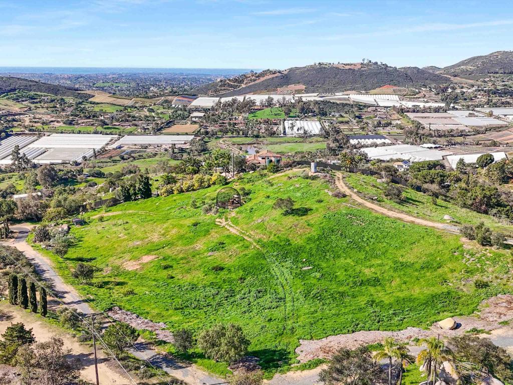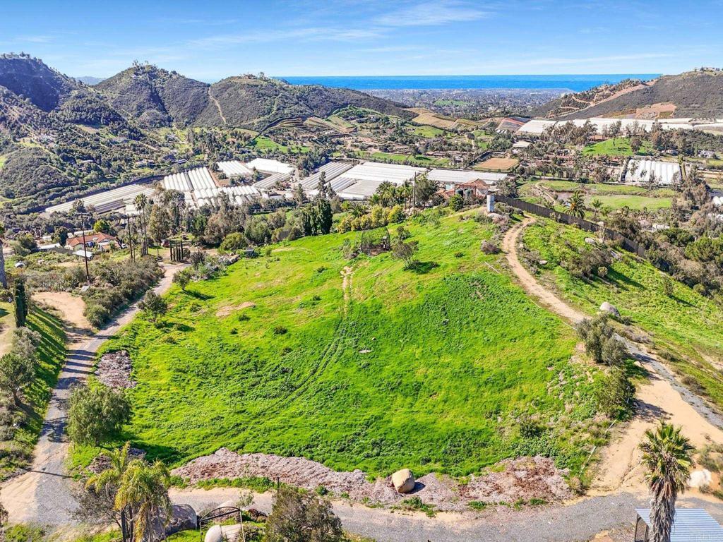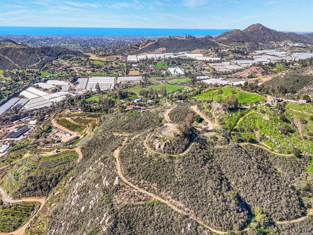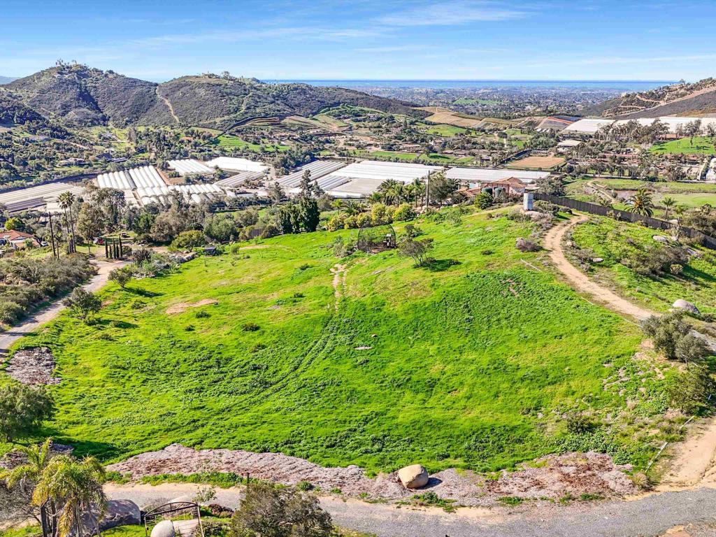 Perched atop the rolling hills of San Marcos, this extraordinary mountaintop property presents a rare chance to own more than 31 acres of ocean-view land with panoramic vistas stretching from the inland valleys to the Pacific. Offering both a 28.72-acre parcel and an additional 3-acre lot, the property is zoned A70 with the sought-after “L” animal designator, allowing for flexible agricultural and residential uses. Set at approximately 1,175 feet in elevation, the land enjoys uninterrupted 360-degree views, remarkable privacy, and exceptional development potential. County guidelines allowing for 4-acre minimum lot splits create the opportunity to build up to seven custom homes, opening the door for developers, multigenerational buyers, homesteaders, or investors seeking a long-term land hold in one of San Marcos’ most desirable growth corridors. More than $1 million in infrastructure has already been completed, including a producing private well with a booster pump, two water meters, two electric meters, recently paved access roads, three possible entry points, and multiple flat building pads oriented to capture sweeping views. The property is surrounded by upscale estates, boutique agricultural operations, and peaceful rural retreats, making it a prime location for luxury development, a private family compound, or a self-sustaining homestead.