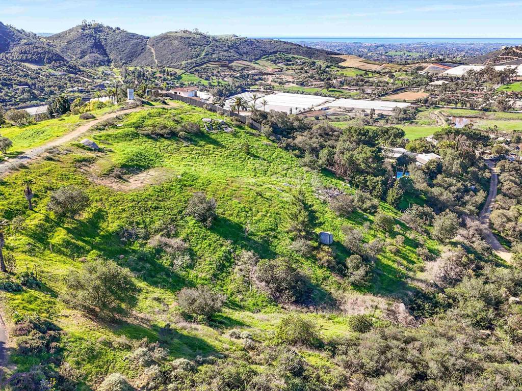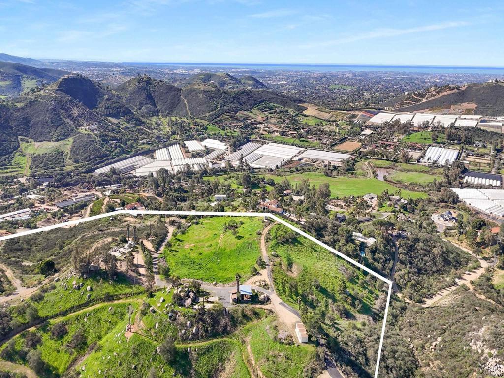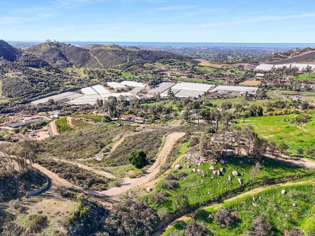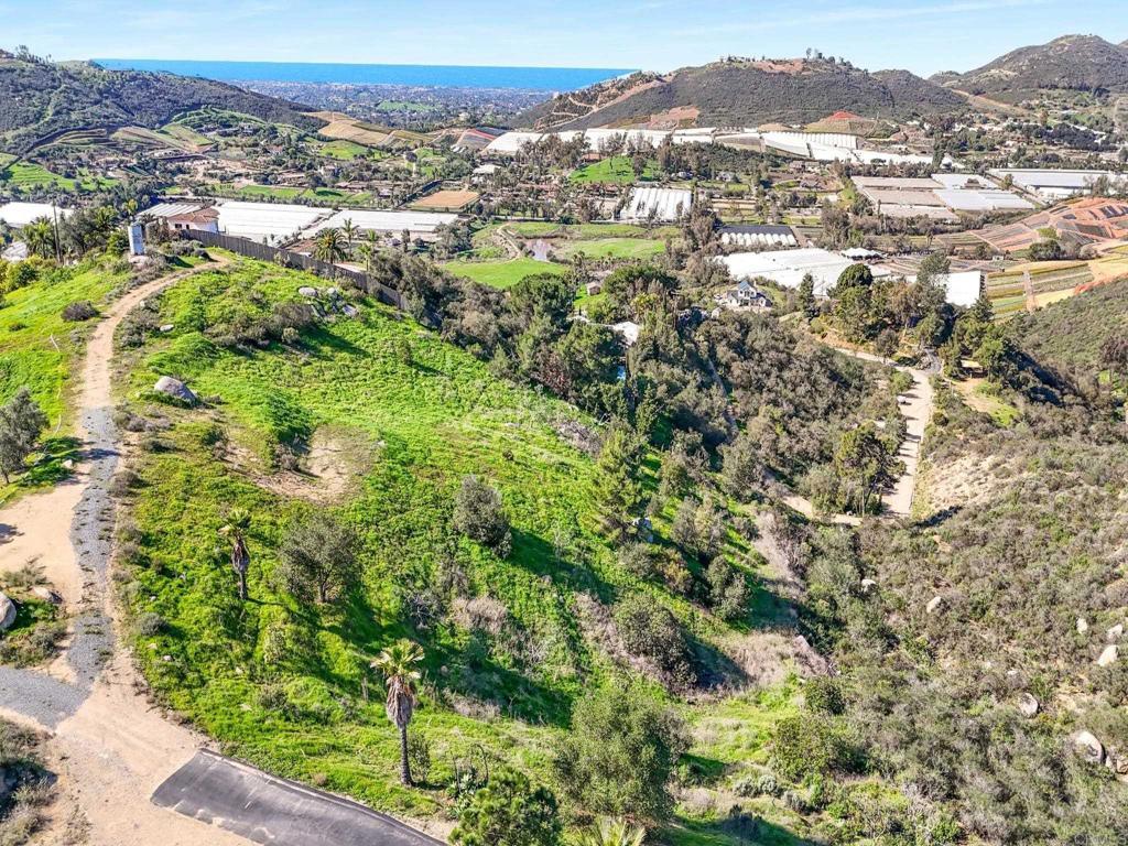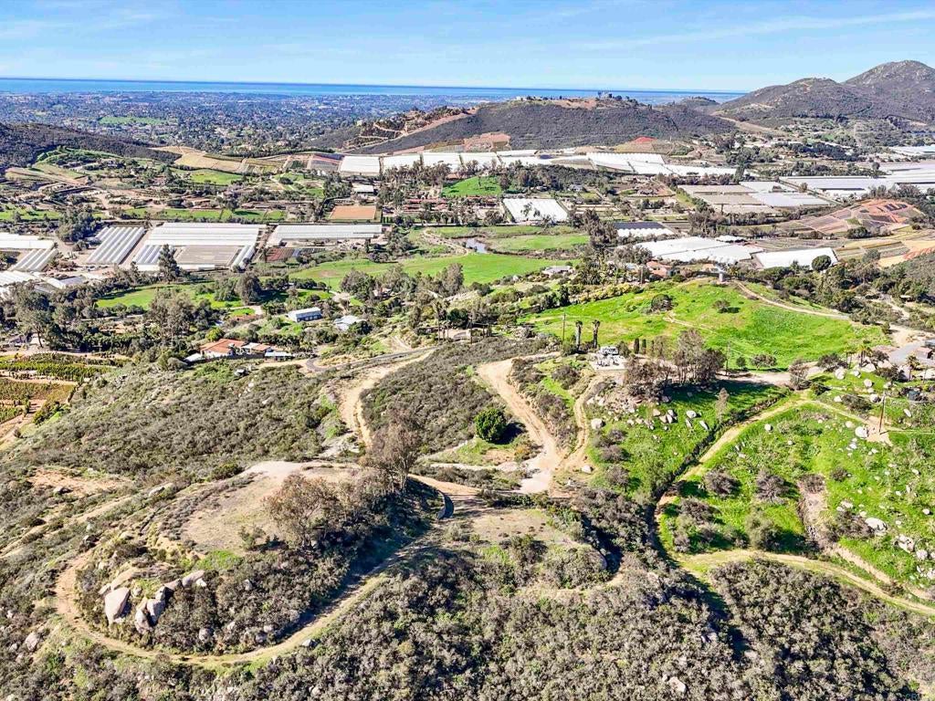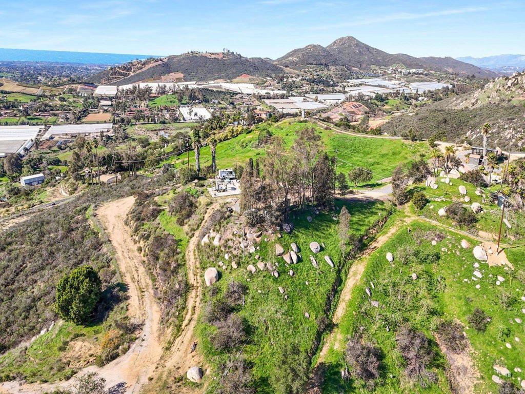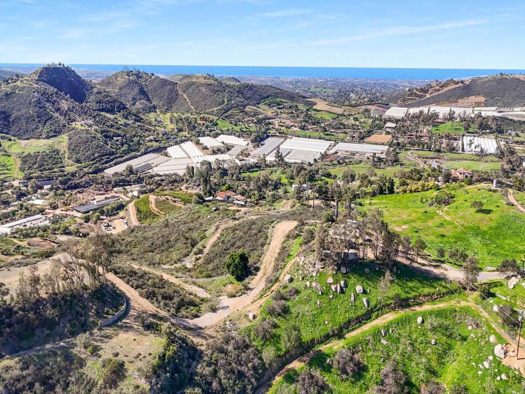Perched atop the rolling hills of San Marcos, this extraordinary mountaintop property presents a rare chance to own more than 31 acres of ocean-view land with panoramic vistas stretching from the inland valleys to the Pacific. Offering both a 28.72-acre parcel and an additional 3-acre lot, the property is zoned A70 with the sought-after “L” animal designator, allowing for flexible agricultural and residential uses. Set at approximately 1,175 feet in elevation, the land enjoys uninterrupted 360-degree views, remarkable privacy, and exceptional development potential. County guidelines allowing for 4-acre minimum lot splits create the opportunity to build up to seven custom homes, opening the door for developers, multigenerational buyers, homesteaders, or investors seeking a long-term land hold in one of San Marcos’ most desirable growth corridors. More than $1 million in infrastructure has already been completed, including a producing private well with a booster pump, two water meters, two electric meters, recently paved access roads, three possible entry points, and multiple flat building pads oriented to capture sweeping views. The property is surrounded by upscale estates, boutique agricultural operations, and peaceful rural retreats, making it a prime location for luxury development, a private family compound, or a self-sustaining homestead.