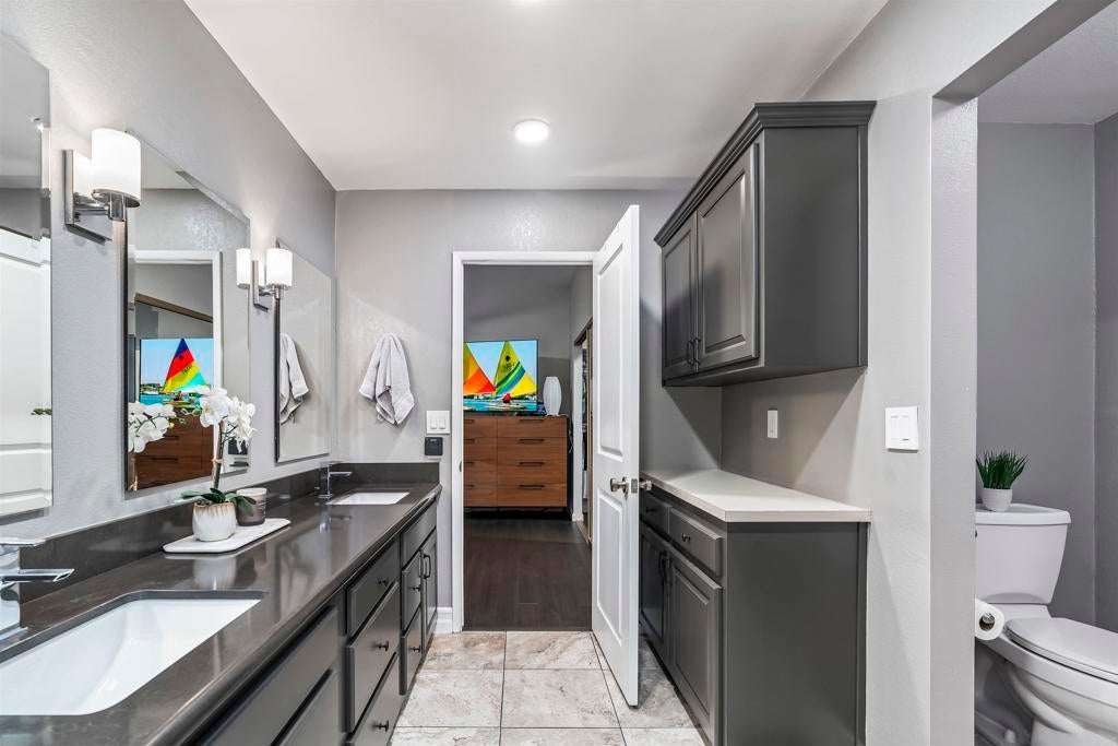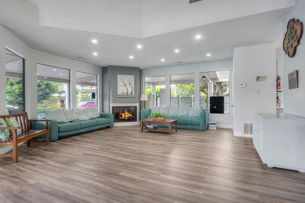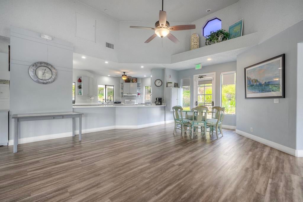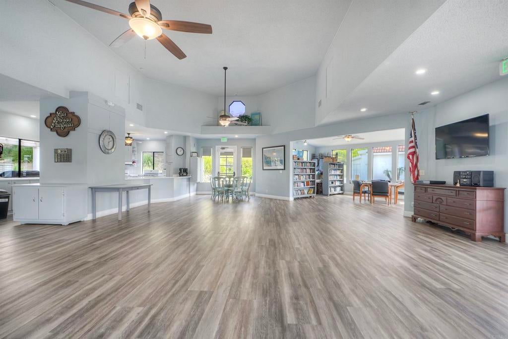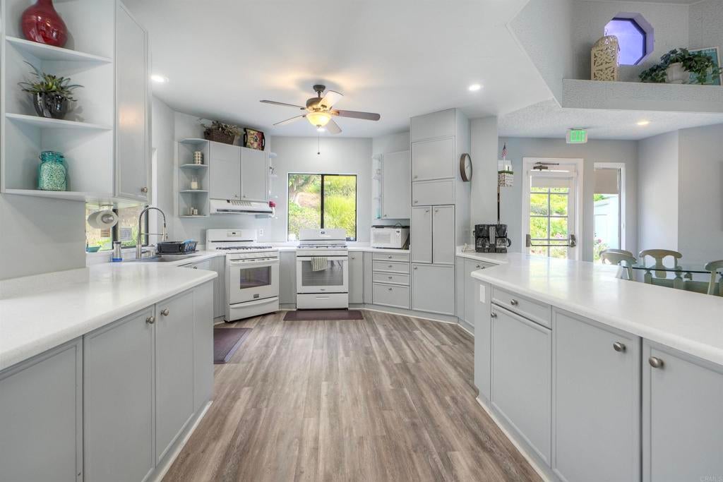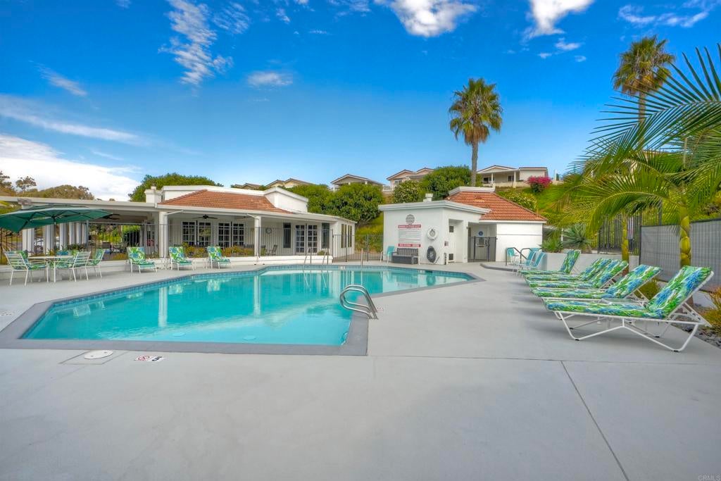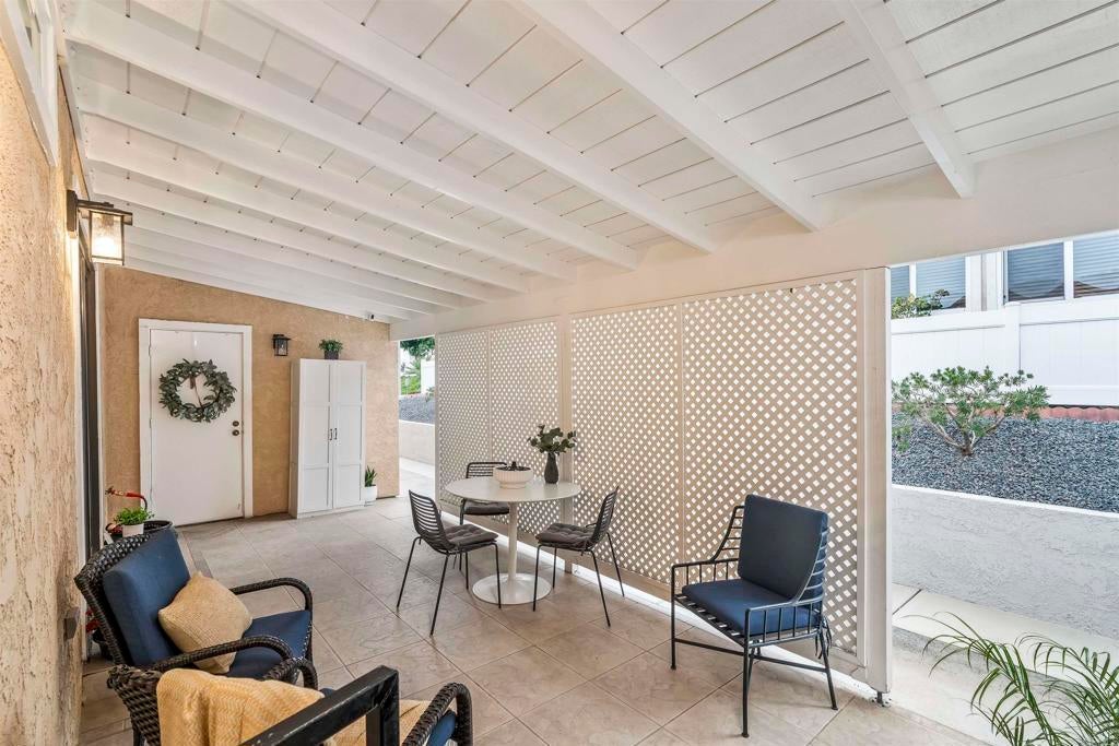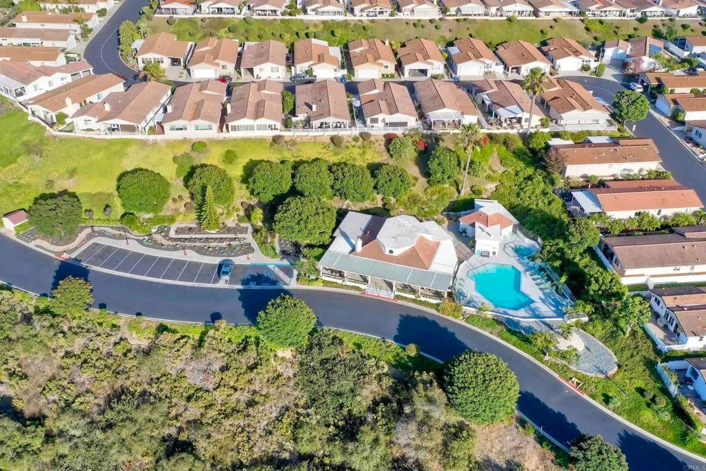Delightful !! Charming!! Remodeled kitchen boasting high end appliances, quartz counter tops, eat in kitchen area* Amazing wood flooring* Dual pane windows accompanied by modern/conventional window treatments* Plantation shutters* Garden windows reveal the unique immaculate custom patio*Bull built in barbeque for entertaining enjoying this private yard* Pet friendly backyard enclosed for pet safety and charm*Newer HVAC* Surround sound*remodeled bathrooms with quartz counter tops*High end security screen door* Custom concrete surround the property*Spacious Primary suite with large walk in closet* 2 car garage with plenty of storage*Low maintenance yard*6 miles to the ocean*ocean breezes*close to restaurants, medical, Bressi ranch, restaurant row remodel with outdoor dining*Gated senior community*Immaculate price of ownership!