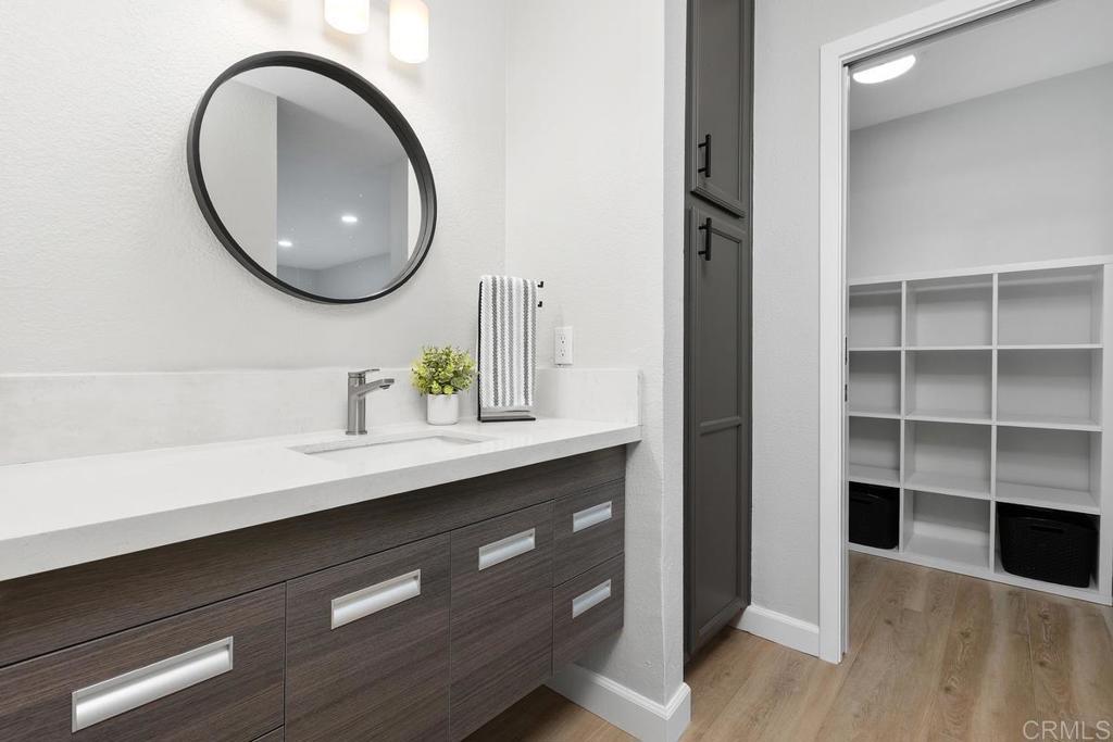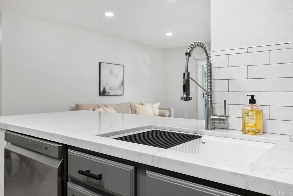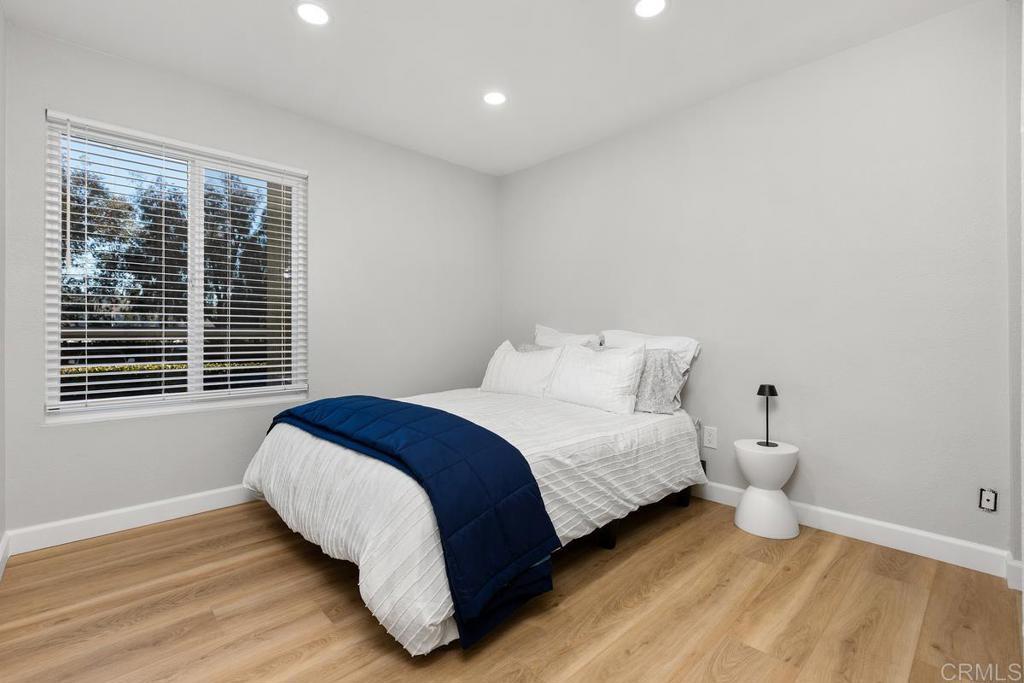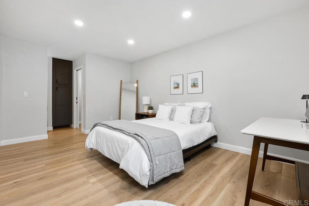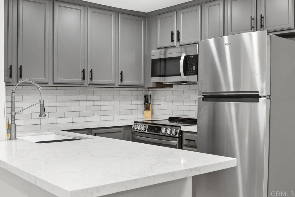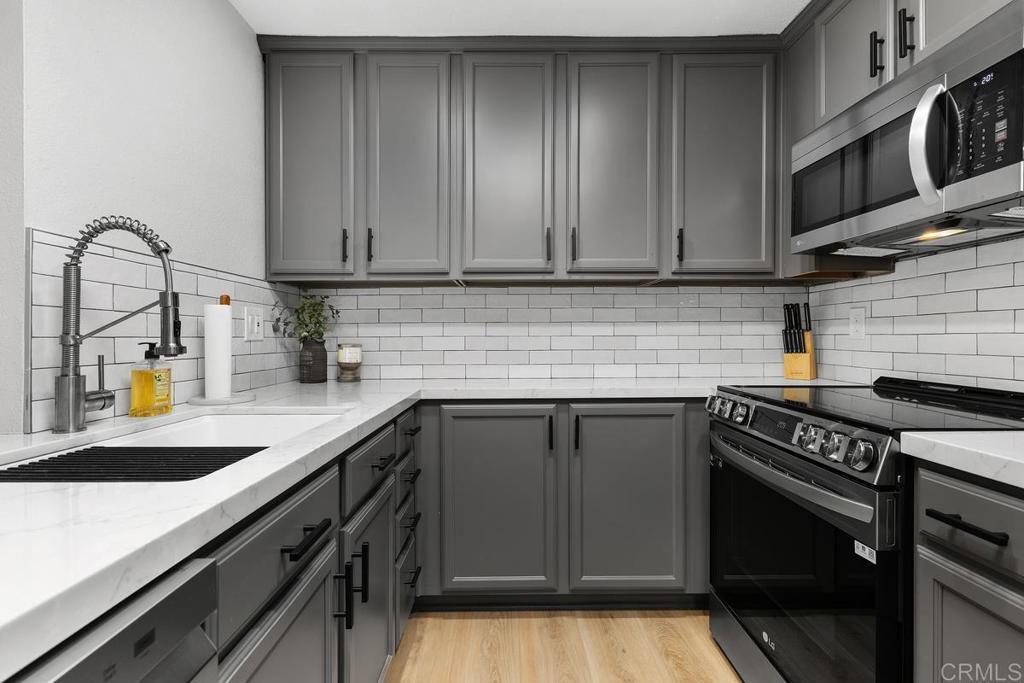 Gorgeous and remodeled 2-bedroom, 1.25-bath condo. Stunning wide-plank LVP flooring flows throughout, tying together a soft, neutral paint palette, smooth ceilings, and recessed lighting with dimmer switches. The kitchen is updated with quartz countertops, refinished cabinetry, deep single-basin sink with a tall pull-down faucet, stainless steel appliances, and a daily dining bar that opens to the adjacent dining area. Beautifully remodeled bathroom features a floating vanity with a quartz countertop, designer mirror and lighting, a tiled shower surround with a soap niche, a sleek semi-frameless shower door, and upgraded fixtures. Spacious primary bedroom has its own private vanity area, adding the convenience of a dedicated dressing space, including a large linen cabinet for extra storage. The primary bedroom also offers a large walk-in closet. The secondary bedroom completes the floor plan. Additional features include new wall heaters, pocket doors throughout that have been added to maximize space and functionality, new dual-pane windows plus an 8-foot slider, smart front door with privacy glass that shifts from frosted to clear at the touch of a button and keyless fingerprint entry for effortless coming and going. Large private patio extends your living space outdoors and includes a walk-in storage closet. Gated community offers a pool, spa, barbecue area, and beautifully landscaped green spaces with mature trees throughout. Conveniently located near shopping, restaurants, freeways and the beach.