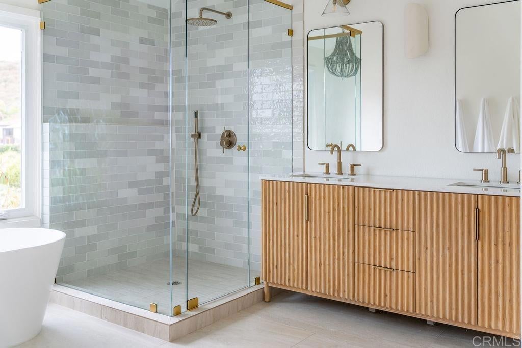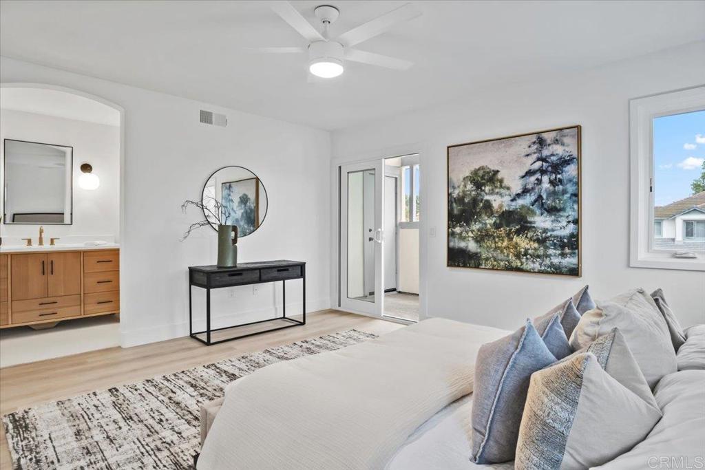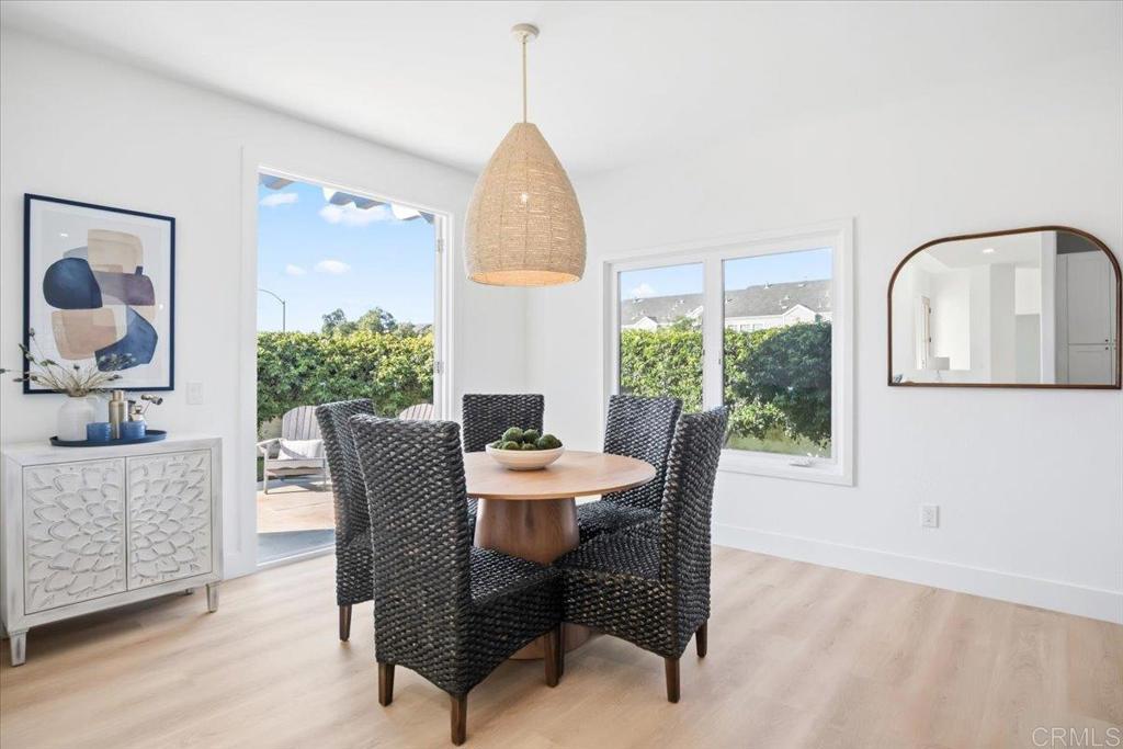 Step into this stunning, fully remodeled home in the exclusive, gated enclave of Laguna Shores-just 26 residences nestled in a private cul-de-sac. This home is bathed in natural light and showcases serene views of the Agua Hedionda Lagoon and Carlsbad hills. Renovated by San Diego design-build firm Rice Interiors, you'll find a thoughtfully reimagined interior featuring an open, airy layout with dramatic volume ceilings, skylights and transom windows. The brand new kitchen, with two-tone white and oak cabinets, zellige tile, large island, custom range hood and all new LG appliances, is a showstopper- all three bathrooms have been beautifully redesigned with modern vanities, Delta plumbing and natural tile. Luxury flooring throughout complemented by upgraded Milgard windows and doors. This versatile floor plan includes a spacious bedroom and bath on main level while upstairs boasts dual primary suites with spa-inspired bathrooms. This is a rare opportunity to own a fully remodeled home and enjoy all the many amenities that this wonderful coastal community has to offer!