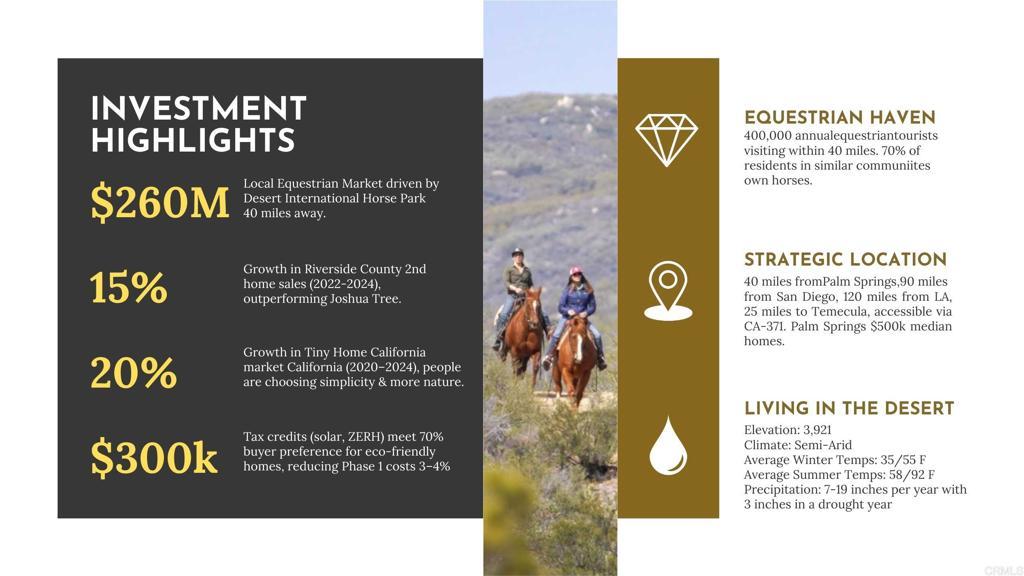 Imagine owning land that doesn’t just change your address… it changes your nervous system in the best way possible. Welcome to Thomas Mountain Ranch a rare opportunity to claim 2 acres of peace, freedom, and possibility inside one of Southern California’s most breathtaking gated communities. This is where the American Dream evolves. With as little as 5% down, you can build the life you’ve been visualizing: • A tiny home sanctuary • A modern modular or barndominium • A custom estate with room to expand • A second home, ADU, or long-term investment • Or simply secure the land now and build later (Yes there are lowdown financing options just to purchase the land.) • One-time close construction loans available • Land + build included • No payments until the home is complete • Some of the lowest rates available Many describe Thomas Mountain Ranch as the next Palm Springs of Riverside County only quieter, greener, and with better weather. This is equestrian and agricultural living at its finest. Grow your own food. Ride your horses at sunrise. Walk trails that calm your mind. Breathe air that reminds you who you really are. You truly have to experience it to understand the magic. Picture yourself waking up on land where every inch radiates intention, tranquility, and love a community carefully cultivated for those who value nature, privacy, and expansive living. Thomas Mountain Ranch spans 256 acres, including • 155 acres of shared HOA open space • 1/46 deeded ownership interest • Miles of hiking, biking, and horseback riding trails • Vineyard, gazebo, horse barn, and gathering spaces Starting at just $111,000/Parcel for 30 improved 2-acre lots, this is one of the most attainable ways to step into a luxury land lifestyle in Southern California. Every detail has been thoughtfully planned: • Panoramic mountain views from every lot • High-speed fiber-optic internet • Pre-installed electrical terminal cans every 500 feet (a $50,000+ value per lot) • Paved roads and gated security • Professional tennis & pickleball courts • HOA bathrooms, lush landscaping, and millions invested into infrastructure 36750 Upper Valley Rd, Anza, CA Perfectly positioned: • 22 miles to Idyllwild • 30 miles to Temecula Wine Country • 30 miles to Palm Desert • 41 miles to Palm Springs • 5 miles to Cahuilla Casino Hotel More and more people are choosing peace over pressure, land over congestion, and intentional living over noise. Whether you’re ready to build now or secure a powerful investment for your future Thomas Mountain Ranch is calling the version of you who’s ready for more space, more meaning, and more alignment. Come feel it. Trust what your body tells you. And step into the life you’ve been preparing for. Welcome to Thomas Mountain Ranch ~ where your next chapter begins.