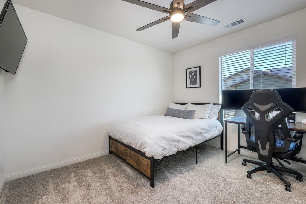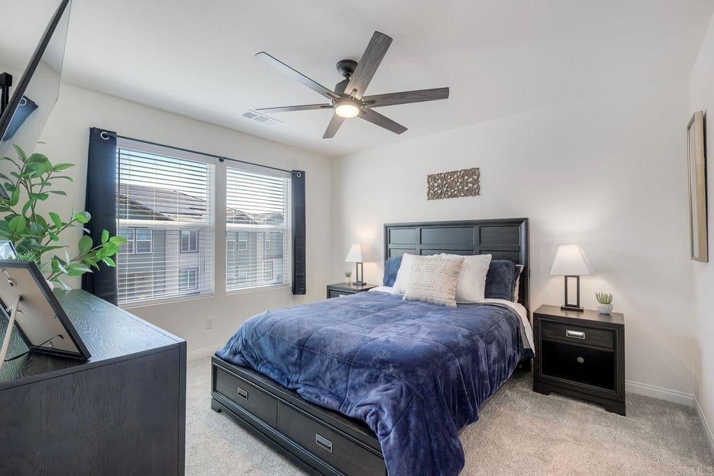 Welcome home to 229 Mission Villas Road, this beautifully maintained, upgraded condo built in 2022 in San Marcos offers a laid back, turn-key lifestyle. Step into the open floor plan with no one above or below, fully owned solar, bonus windows on the main level bring extra sunlight highlighting luxury vinyl plank flooring with upgraded padding, recessed lighting, and a seamless flow from the living and dining areas to your private balcony. Directly off the living room you will find a nicely appointed powder room with pedestal sink. The highly upgraded kitchen includes quartz countertops, under-mount single basin sink and Moen matte black faucet, upgraded cabinets, stainless appliances and custom lighting fixtures as well as touchscreen smart wifi electric range, energy star dishwasher and microwave/hood combo, welcoming you into a space to entertain or just relax on a quiet evening at home. The laundry closet has upgraded additional shelving/cabinets and includes newer stackable washer and dryer and a bonus window in hallway. Relax and unwind in the quiet primary bedroom with walk-in closet, ceiling fan and extended double vanity with cultured marble countertops accented by black matte faucets and yet another bonus window in bathroom. The second bedroom offers a full bath with upgraded faucets and marble countertops. Two car garage with direct access into the home and space for storage. Perfectly located close to shopping, restaurants, easy freeway access, Sprinter train station, Cal State San Marcos and Palomar College, and so much more! Ammenities include Bocce Ball, dog run, playground and BBQ area.