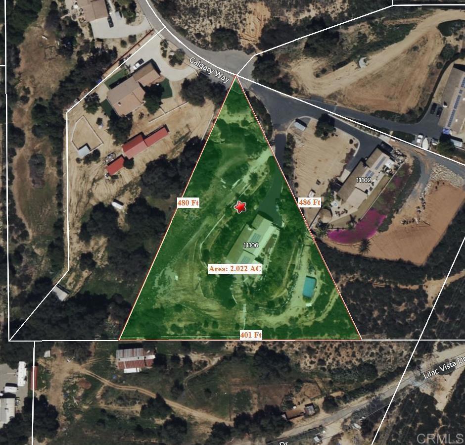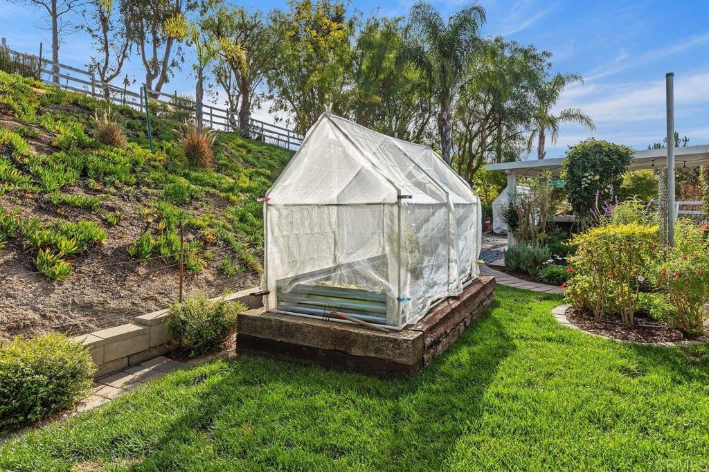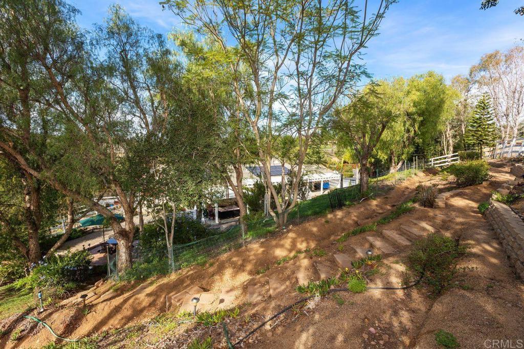 Welcome to Heritage Park Estates - an enclave of 13 custom built homes in Valley Center just minutes from the 15 freeway. This single story home sits on 2 acres and is located at the end of a cul-de-sac with beautiful mountain views. The home offers just over 1900 sq ft of comfortable living space and features 3 bedrooms plus a den, 2 full bathrooms, a living room, kitchen, and separate dining room. The living room offers vaulted ceilings and a cozy, stacked-stone fireplace. The spacious den makes the perfect office, library, craft room, or could be converted into a 4th bedroom. The primary bedroom features an oversized ensuite bathroom with double door entry, walk-in shower, soaking tub, a vanity with dual sinks, and a walk-in closet. The 3 tiered lot offers flexibility and creativity for usage. The main yard surrounding the house feels private and serene with a large covered back patio, multiple raised garden beds framed for year-round use, approx 26 fruit trees including tangerine, Valencia orange, navel orange, apple, lemon, plum, peach, apricot, lime, tangelo, and mulberry. There is also a 5 barrel rain collection system to help save on water bills. There are steps up to the top tier which currently has an above ground pool but is also a perfect spot for an ADU. The lower level is fully fenced and has a gravel driveway for parking an RV or additional vehicles. The lower section also contains an open space easement. The home has 24 solar panels with a low monthly payment of $159/mo with only 10 years left on a 20 year lease. There are also 2 sheds on the property ideal for extra storage. All this and no HOA! If peace and quiet and beautiful views are what you are looking, while still being close to everything, 11106 Calgary Way is the perfect address to call home!