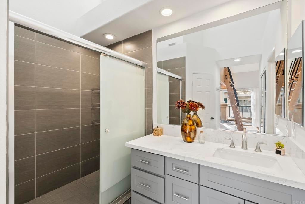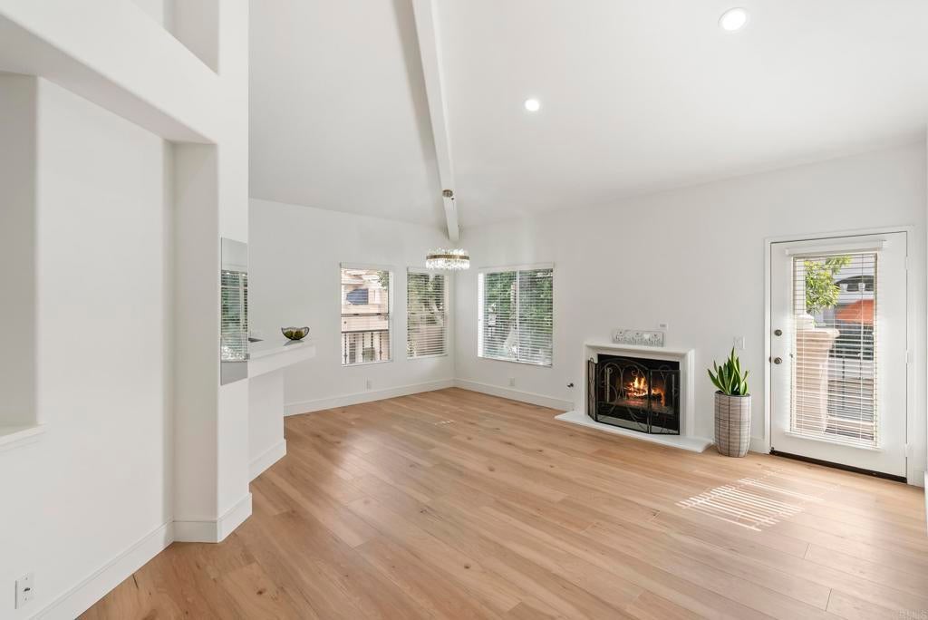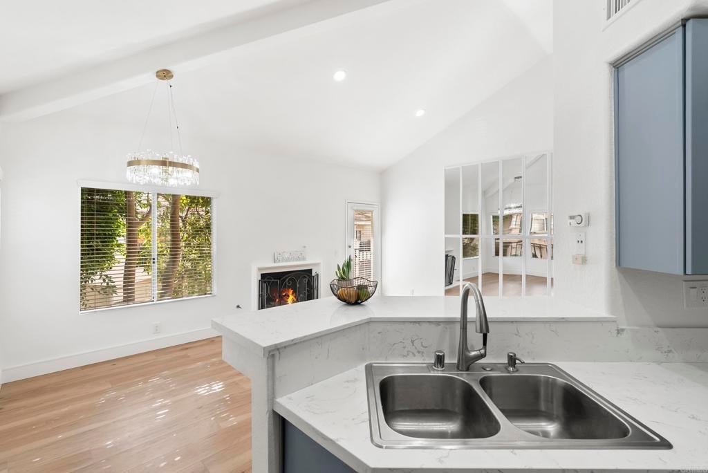 Great opportunity to reside in Renaissance, one of the most desireable communities of University City. This is where you want to be! Walking distance to Nobel Athletic Center & Recreational park, the library, the famous UTC mall and trolley line. This upper level, END UNIT in the Capri complex has beautiful upgrades starting with the gorgeous LVP flooring from the stairway up (NO carpet throughout!) to a modern open kitchen. The high ceilings with many windows makes it feel so spacious throughout. From the instant you walk up the stairs and see the NEW designer chandelier, your main living room has a gas fireplace with the dining room adjacent offering a seamless design. The functional layout offers an open kitchen with quartz counter tops, modern bluish-grey cabinets and a roomy pantry space. In addition, the full size laundry room is conveniently in the hallway not in the garage. Both bathrooms have a classic tile surround that frames to the top and updated bath vanities. Unit has attached one car garage as well with plenty of storage. Capri offers plenty of guest parking and this unit is steps away from the relaxing pool and spa.