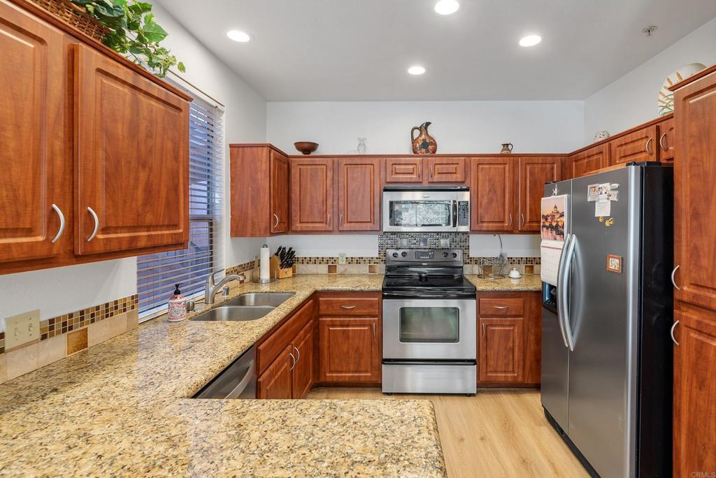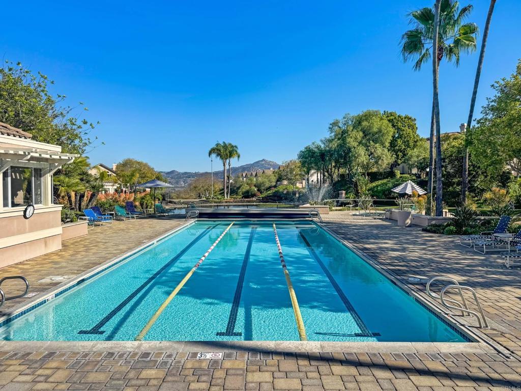 DISCOVER THE BEAUTY BEHIND THE GATES OF VISTA DEL LAGO! One of the best locations-secluded, backing to green space with Battle Mountain views, GARAGE, AND PLENTY OF OPEN PARKING, no adjacent building, south facing living room windows coupled with high ceilings the home is drenched with natural light. This popular open floor plan includes a cozy fireplace, Dual primary suites-walk in closet, upgraded countertops and remodeled walk in shower. One wall of secondary suite has a built in library with a remote controlled bed that comes out of the large lower drawer. Remodeled kitchen with granite countertops and stainless steel appliances including newer 2024 dishwasher. Newer laminate wood tone flooring throughout. Full Size hall closet holds a side by side washer/dryer with cabinets. Spacious covered patio to enjoy the views including a large storage closet. This lower unit has a convenient LARGE garage which provides room for a car and plenty of storage located steps from the patio for easy access for coming and going. Enjoy the multi million dollar premiere recreation facility including 2 pools (one a heated lap), 2 spas, 4 lighted tennis courts - pickleball, exercise room, changing rooms, billiard room, banquet room and more. In addition, Morada residents enjoy their own pool/spa and EV CHARGING station. Part of the distinguished Poway Unified School District, Vista Del Lago is located near the Lake Hodges hiking trails and very close to the San Pasqual vineyards and Westfield's shopping center.