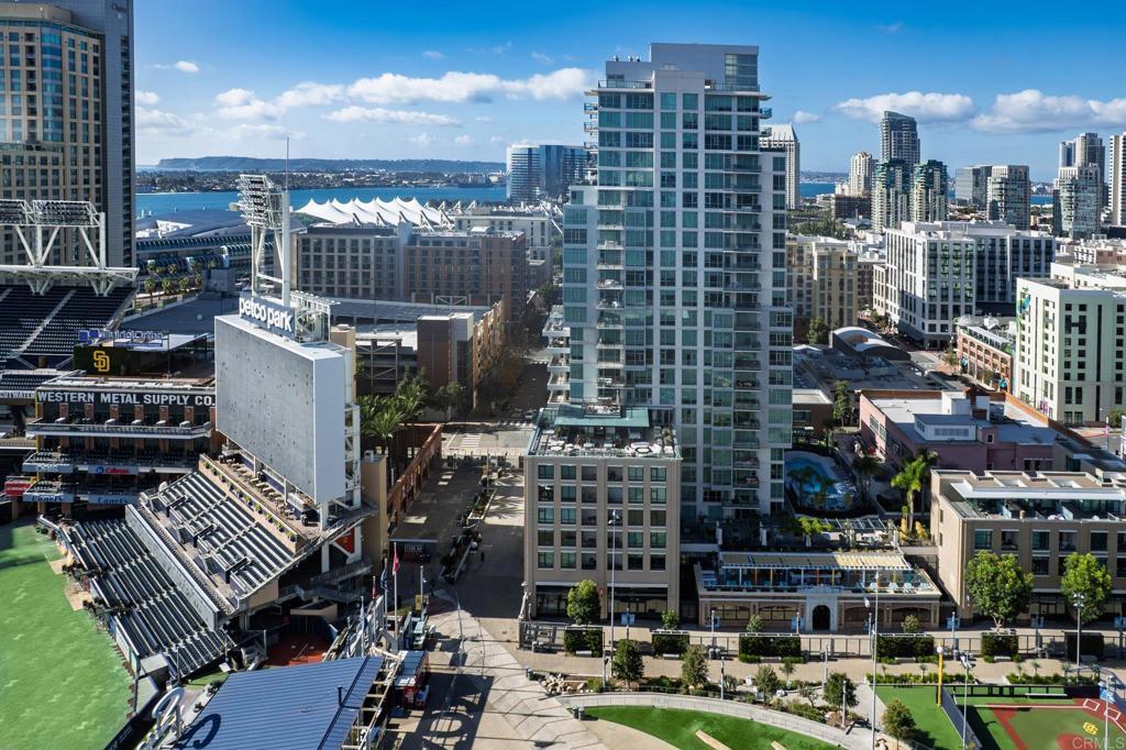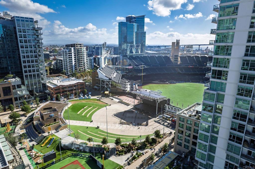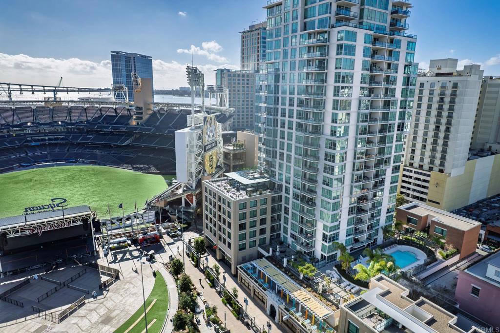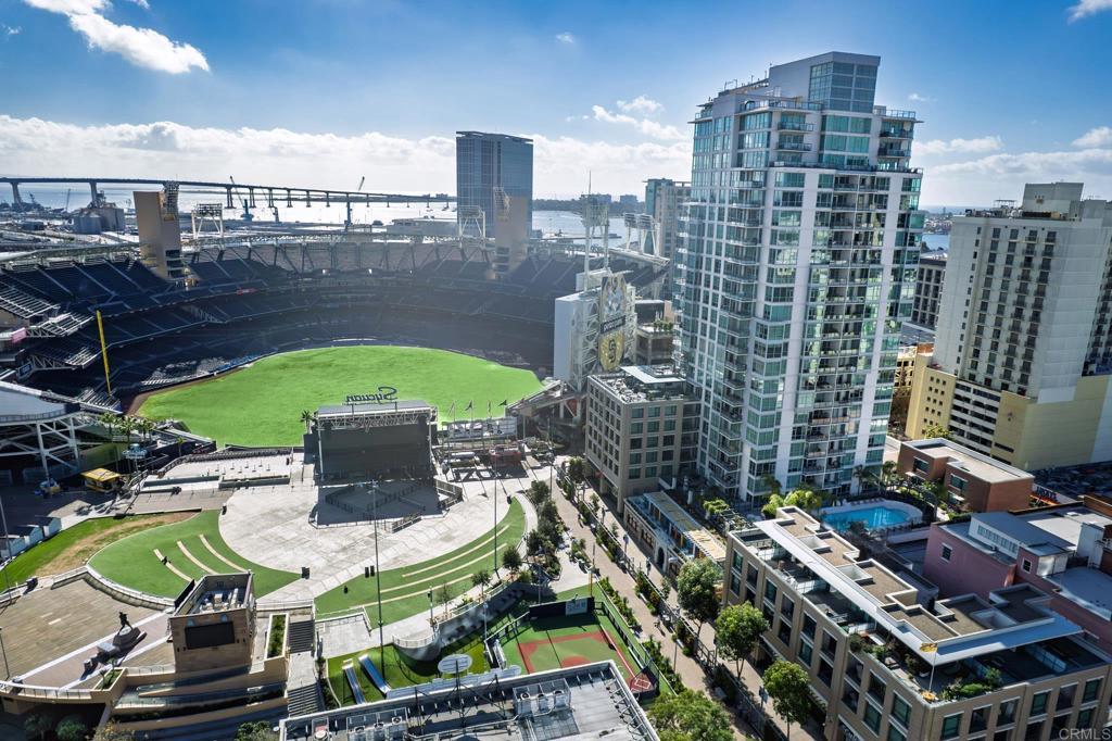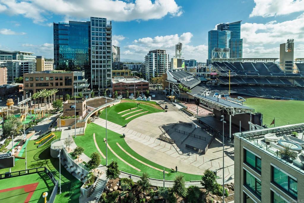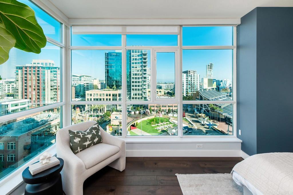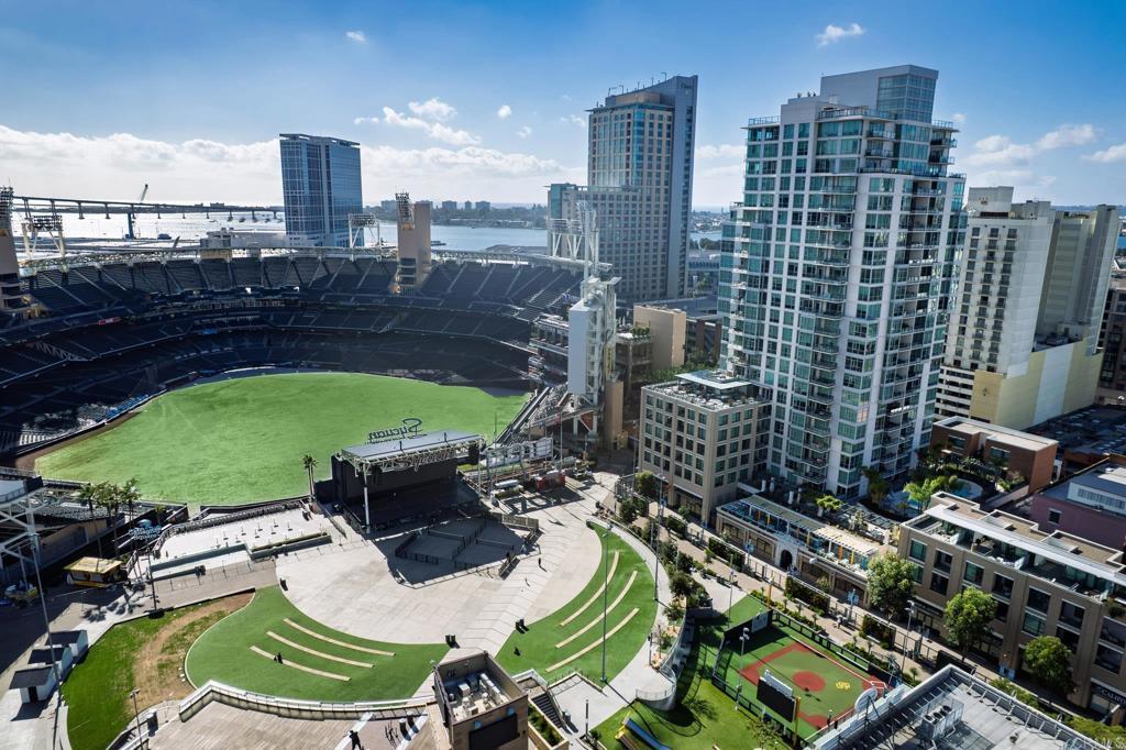 Experience urban living at its finest in this beautifully upgraded 2-bed, 2-bath view condo in The Legend, one of downtown San Diego’s most sought-after residential towers. This spacious residence features one of the building’s larger floor plans, offering generously sized bedrooms and floor-to-ceiling windows that fill the home with natural light. Recently upgraded in August 2024, the unit showcases new engineered maple hardwood floors and a full suite of brand-new kitchen appliances. Thoughtful storage solutions include built-in shelving in both bedroom closets as well as custom shelving in the pantry/laundry area. Enjoy seamless indoor-outdoor living from your private balcony with sweeping open-sky city views, beautiful sunsets over downtown, and a serene outlook over the pool and surrounding greenery. The bedrooms offer unique views of Gallagher Square giving you a prime perspective of Padres games, concerts and so much more. As a resident of The Legend, you’ll have access to exceptional building amenities including the iconic 7th-floor deck overlooking Petco Park, complete with fire pits, grills, TVs, and a clubhouse—perfect for game days and gatherings. Additional amenities include 24/7 security, business-hours concierge, package management/storage, a sparkling pool and hot tub, gym, sauna, steam room, locker rooms, outdoor grilling areas, and inviting common spaces. Petco Park is literally in your backyard, and you’re just two blocks from the Gaslamp Quarter placing the city’s best dining and nightlife at your doorstep. Enjoy easy walks to the Convention Center, the Rady Shell, the San Diego Bay, and Seaport Village with the airport only 15 minutes away. This home combines luxury, comfort, and one of downtown’s most vibrant locations—an ideal residence for those seeking the true San Diego lifestyle.