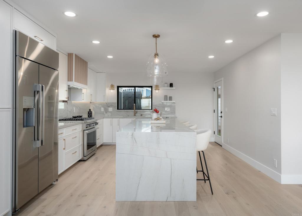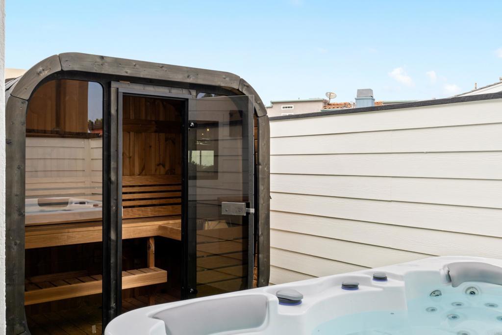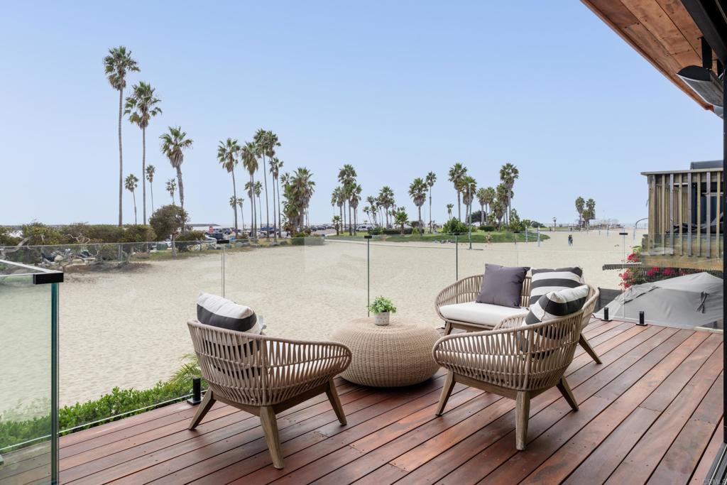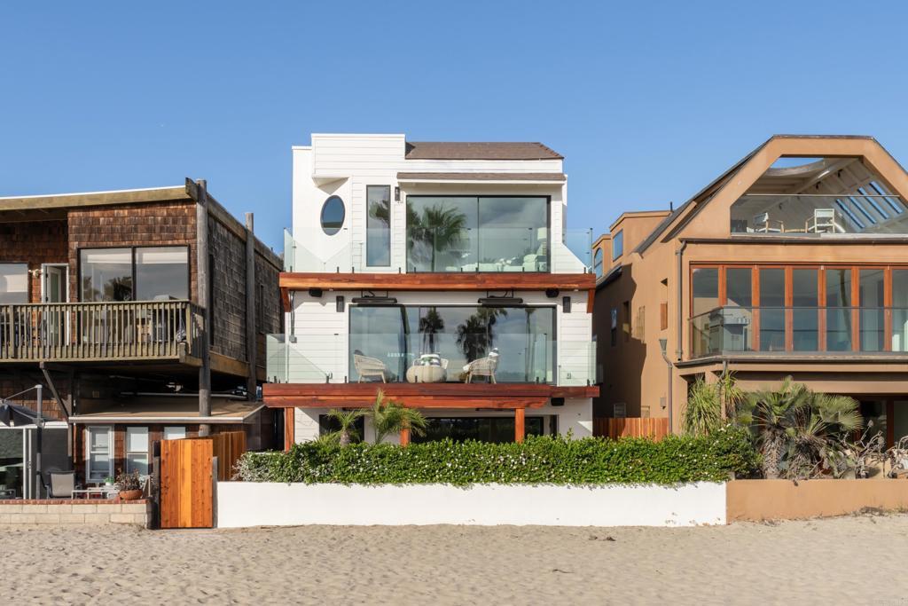 Best deal on Ocean Front Walk! The most private location on Ocean Front Walk! Entertainer's Dream with Expansive Views! This fully remodeled 5-bedroom coastal retreat is the ultimate San Diego beach house. Designed for entertaining, the outdoor spaces feature multiple decks, a spacious patio with Bromic heaters, Sonos speakers, firepit with seating for 10+, a built-in BBQ, and a wellness area complete with hot tub, cold plunge, and sauna. Natural light pours through Fleetwood doors and Marvin windows, framing breathtaking views of Mission Beach, whitewater in Ocean Beach, boats cruising out to sea, and the cliffs of Sunset Cliffs illuminated at night. The main level boasts open-concept living with a custom kitchen featuring quartzite countertops, wood shaker cabinetry, Dacor appliances, wet bar, and seamless indoor-outdoor flow to the deck. Upstairs, the private primary retreat offers dual closets, a spa-like bath with marble finishes, and panoramic ocean vistas. Two additional bedrooms share their own bath with marble countertops and enjoy access to an east-facing deck for sunrise views. Downstairs, a secondary living/game room with wet bar provides additional entertaining space, along with two more bedrooms and a full bathroom. Newly laid pavers surround the property, creating a clean and modern coastal vibe. Parking for 3 cars included. This home is a rare opportunity to own a luxury entertainer's paradise in one of San Diego's most iconic beach communities.