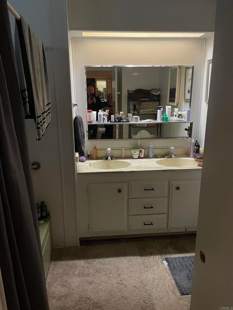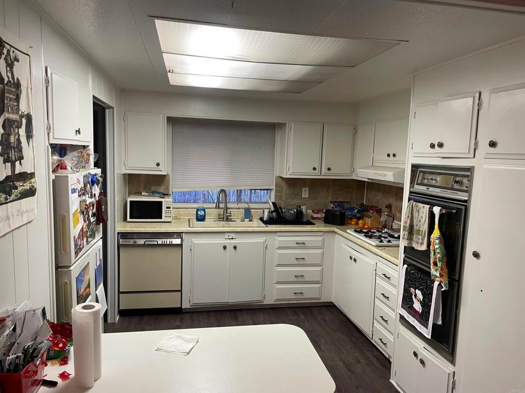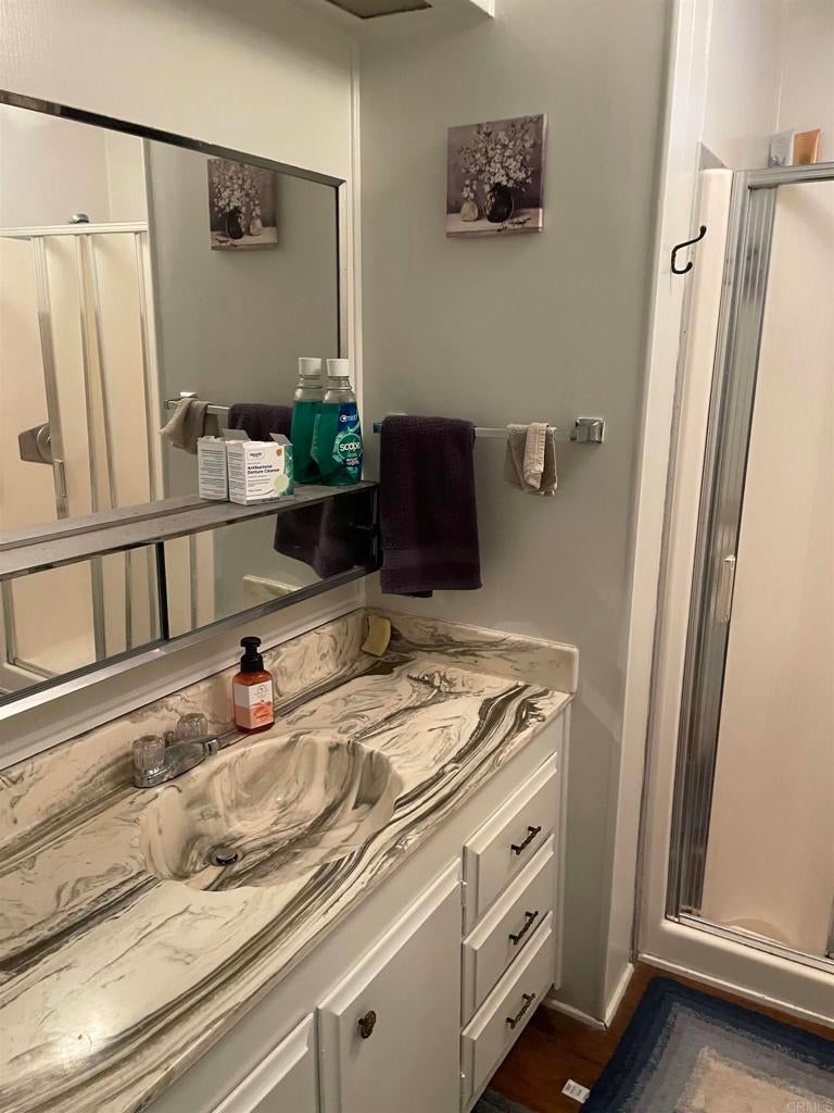 Corner lot conveniently located near guest parking and just a short distance from the community clubhouse, pool, spa and other amenities and activities. The large Primary Bedroom has an ensuite bathroom with double sinks and has been modified to have it's own private entrance in case you wish to have a roommate or caregiver. New floors in kitchen and hall, recently painted in and out, new privacy fence, wheel chair ramp, and a wide hallway make this home more handicap accessible. Breakfast bar in Kitchen. Covered porch with views of the city, hills & mountains. Located in a 55+ community with a clubhouse, pool, spa, billiards, library, shuffle board, ample guest parking and other amenities & activities! Close distance to Stater Brothers grocery store, Walgreens (Rx), Walmart (Rx), Target (Rx), dining, animal vet and more! Also convenient freeway access to highway 78! Monthly space rent will be $1,450.