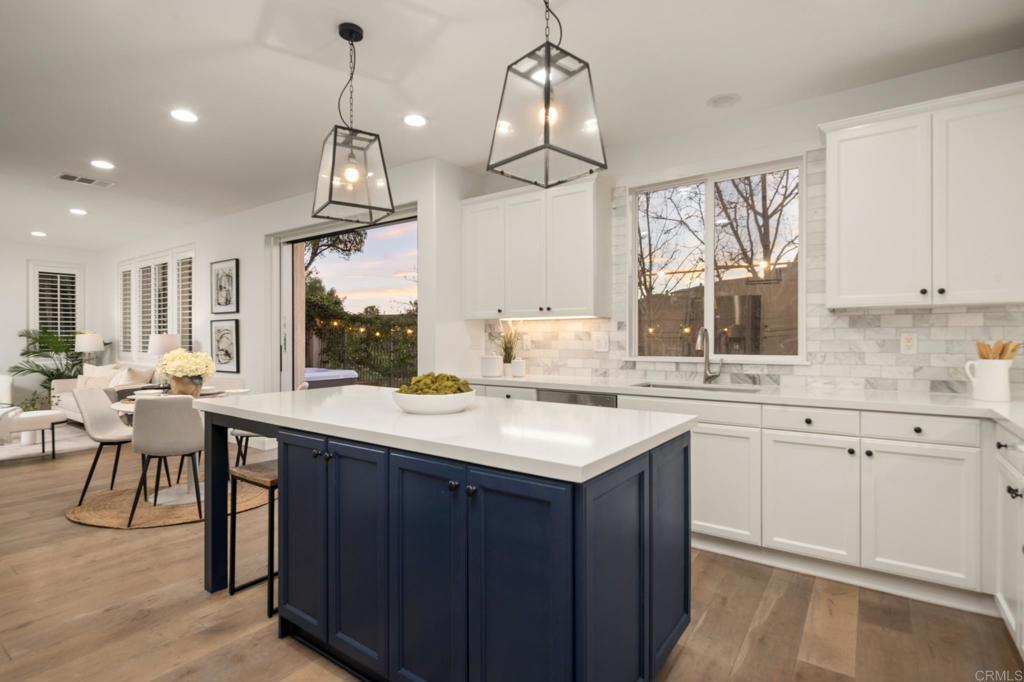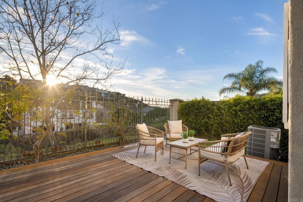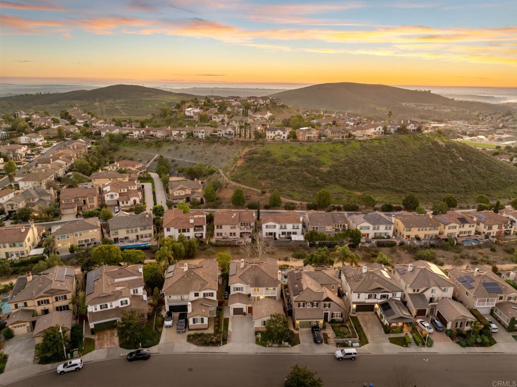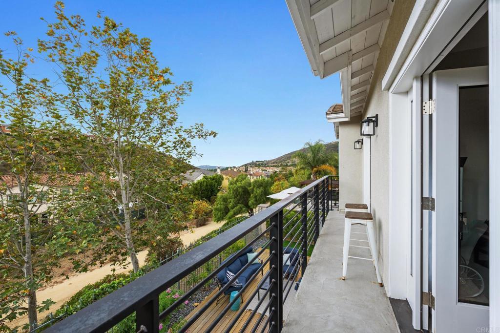 Beautiful home with modern upgrades, sunset & ocean views on popular cul-de-sac street! This turn-key 4-bedroom home plus a large loft/media room or optional 5th bedroom with a custom view deck offers 2,852 sq. ft. of thoughtful design, modern finishes, and privacy. This energy-efficient home features owned solar, NEW tankless water heater, newer dual A/C, E/V car changer, smart thermostats and a low maintenance yard with artificial turf. Step inside to gorgeous European white oak hardwood flooring, custom wood stairs with a contemporary design, and an open layout enhanced by La Cantina pocket doors that create seamless flow to the backyard and California indoor/outdoor living. The open living room/dining room with fireplace leads to a beautiful kitchen at the heart of the home. The updated kitchen shines with quartz counters, marble subway tile backsplash, center island with seating, Bosch dishwasher, double oven, butler’s pantry and a built-in bar area perfect for hosting. The family room features a custom media center and a fireplace. Upstairs, the permitted loft is a standout space —with French doors that open to a custom deck extending to the primary retreat with it's own French doors (perfect for office.) On the main level, there’s a bedroom and full bathroom with shower and upstairs there are 3 additional bedrooms including a spacious primary suite with a retreat/office featuring French doors and ensuite bathroom with dual vanities (new quartz countertops and flooring), shower and soaking bathtub and a hallway bathroom - also with new quartz countertops and flooring. Step outside to your private, refreshed backyard featuring turf, an Ipe deck, and a spa with decking — the perfect setting for sunset watching and enjoying coastal breezes. This home offers beautiful curb appeal with updated paint, custom front door and wooden gate, plus a 3-car garage with storage (room for all your toys) and a welcoming private front courtyard with tropical landscaping. Also has shutters, custom lighting, and an upstairs laundry room. New paint throughout! Located in Crestview, only steps from Questhaven park - leave your car at home with trail access to top-rated schools and San Elijo Hills’ unique town center with shopping, restaurants, craft brewery, and 18 miles of hiking and biking trails!