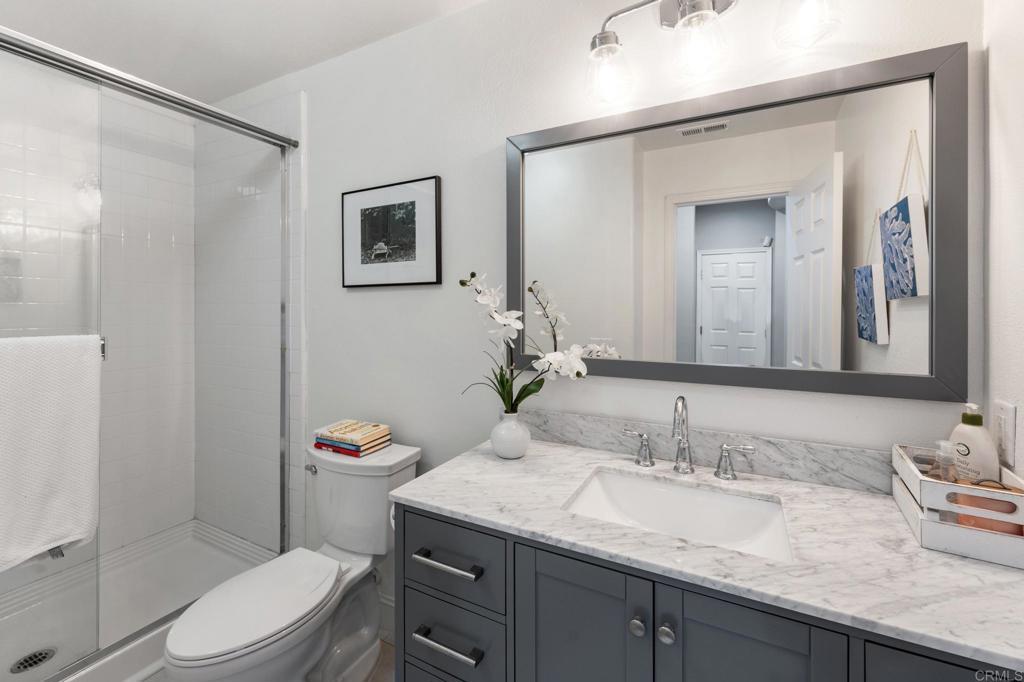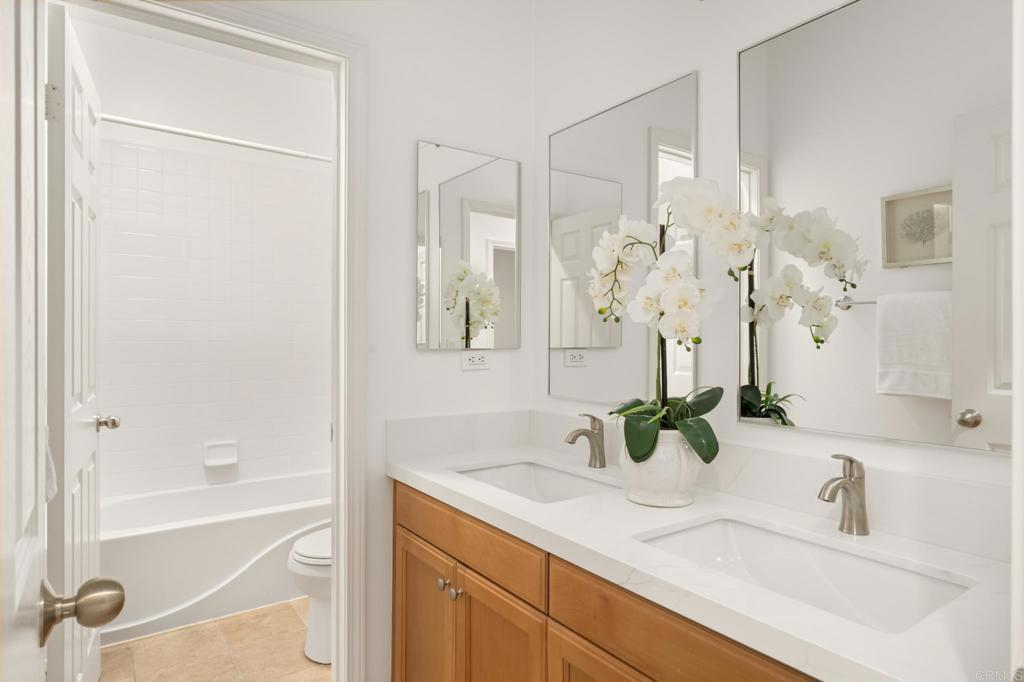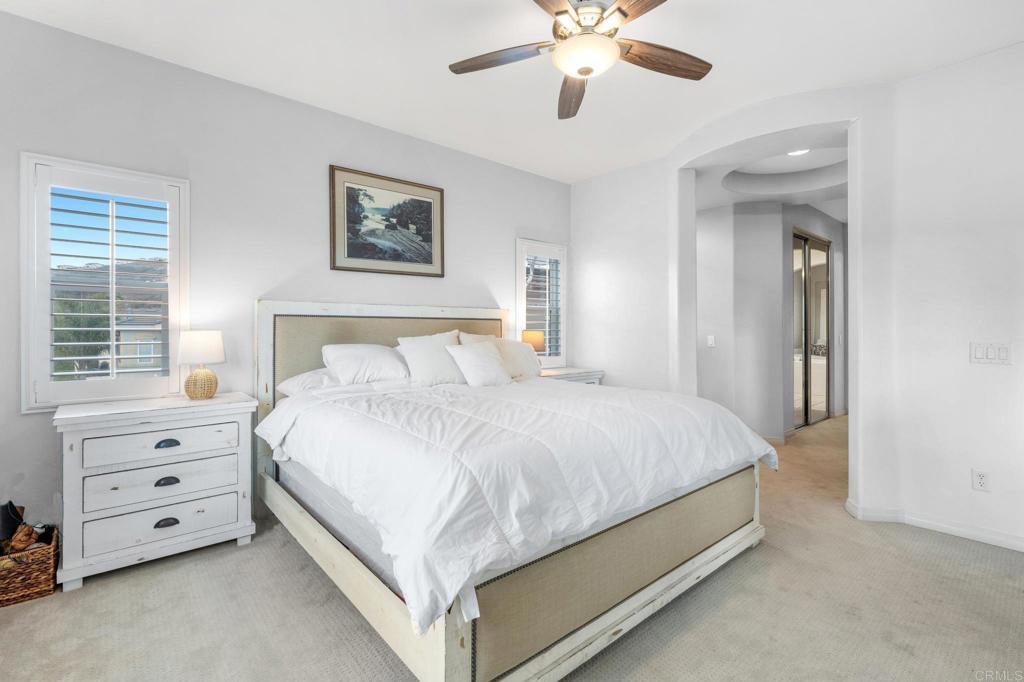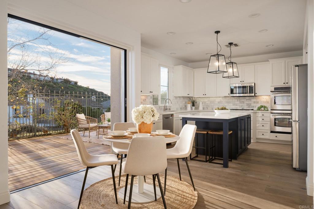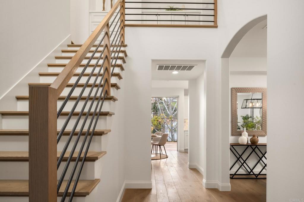 Beautiful home with modern upgrades, sunset & ocean views on popular cul-de-sac street! This turn-key 4-bedroom home plus a large loft/media room or optional 5th bedroom with a custom view deck offers 2,852 sq. ft. of thoughtful design, modern finishes, and privacy. This energy-efficient home features owned solar, NEW tankless water heater, newer dual A/C, E/V car changer, smart thermostats and a low maintenance yard with artificial turf. Step inside to gorgeous European white oak hardwood flooring, custom wood stairs with a contemporary design, and an open layout enhanced by La Cantina pocket doors that create seamless flow to the backyard and California indoor/outdoor living. The open living room/dining room with fireplace leads to a beautiful kitchen at the heart of the home. The updated kitchen shines with quartz counters, marble subway tile backsplash, center island with seating, Bosch dishwasher, double oven, butler’s pantry and a built-in bar area perfect for hosting. The family room features a custom media center and a fireplace. Upstairs, the permitted loft is a standout space —with French doors that open to a custom deck extending to the primary retreat with it's own French doors (perfect for office.) On the main level, there’s a bedroom and full bathroom with shower and upstairs there are 3 additional bedrooms including a spacious primary suite with a retreat/office featuring French doors and ensuite bathroom with dual vanities (new quartz countertops and flooring), shower and soaking bathtub and a hallway bathroom - also with new quartz countertops and flooring. Step outside to your private, refreshed backyard featuring turf, an Ipe deck, and a spa with decking — the perfect setting for sunset watching and enjoying coastal breezes. This home offers beautiful curb appeal with updated paint, custom front door and wooden gate, plus a 3-car garage with storage (room for all your toys) and a welcoming private front courtyard with tropical landscaping. Also has shutters, custom lighting, and an upstairs laundry room. New paint throughout! Located in Crestview, only steps from Questhaven park - leave your car at home with trail access to top-rated schools and San Elijo Hills’ unique town center with shopping, restaurants, craft brewery, and 18 miles of hiking and biking trails!