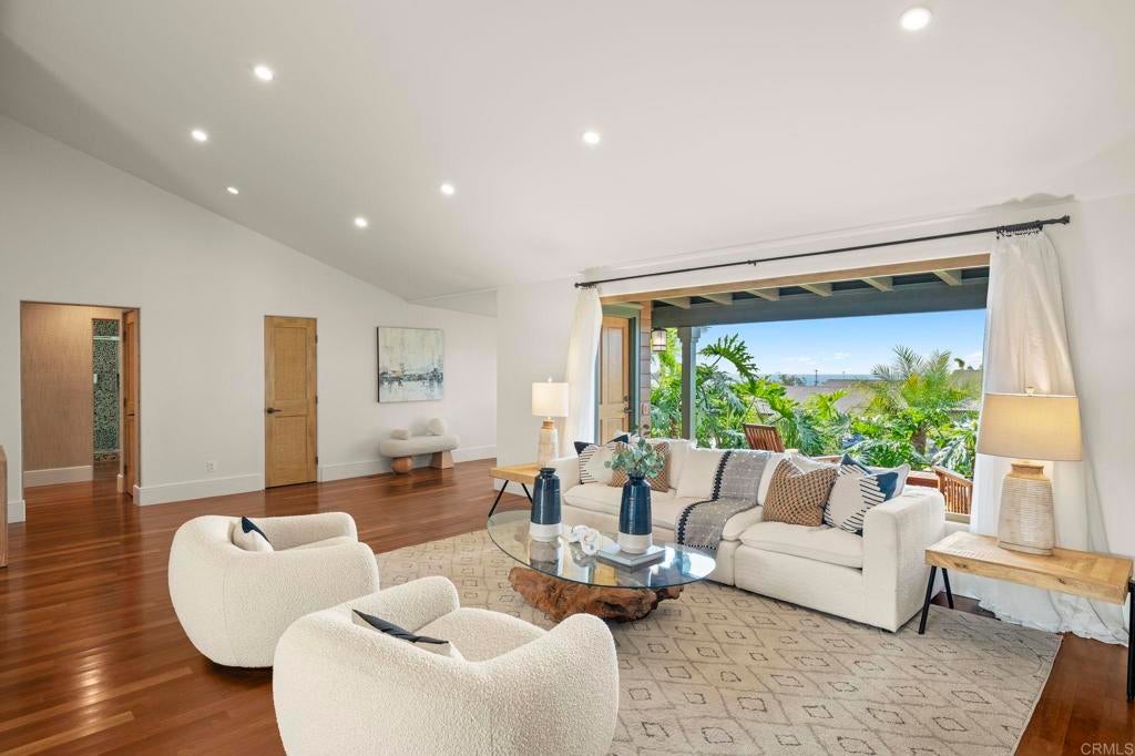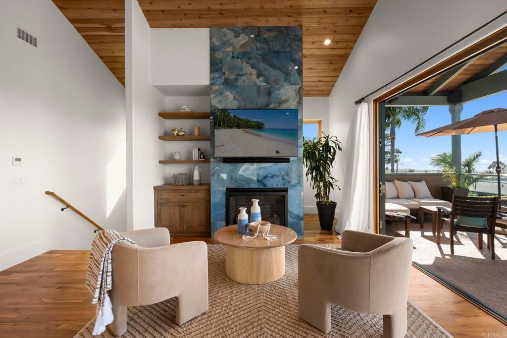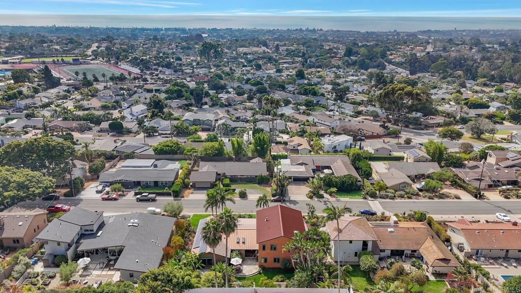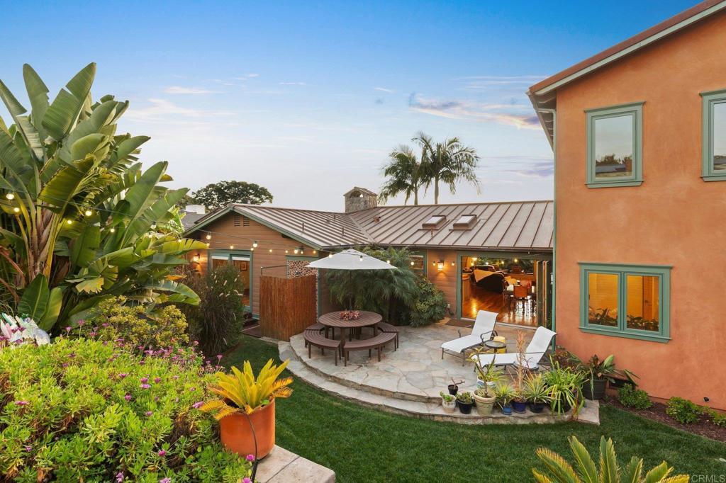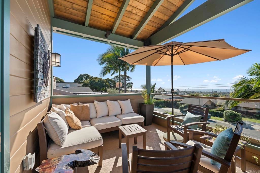 Nestled atop a hill overlooking Olde Carlsbad in the coveted neighborhood of Seacrest Estates, this custom-built masterpiece offers breathtaking PANORAMIC OCEAN views and resides in a tranquil no-through-traffic neighborhood. With 4 bedrooms and 3 baths plus an outdoor shower, the home features unique elegant design throughout. Walking through the door is like walking into a vacation, except, it is home. ----For peace of mind and lower-cost insurance, the home has been rated at the lowest possible risk of fire and flood. See attachment. ----The two-story exterior features ground level and stunning second floor covered porches, New England-style wood siding and trim, a standing seam copper-colored metal roof, artistic exterior lighting, and a broad custom-finished driveway big enough to accommodate several guests. The expansive backyard, with fruiting trees (avocado, orange, lemon, banana, and peach), a top-of-the-line Hot Springs spa, beautiful stone patios, and two Sonos outdoor speaker systems creates a secluded backyard entertainment zone. Situated on a 12,000 square foot lot, well over a quarter acre, there's ample space for gardening, a playground, or potential additions like a pool or ADU. A fully owned SOLAR PV system delivers significant energy offset to power the home. The attached 2.5 car garage has epoxy flooring and a translucent frosted glass garage door catering to needs for parking and workshops. ----Enter the home though the inviting ground level porch and you will find a first floor showcasing 3 bedrooms and 2 baths, one is a suite with bath ensuite. The living area has an antique beamed cathedral-ceiling with an open-plan kitchen/great room adorned with reclaimed hardwood flooring made from 19th century Indonesian railroad ties, and wood triple-pane Pella windows and sliding door with built-in mini-blinds. Two large La Cantina glass folding doors open to seamlessly merge indoor and outdoor living spaces making entertaining a dream. The spacious crafts room features elongated workspaces with wood and stone counters, ample storage, utility sink and a generous laundry area. An adjacent storage room includes built-in shelving and a cedar closet. A wide, brightly illuminated stairway leads to the second floor. ----The second story provides a generous master bedroom, bathroom, and dressing room suite. A 20-foot long La Cantina door opens the master room onto a covered 380 sq. ft. porch with glass wall and railings that bring stunning sunsets and a 180-degree ocean view to your bedside. Interior highlights continue with tongue-in-groove plank cathedral ceilings, solid oak flooring, and 8-inch baseboards. Luxurious amenities abound, such as an oversized walk-in rain shower with accessories and a 135 sq. ft. wardrobe room complete with custom built-in dressers, shelving, and racking. Additional features include Solatube daylighting, custom lighting fixtures, custom built-ins including a wet bar with beverage center. A stunning floor to ceiling fireplace with beautiful large format tile that warms the room on the occasional chilly night and makes reading and TV time extra cozy. Designed with foresight, the home is pre-wired and framed for a future interior elevator to go from the main level to the second floor. ---While secluded and quiet, this home is an easy walking distance to the nearby award-winning middle and high school, and minutes’ drive to beaches and the Carlsbad Village. This one-of-a-kind home epitomizes the Carlsbad coastal lifestyle of relaxation, luxury, and convenience. ---Schedule your private showing today to experience all this exceptional property has to offer.