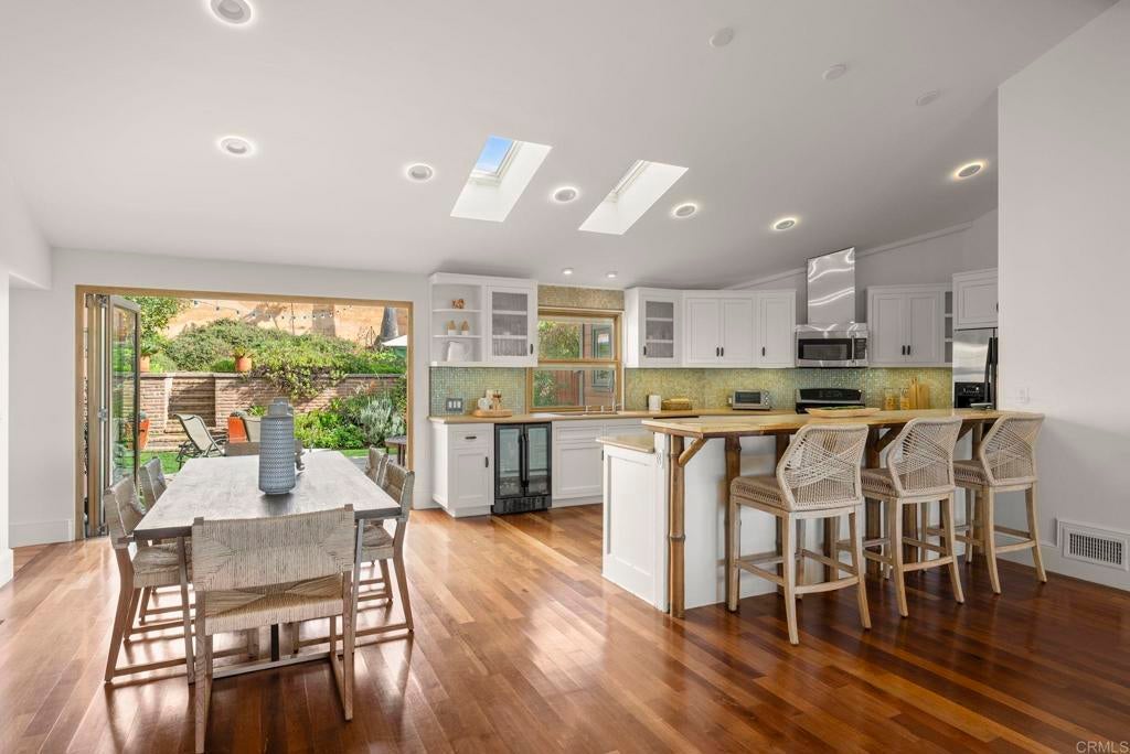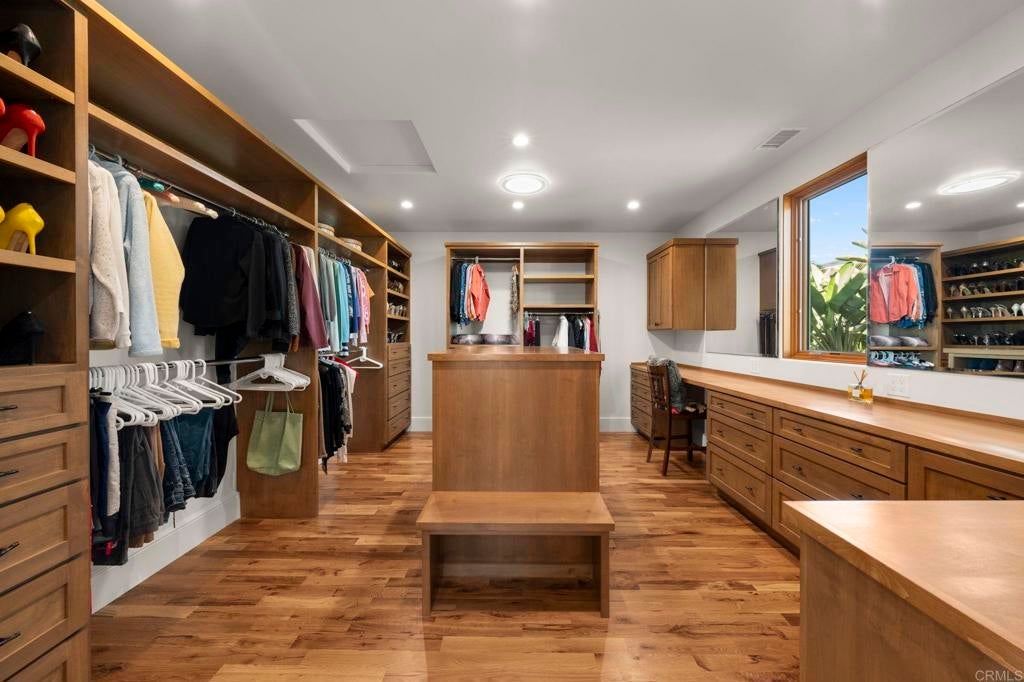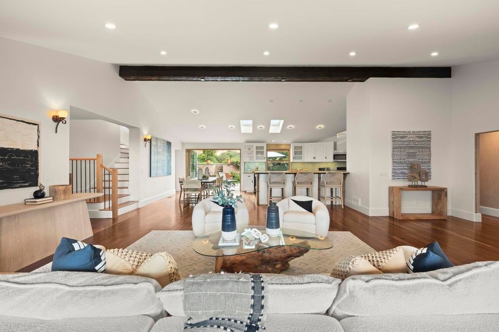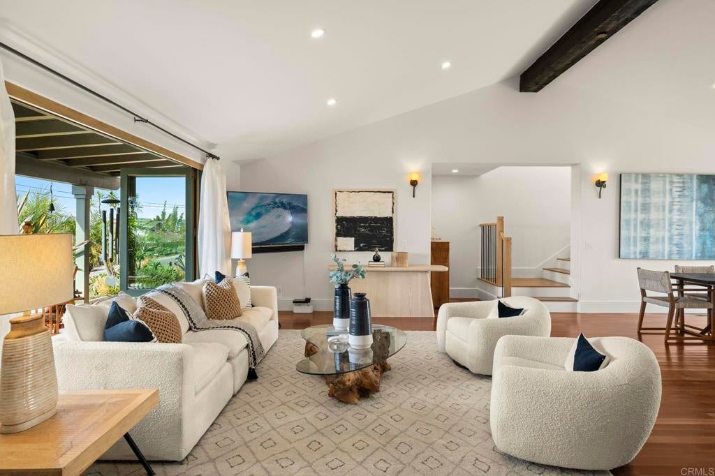Nestled atop a hill overlooking Olde Carlsbad in the coveted neighborhood of Seacrest Estates, this custom-built masterpiece offers breathtaking PANORAMIC OCEAN views and resides in a tranquil no-through-traffic neighborhood. With 4 bedrooms and 3 baths plus an outdoor shower, the home features unique elegant design throughout. Walking through the door is like walking into a vacation, except, it is home. ----For peace of mind and lower-cost insurance, the home has been rated at the lowest possible risk of fire and flood. See attachment. ----The two-story exterior features ground level and stunning second floor covered porches, New England-style wood siding and trim, a standing seam copper-colored metal roof, artistic exterior lighting, and a broad custom-finished driveway big enough to accommodate several guests. The expansive backyard, with fruiting trees (avocado, orange, lemon, banana, and peach), a top-of-the-line Hot Springs spa, beautiful stone patios, and two Sonos outdoor speaker systems creates a secluded backyard entertainment zone. Situated on a 12,000 square foot lot, well over a quarter acre, there's ample space for gardening, a playground, or potential additions like a pool or ADU. A fully owned SOLAR PV system delivers significant energy offset to power the home. The attached 2.5 car garage has epoxy flooring and a translucent frosted glass garage door catering to needs for parking and workshops. ----Enter the home though the inviting ground level porch and you will find a first floor showcasing 3 bedrooms and 2 baths, one is a suite with bath ensuite. The living area has an antique beamed cathedral-ceiling with an open-plan kitchen/great room adorned with reclaimed hardwood flooring made from 19th century Indonesian railroad ties, and wood triple-pane Pella windows and sliding door with built-in mini-blinds. Two large La Cantina glass folding doors open to seamlessly merge indoor and outdoor living spaces making entertaining a dream. The spacious crafts room features elongated workspaces with wood and stone counters, ample storage, utility sink and a generous laundry area. An adjacent storage room includes built-in shelving and a cedar closet. A wide, brightly illuminated stairway leads to the second floor. ----The second story provides a generous master bedroom, bathroom, and dressing room suite. A 20-foot long La Cantina door opens the master room onto a covered 380 sq. ft. porch with glass wall and railings that bring stunning sunsets and a 180-degree ocean view to your bedside. Interior highlights continue with tongue-in-groove plank cathedral ceilings, solid oak flooring, and 8-inch baseboards. Luxurious amenities abound, such as an oversized walk-in rain shower with accessories and a 135 sq. ft. wardrobe room complete with custom built-in dressers, shelving, and racking. Additional features include Solatube daylighting, custom lighting fixtures, custom built-ins including a wet bar with beverage center. A stunning floor to ceiling fireplace with beautiful large format tile that warms the room on the occasional chilly night and makes reading and TV time extra cozy. Designed with foresight, the home is pre-wired and framed for a future interior elevator to go from the main level to the second floor. ---While secluded and quiet, this home is an easy walking distance to the nearby award-winning middle and high school, and minutes’ drive to beaches and the Carlsbad Village. This one-of-a-kind home epitomizes the Carlsbad coastal lifestyle of relaxation, luxury, and convenience. ---Schedule your private showing today to experience all this exceptional property has to offer.