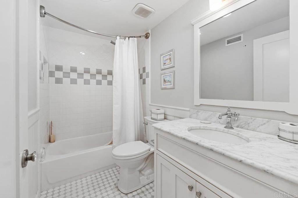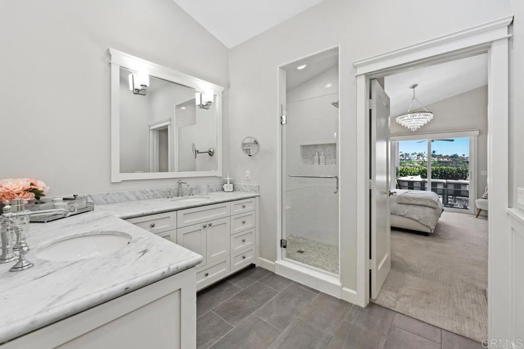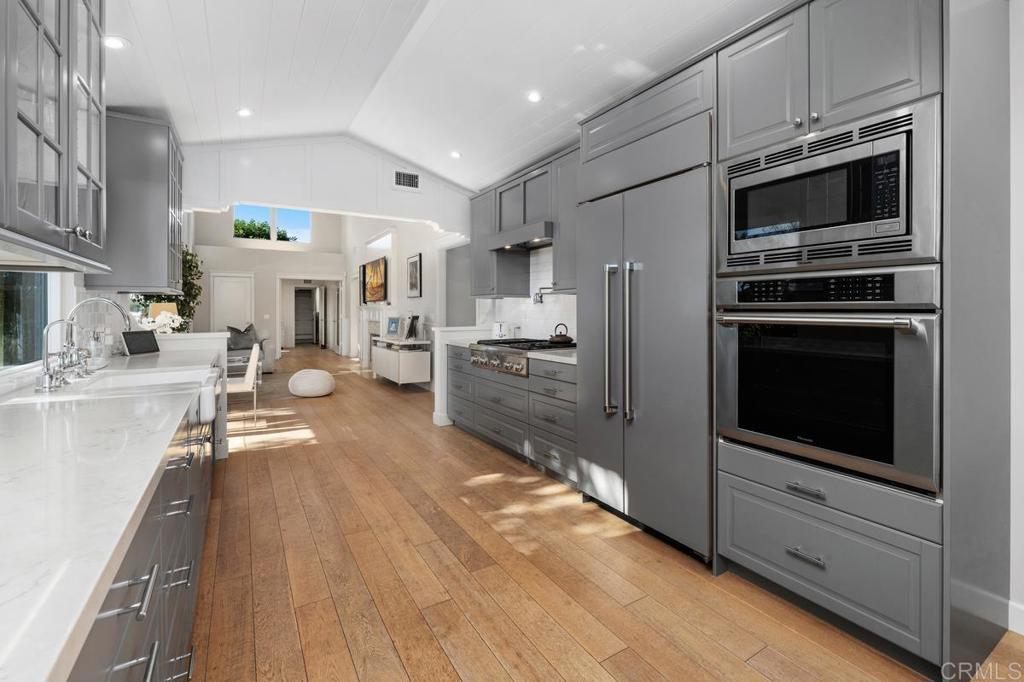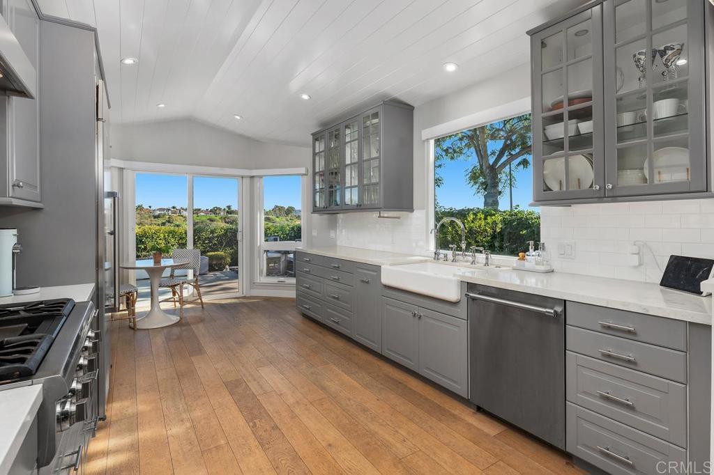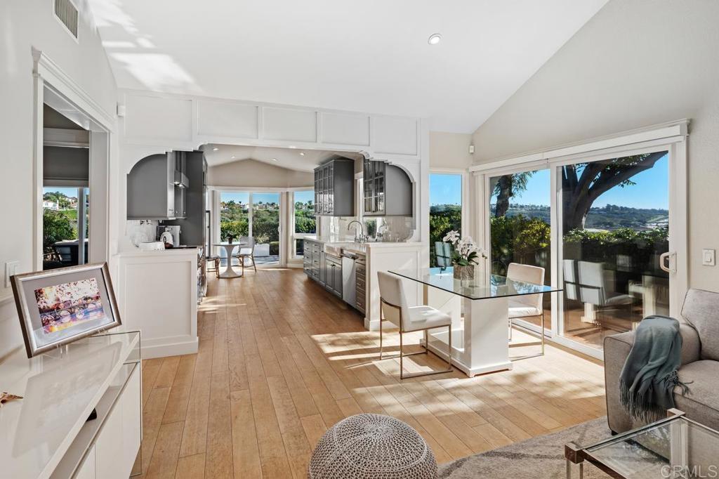 Perched above Batiquitos Lagoon in the gated Sea Cliff community. Remodeled coastal retreat with sweeping lagoon views, with a peek of the ocean from the south side. Natural light pours in all day due to the home’s ideal east–west orientation. Inside, French oak wood flooring, paneled wainscoting, and a soft neutral palette create an atmosphere of relaxed sophistication. The living room’s soaring ceilings, custom millwork, and refined fireplace flow effortlessly into the dining area and out to the view patios. The chef’s kitchen with Sub-Zero and Thermador appliances, granite counters, farmhouse sink with Kohler fixtures, and custom cabinetry under a tongue-and-groove wood ceiling. From the kitchen and dining area, picture windows and sliding doors frame the lagoon like artwork, turning every day into a front-row seat to nature. The primary suite lives like a boutique hotel: plush carpeting, automatic blinds, and sliding doors that open to a private patio overlooking the lagoon and hills. A spa-inspired bath with Carrera marble counters, dual vanities, walk-in shower, and custom built-in closet makes unwinding at the end of the day feel effortless, while the hall bath echoes the same elegant finishes. A charming office with custom paneling, built-in window seat, and peaceful garden views offers an inspiring place to work or read, and can easily convert to an additional bedroom. A separate, finished laundry room with generous cabinetry, counter space, and sink. Outdoor living patio with automatic louvered pergola and lounge/dining areas oriented to the lagoon, plus a side patio with fountain, lush landscaping, and ocean glimpses. The epoxy-finished garage with extensive custom cabinetry and EV charger keeps beach gear, bikes, and hobbies organized. Sea Cliff residents enjoy pools, spas, tennis courts, lakes, walking paths, and a clubhouse—all moments from the sand, coastal restaurants, and shops.