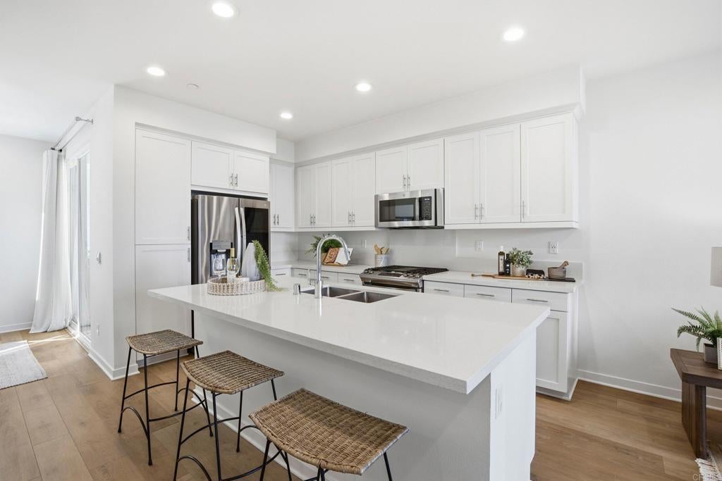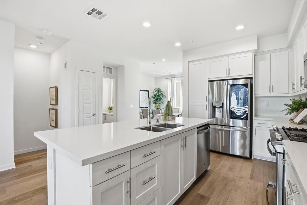 Welcome to 6140 Colt Pl #103, a beautifully updated 3-bedroom, 3.5-bath residence located in the highly sought-after Kensington at the Square community in Carlsbad. Offering approximately 1,670 square feet of thoughtfully designed living space, this home blends modern comfort with timeless style—ideal for both everyday living and entertaining. The open-concept layout is filled with natural light and features high ceilings and a seamless flow between the living, dining, and kitchen areas. The contemporary kitchen is appointed with stainless steel appliances, quartz countertops, abundant cabinetry, and a spacious island—perfect for gatherings, family meals, or casual entertaining. Each bedroom is generously sized with excellent closet space, and all bathrooms showcase clean, modern finishes. Additional highlights include eco-friendly paid off solar to help reduce energy costs, EV charging capability, and a layout that offers flexibility for families, guests, or a home office setup. Ideally situated near the heart of Bressi Ranch, this home enjoys close proximity to parks, dining, shopping, and everyday conveniences—including Sprouts—while maintaining a quiet, neighborhood feel. A wonderful opportunity to own a stylish, move-in-ready home in one of Carlsbad’s most desirable communities.