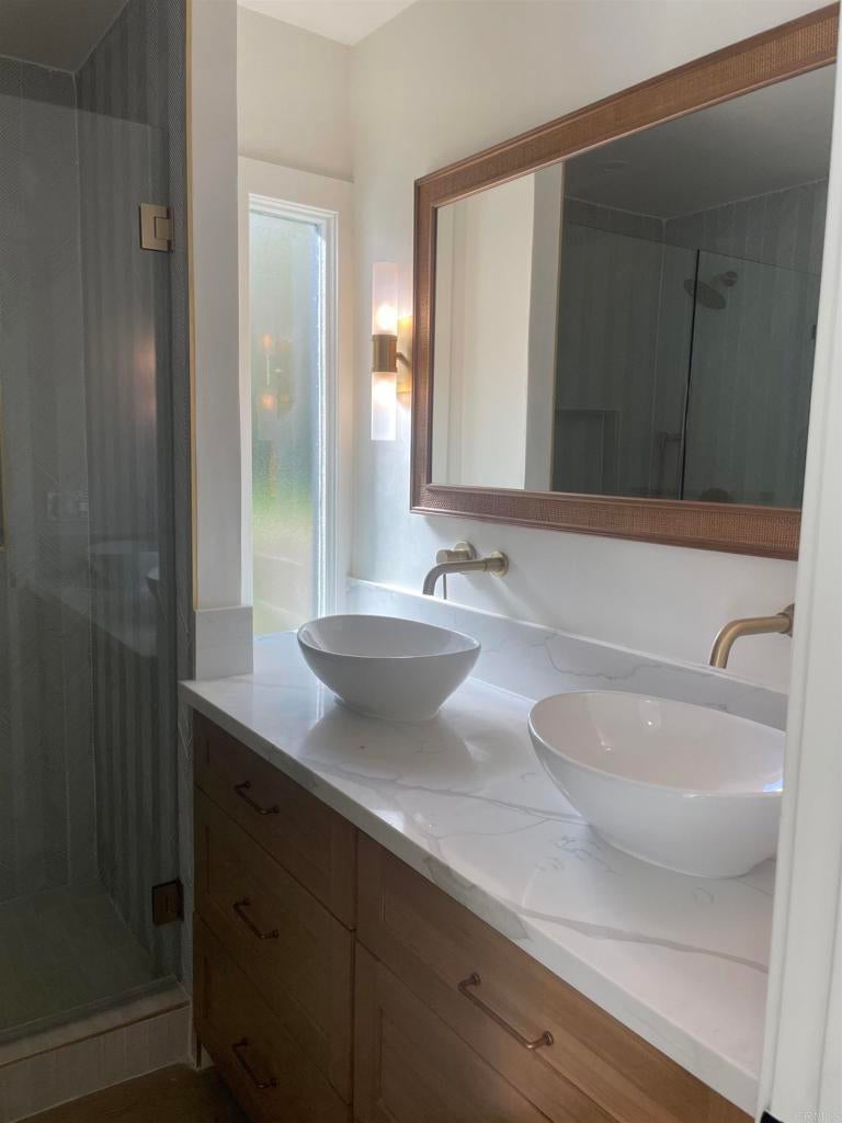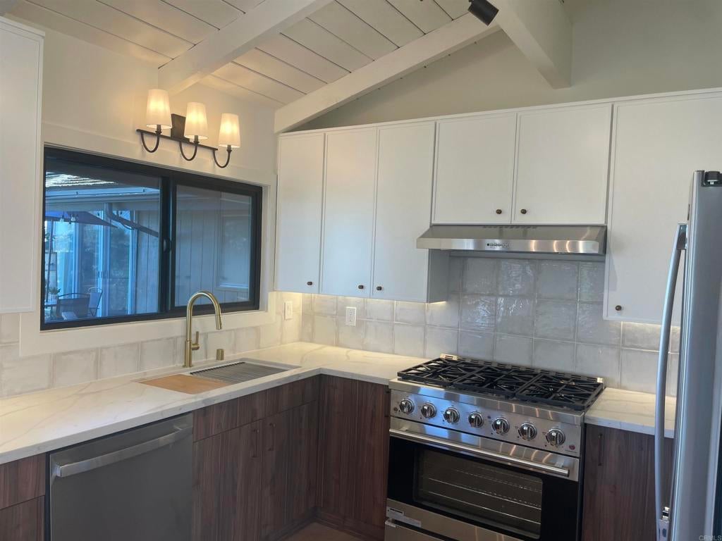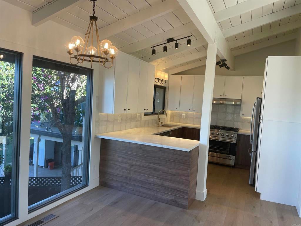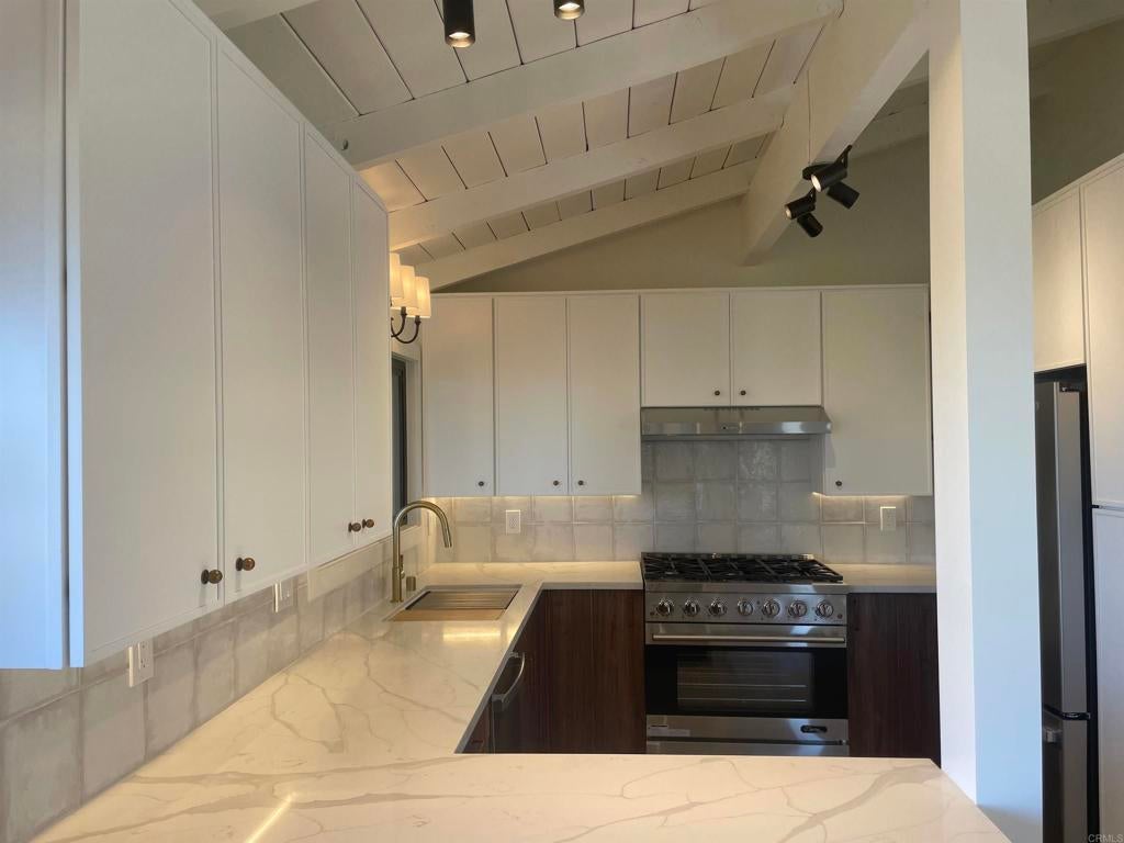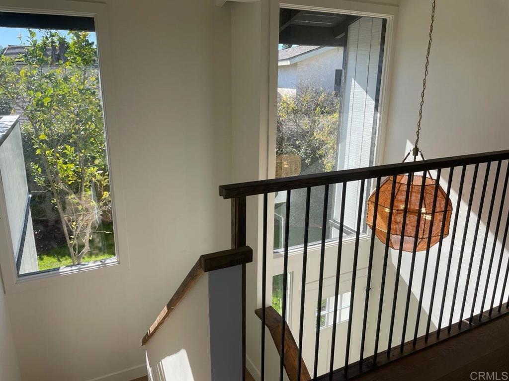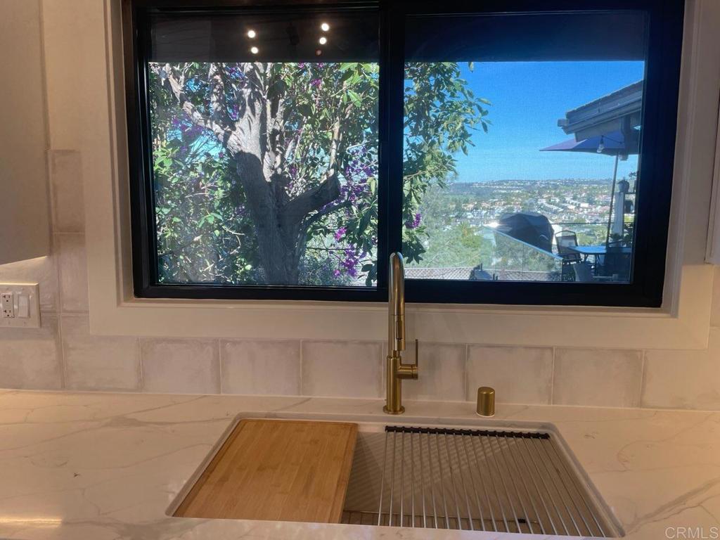 Commanding breathtaking La Costa resort and golf course views, this exquisitely remodeled twinhome is privately positioned at the end of a quiet cul-de-sac. Designed for refined coastal living, the home blends architectural character with modern luxury, throughout. The expansive family room is highlighted by vaulted wood ceilings, a statement fireplace, custom wood shutters, and walls of glass that open to a Trex deck framing sweeping panoramic views. The dining room enjoys equally dramatic vistas, creating an elegant setting for everyday living and entertaining. The designer kitchen features quartz countertops, stainless steel appliances, and thoughtfully selected finishes that balance function and sophistication. Wide-plank luxury vinyl flooring flows seamlessly throughout the home. The residence offers three private bedroom suites, including two on the main level. The upstairs suite features an oversized east-facing deck, ideal for enjoying soft morning light and a quiet, private retreat. The spacious backyard includes a detached bonus room offering flexible space for storage or fitness. Notable upgrades include a new air conditioning system, furnace, and water heater. Ideally located within walking distance to an award-winning elementary school and close to middle and high schools. Just minutes from pristine beaches, premier shopping, and fine dining. No HOA.
