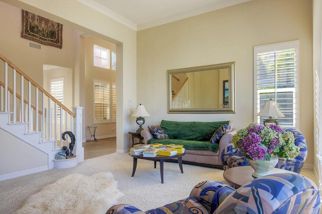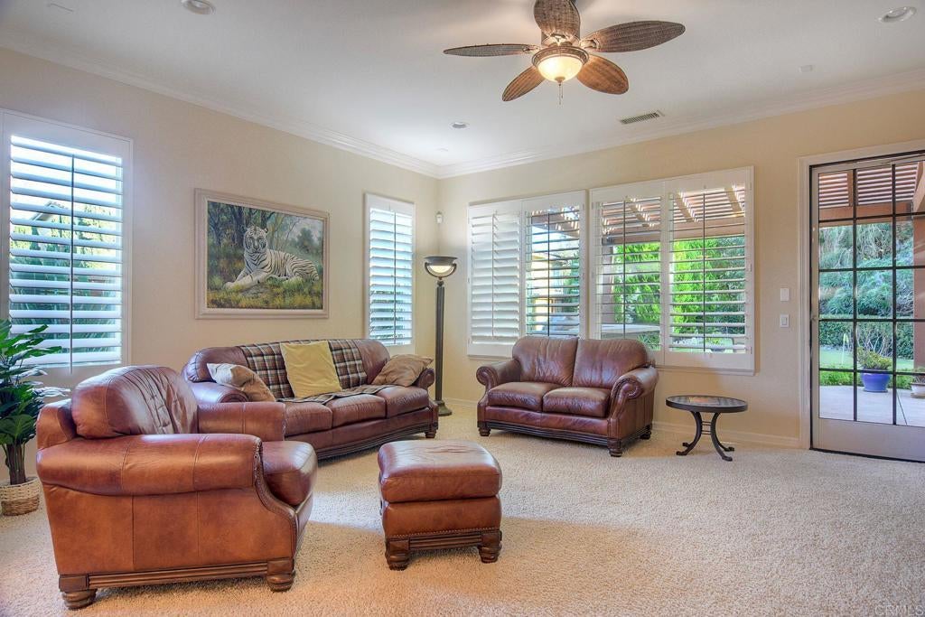 One of the best lots in the Haciendas at Rancho Carrillo - nearly half an acre! VERY PRIVATE! Rare-to-market floor plan features a MAIN FLOOR PRIMARY SUITE. Formal living and dining rooms. Kitchen opens to the family room. Central air conditioning (zoned), plantation shutters, new water filtration system. Laundry room, spacious loft/bonus room, attached 3-car tandem garage. Inviting central courtyard. Rear yard features a built-in BBQ, covered patio area (patio cover was recently rebuilt), putting green, and waterfall. Top-of-the-hill feel with tranquil area views. Located on single-loaded portion of Rancho Cortes so no neighbors directly across street. Low HOA. Homeowners enjoy access to the Carrillo Swim Center.