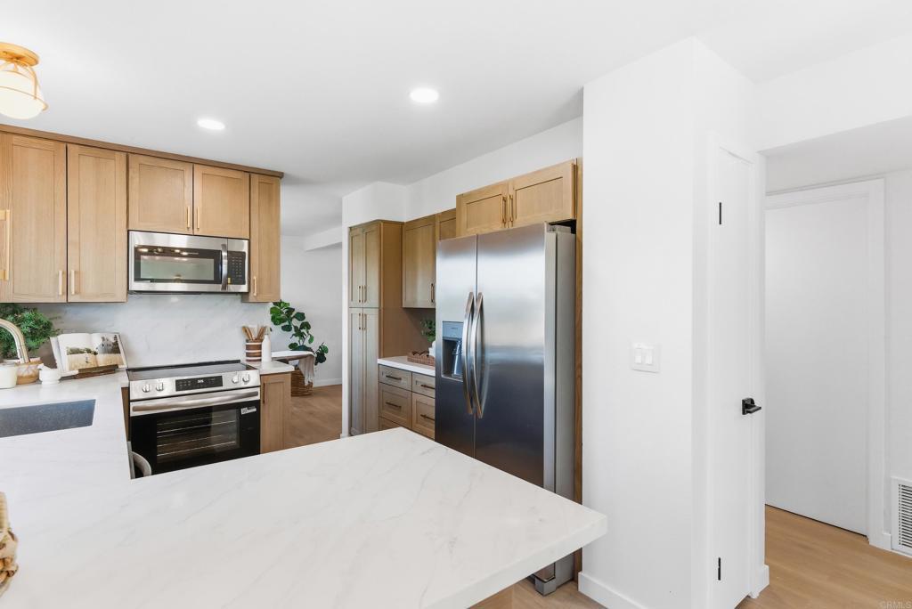 Move right in and enjoy the confidence that comes with owning a home where the work has already been beautifully completed. This fully remodeled two-story residence delivers 1,873 square feet of thoughtfully reimagined living space on a level 6,800 square foot lot, creating an ideal blend of comfort, functionality, and modern style. With so many wonderful updates throughout, this home is perfectly suited for buyers seeking more space, a fresh start, and the freedom to simply settle in and enjoy. From the moment you enter, soaring vaulted ceilings and abundant natural light set an inviting tone. The floor plan flows effortlessly, offering multiple living areas that adapt easily to daily life, entertaining, work-from-home needs, or growing households. Central air conditioning ensures year-round comfort, while updated windows and finishes enhance both efficiency and style. Every detail has been considered to create a home that feels open, polished, and move-in ready. The kitchen is a true centerpiece, balancing clean design with everyday usability. Brand-new cabinetry, modern countertops, and new appliances provide both beauty and function, while champagne gold light fixtures and cabinet hardware add a refined, contemporary touch without feeling overdone. Whether preparing weeknight meals or hosting friends, this space feels current, warm, and effortlessly livable. All four bedrooms are located upstairs, offering privacy and separation from the main living areas. The spacious primary suite is designed for comfort, featuring generous proportions, a large walk-in closet, and a dual-sink vanity that makes mornings smoother and evenings more relaxed. Additional bedrooms ready to accommodate a variety of lifestyles, hobbies, or future needs. Bathrooms throughout the home showcase modern finishes and floor-to-ceiling tile, continuing the clean, cohesive aesthetic. Outside, the level backyard is designed for easy enjoyment and low maintenance. Synthetic turf keeps the space looking fresh year-round, while a trellis creates a perfect spot for outdoor dining, relaxing, or gathering. Territorial views add a sense of openness and connection to the surrounding landscape, extending the living experience beyond the interior walls. The three-car garage, complete with brand new garage doors, offers generous space for vehicles, storage, or recreational gear, adding flexibility that is increasingly hard to find. Combined with the extensive upgrades throughout the home including new roof, paint, flooring, lighting, cabinetry, kitchen, appliances, and finishes inside and out, this property delivers exceptional value for buyers who want peace of mind and long-term enjoyment. This is a home designed to support the next chapter, offering room to grow, spaces to gather, and a modern foundation that allows you to focus on living rather than renovating. A rare opportunity to own a fully refreshed home in the sought after San Diego area, thoughtfully updated and ready to welcome its next owner.