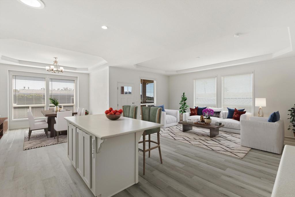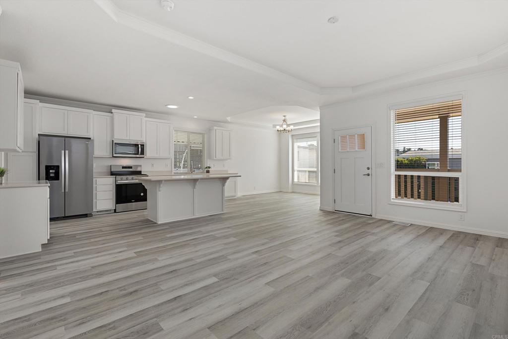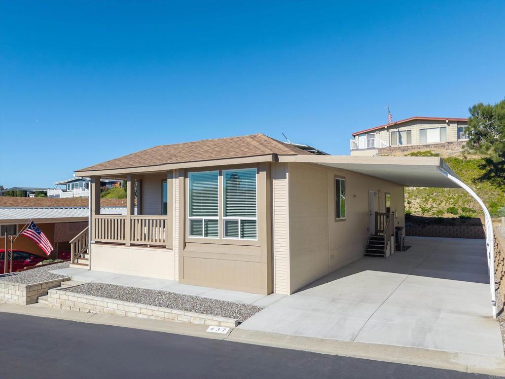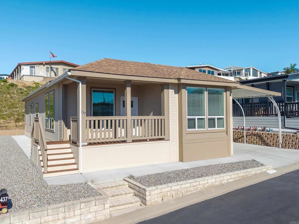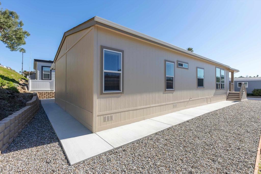Brand new and never lived in, this stunning 3-bedroom, 2-bath Silvercrest manufactured home comes with a 7-year factory warranty and is located in Palomar Estates West, a 55+ resort-style community with a vibrant social atmosphere and rent control. Enjoy sweeping ocean views all the way to Catalina Island, breathtaking sunsets, and refreshing coastal breezes from the covered Trex porch. Inside, an open floorplan welcomes you with a spacious island kitchen flowing seamlessly into the great room and sunny dining area. White shaker-style hardwood cabinetry with soft-close hardware is featured throughout. Nine-foot ceilings enhance the modern, airy feel, while six solar tubes flood the home with natural light. Coffered ceilings with crown molding in the primary bedroom, great room, and dining room add a dramatic, upscale touch. Additional upgrades include stainless steel appliances, vinyl low-E windows, rocker light switches, and TV jacks in all three bedrooms, the great room, and at the kitchen island. The primary suite offers a walk-in closet and a private ensuite bath, creating a comfortable and elegant retreat. This FIVE STAR park welcomes 2 small pets per household (must be approved by management) and rent control. As an added bonus for pet owners; this home happens to be just a short walk across the street from the community dog park! The monthly space rent is only $723.05 per month. Age 55+, 2nd resident can be 35+. Note: Some images have been virtually staged.