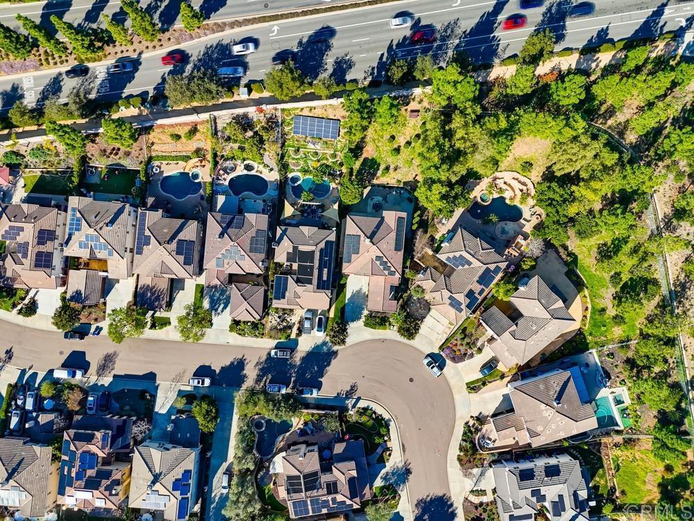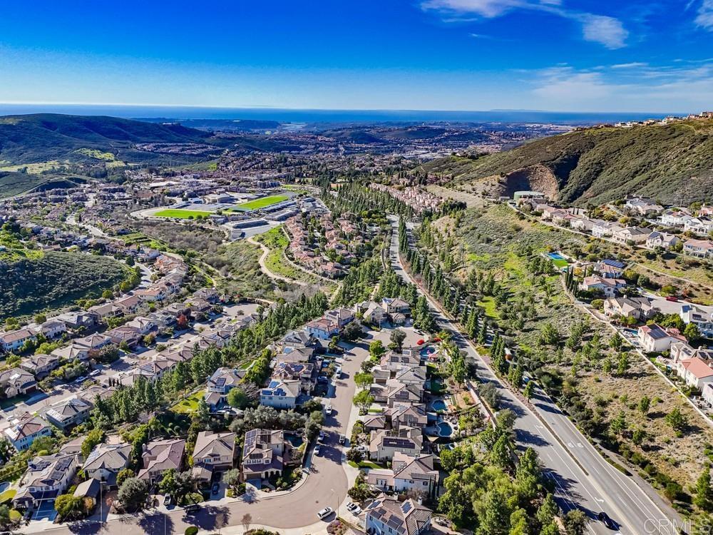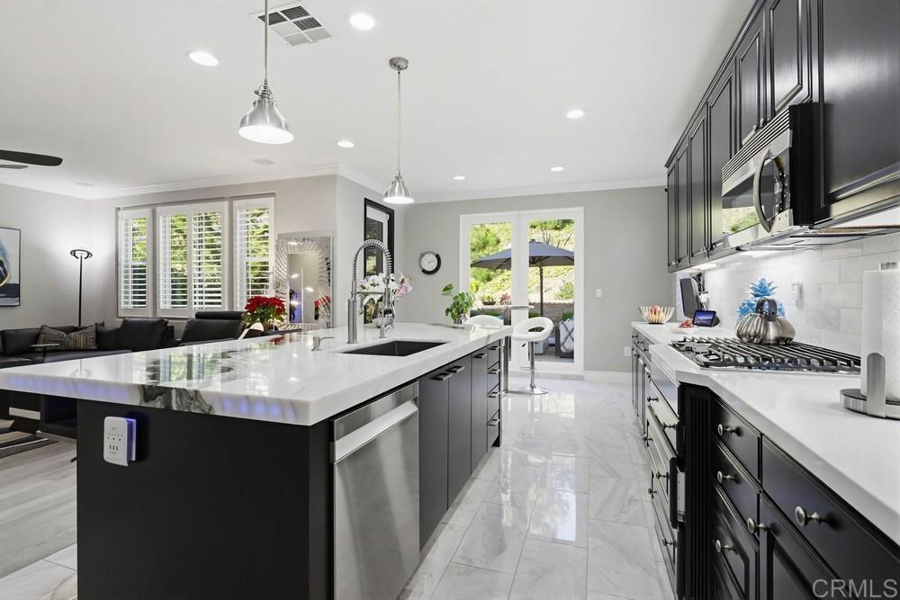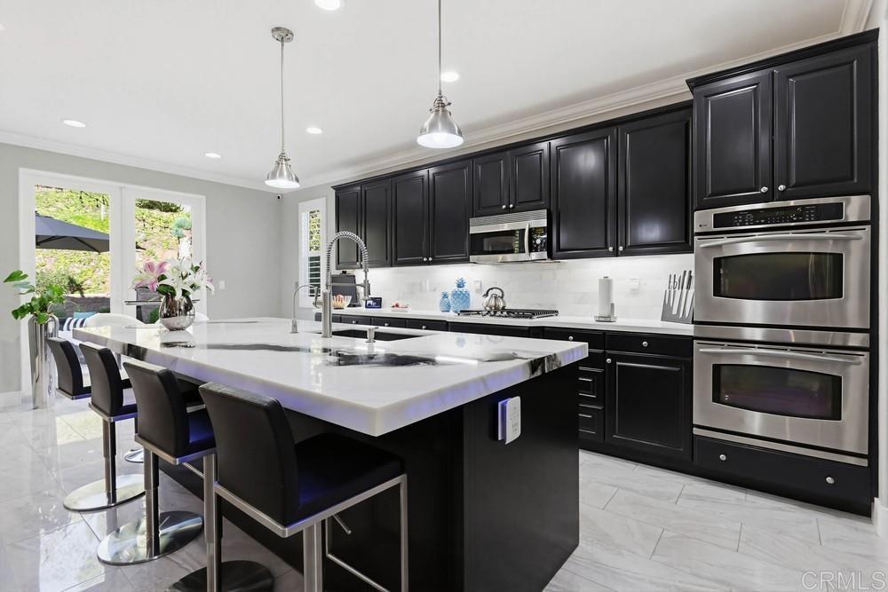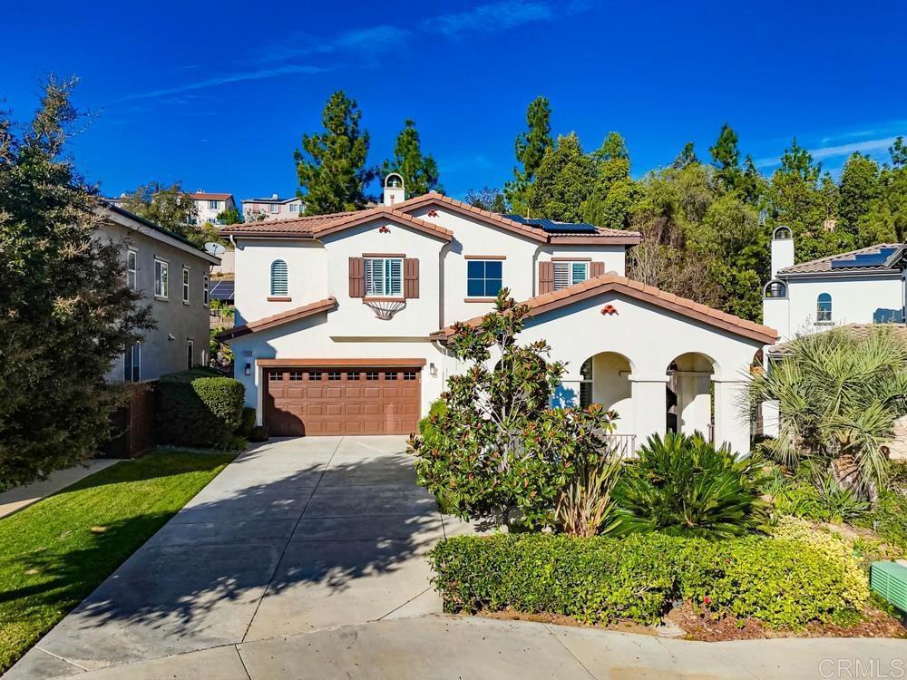 Wellcome to this Crest View fully upgraded modern designed home in San Elijo Hills. It features California shutters all-around, a custom decorated office with incorporated furniture and a hallway entrance with porcelain tiles. The dining room encounters you with an elegant light fixture and a designer's wall. Kitchen's oversized marble countertop island has room for up to 6 people seating. Plenty of cabinetry in kitchen and butler room offers more than enough storage space and the marble backsplash completes the upscale look. The nook has a french door opening to the backyard for your convenience and entertainment. Family room showcases a modern fully closed fireplace and a niche for all your audio/visual equipment needs. Upgraded vinyl flooring and tiles are present in the entire house. The 5 bedrooms upstairs have ceiling fans and dual central A/C allow for a pleasant ambiance on both floors. The house has fully paid 21 solar panels, with an installed power over 7 kW, generating approx. 11 MWh energy annually. A Tesla EV charger completes the energy-efficient characteristics of this home. The pool-sized backyard offers enough space for the indoor-outdoor California lifestyle. The close proximity to the community park, hiking trails and downtown San Elijo Hills make this property higkly desirable.