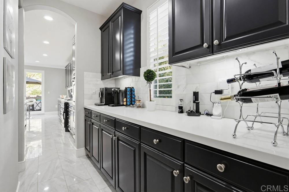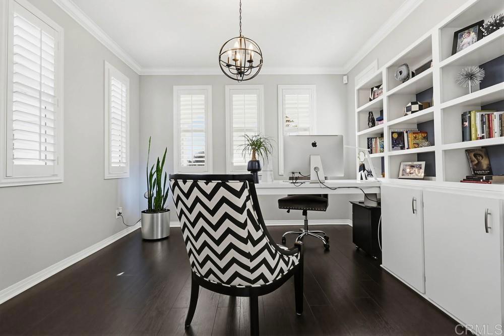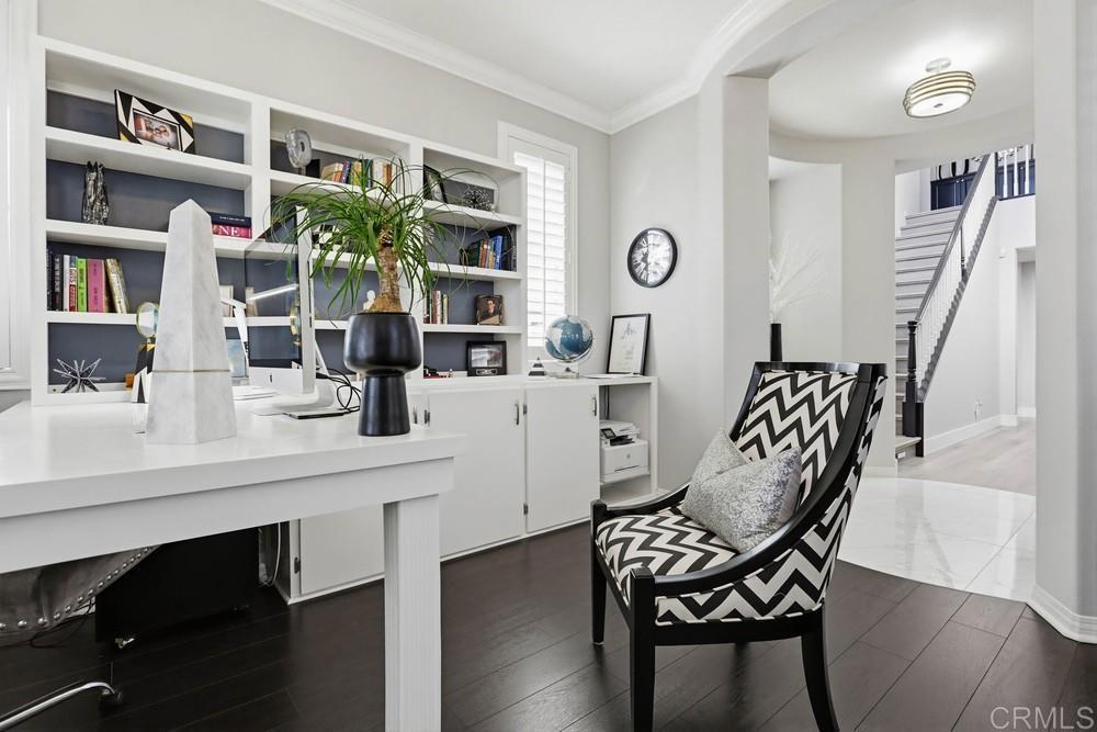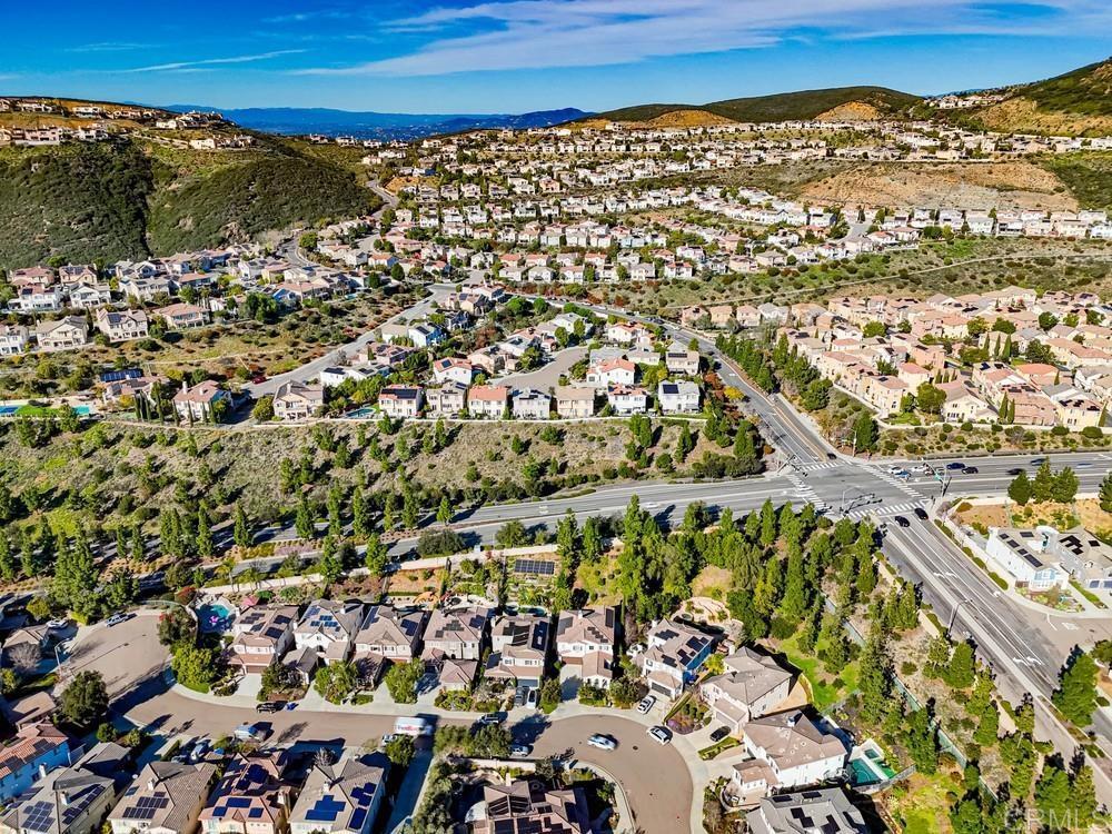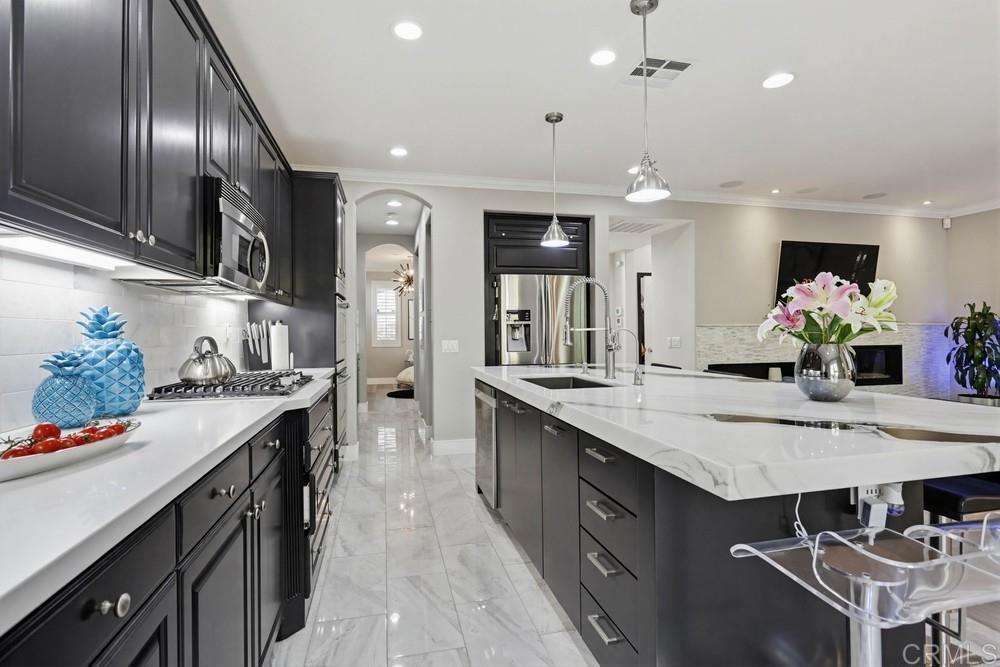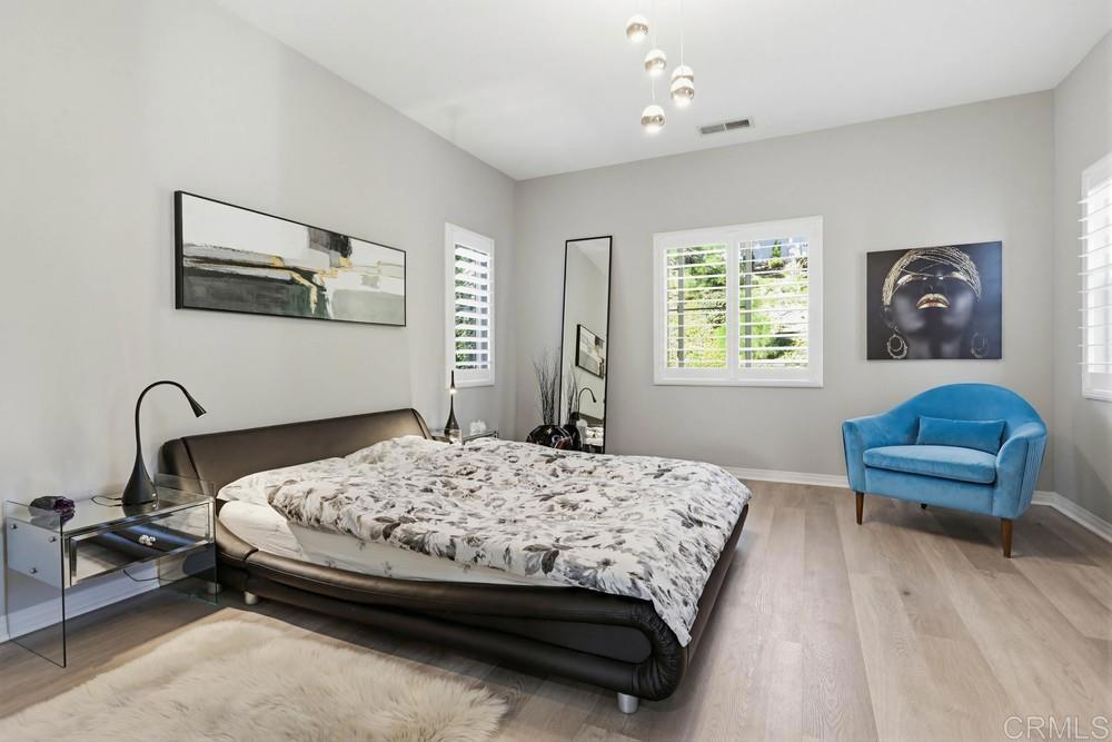Wellcome to this Crest View fully upgraded modern designed home in San Elijo Hills. It features California shutters all-around, a custom decorated office with incorporated furniture and a hallway entrance with porcelain tiles. The dining room encounters you with an elegant light fixture and a designer's wall. Kitchen's oversized marble countertop island has room for up to 6 people seating. Plenty of cabinetry in kitchen and butler room offers more than enough storage space and the marble backsplash completes the upscale look. The nook has a french door opening to the backyard for your convenience and entertainment. Family room showcases a modern fully closed fireplace and a niche for all your audio/visual equipment needs. Upgraded vinyl flooring and tiles are present in the entire house. The 5 bedrooms upstairs have ceiling fans and dual central A/C allow for a pleasant ambiance on both floors. The house has fully paid 21 solar panels, with an installed power over 7 kW, generating approx. 11 MWh energy annually. A Tesla EV charger completes the energy-efficient characteristics of this home. The pool-sized backyard offers enough space for the indoor-outdoor California lifestyle. The close proximity to the community park, hiking trails and downtown San Elijo Hills make this property higkly desirable.
