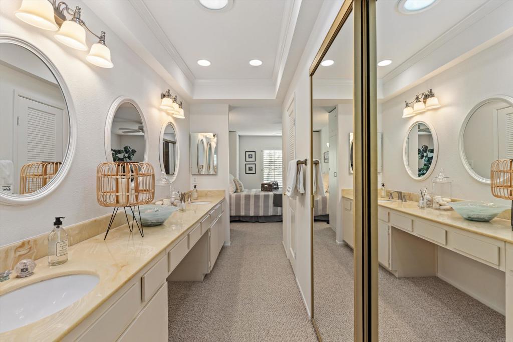 Experience the best of Southern California living in this beautifully maintained twinhome, perfectly situated on the 8th tee of the Links at Lakehouse executive course in the beautiful community of Country Greens in Lake San Marcos. Offering 2 bedrooms, 2 full baths, and 1,307 square feet of comfortable living space on a 4,500 square foot lot, this home combines resort-style amenities with everyday convenience. Step through the charming, landscaped entryway—complete with lemon, apricot and peach trees—and into a bright, inviting interior. Plantation shutters throughout add timeless elegance, while the cozy, brick fireplace creates a warm focal point for the living area. The freshly painted interior enhances the home’s airy feel, and the spacious primary suite features a huge en-suite bath and generous closet space. A convenient in-home washer and dryer make daily living effortless. Enjoy breathtaking views of the golf course right from your backyard—an ideal setting for morning coffee or evening relaxation. Residents of Country Greens enjoy access to a wealth of amenities, including a community pool, basketball court, tennis court, and clubhouse. The HOA includes the Lake and Lodge benefits so homeowners also receive access to pickleball and tennis courts, two additional pools, discounts on boat rentals and Lakehouse hotel stays, a billiards room, and more. With its stunning golf course views, resort-style amenities, and prime location near shopping, dining, and recreation, this little gem offers the perfect blend of comfort, style, and lifestyle. Welcome home to Lake San Marcos living at its finest!