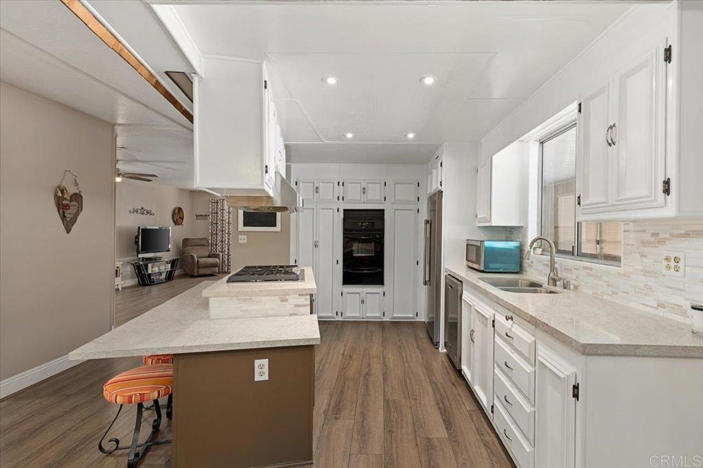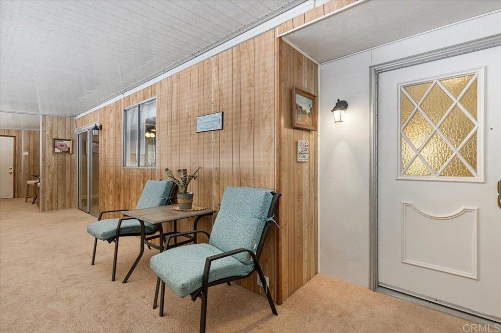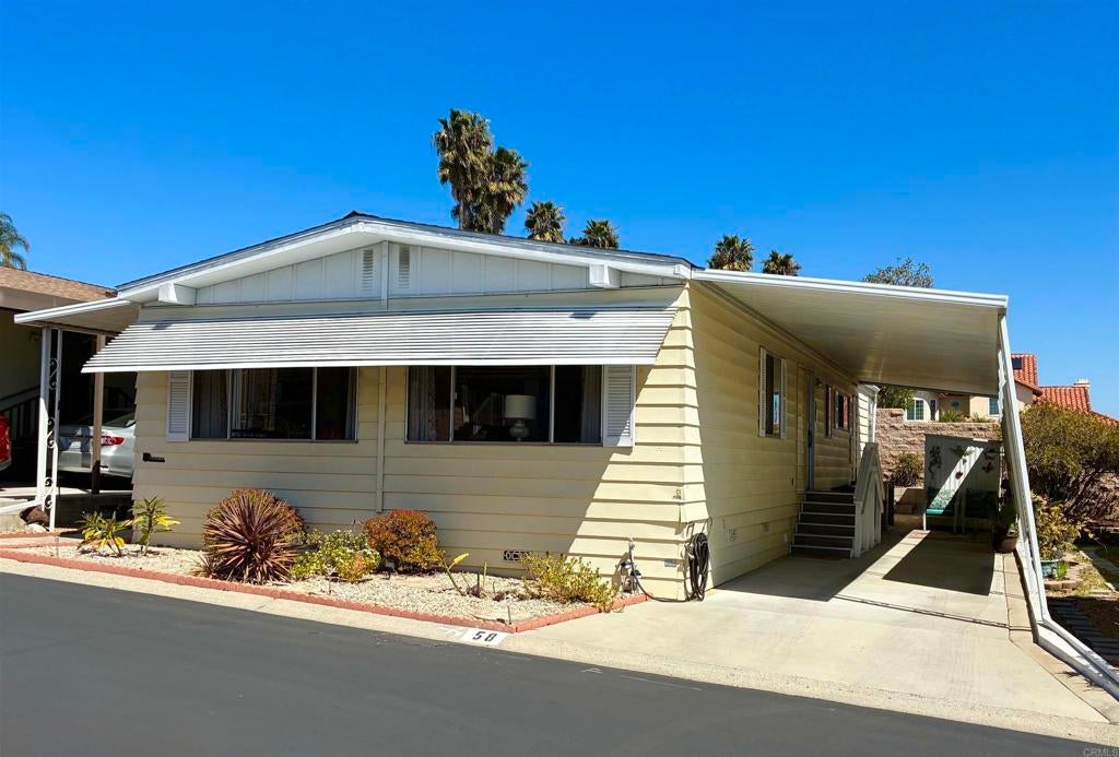 Lovely well cared for and updated home located in a 55+ resort style community with many amenities and city rent control! This home features waterproof Luxury Vinyl Plank floors throughout, as well as updated interior paint, molding, and fixtures. The Island Kitchen features new quartz counter tops, backsplash, and all newer appliances (with the exception of the oven.) This open floor plan has Separate Living and Family rooms providing plenty of space for leisure or entertaining. A solar tube in the Family room helps make this home feel bright and cheerful. The Primary Suite has a door that leads out to a raised garden bed and private back patio. There is Central A/C in addition to ceiling fans located in both bedrooms and the Living and Family room for a total of four. An oversized enclosed porch offers additional usable space not accounted for in the 1440 Sq.Ft.; This space makes a great sitting room, office, exercise or hobby room. The exterior offers TWO storage sheds for even more storage space. Rancho Vallecitos is a beautiful, 5-Star, resort style community for persons 55 years of age and over (2nd resident can be age 45+). One of the most beautiful manufactured home communities in California, Rancho Vallecitos has great views that can be enjoyed throughout the community, plus many social activities and amenities. Amenities include a clubhouse/recreation building, pool & spa, library, gym, billiards room, card tables, game and craft room, putting green, dog park, RV parking for an additional cost, and so much more! Space rent is $716.34 and park is under city rent control.