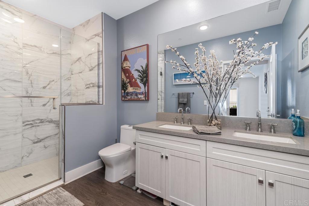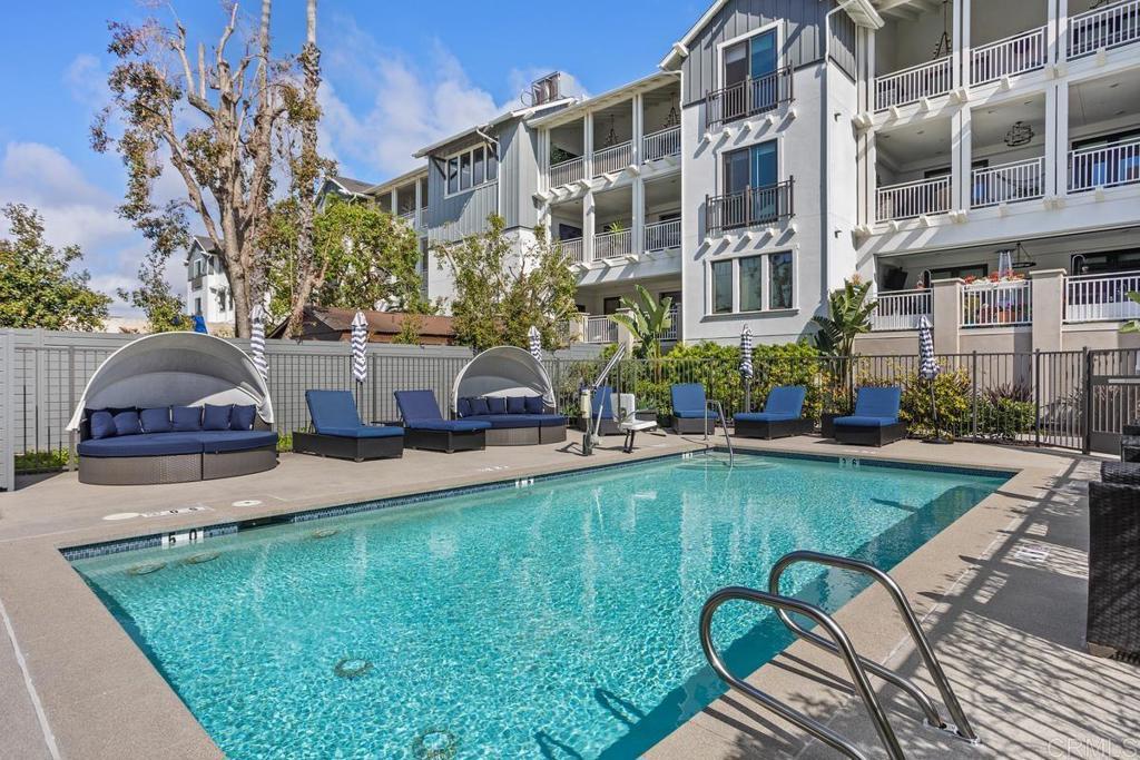Beautifully upgraded single-level 2bd 2bth condo at The Carlyle, located in the heart of Coastal Carlsbad Village. Built in 2020, this sophisticated condo blends modern luxury with effortless coastal living, just steps from Michelin-starred dining, boutique shopping, weekly farmers markets, and Carlsbad’s renowned beaches. The home welcomes you with a bright, open-concept floor plan designed for seamless entertaining. The chef’s kitchen is thoughtfully appointed w/ a Bertazzoni 6 burner & double-oven range, Sub Zero refrigerator, wine refrigerator, quartz countertops, custom tile backsplash, and luxury vinyl plank flooring throughout. The spacious primary suite offers a generous walk-in California closet and an ensuite bathroom, creating a serene private retreat. A dedicated laundry room adds everyday convenience. The great room opens to an expansive private patio, perfect for year-round indoor-outdoor living. Enjoy serene pool views, ocean breezes, and a retractable screen, deal for morning coffee or evening relaxation. The patio is centrally located and accessible from every room, enhancing the home’s exceptional flow. Additional highlights include a secure gated community, controlled access, two assigned underground garage parking spaces, private storage unit, and direct elevator access from the garage. The residence is equipped with a tankless water heater and enjoys resort-style amenities, including a sparkling community pool. The ADA-approved building features wide, spacious hallways for added accessibility. This rare, turnkey opportunity offers the ultimate Carlsbad lifestyle, ideal for full-time living or a luxurious coastal retreat. Live where modern sophistication meets the sea in one of San Diego’s most vibrant beach communities.