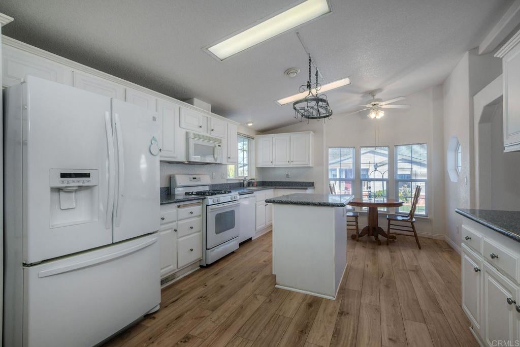 Welcome to resort-style living in this desirable 55+ land-owned manufactured home community in Carlsbad. This beautifully maintained home features brand new vinyl flooring throughout, central A/C, and a wheelchair accessible front entry ramp, offering both comfort and accessibility. The thoughtfully designed floor plan includes a bright kitchen with quartz countertops, white cabinetry, a cozy breakfast nook and a separate formal dining room, ideal for entertaining or everyday living. Recent upgrades add peace of mind, including a new furnace (2024), new dishwasher (2025) and updated copper plumbing throughout. The home includes a RING security system on windows and doors, which conveys with the sale. The refrigerator, wash and dryer are also included. The backyard boasts lemon and Haas avocado trees with automatic sprinklers. The primary bathroom offers a spa-like retreat with a walk-in jacuzzi tub featuring a seat warmer, backed by a transferable lifetime warranty. Residents enjoy an array of amenities to include lake, golf course, clubhouse, pickleball and more along with common RV parking. This is a wonderful opportunity to own a highly upgraded home in one of Carlsbad's most popular 55+ communities where comfort, convenience, and lifestyle come together.