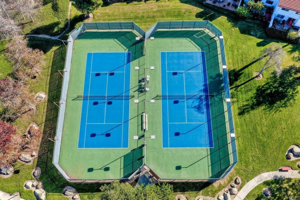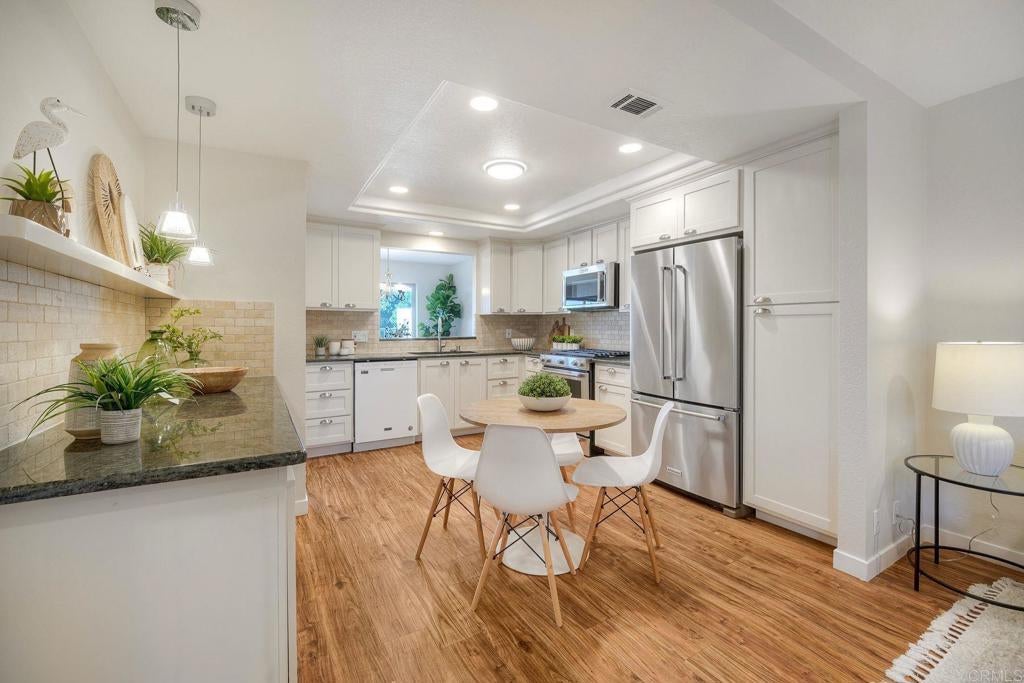 Located on a quiet tree lined street with no neighbors behind you. Rear patio faces West with ocean views from family room & patio. Nicely upgraded & move-in ready. Laminate flooring down stairs, newer kitchen, recessed lighting, vaulted ceilings, new paint, new light fixtures, light & bright. Dual pane windows, remodeled primary bathroom. Attached 2 car garage, 2 pools, 2 tennis courts, lush mature landscaping, guest parking close by. Water is included in monthly HOA's. MUST SEE!