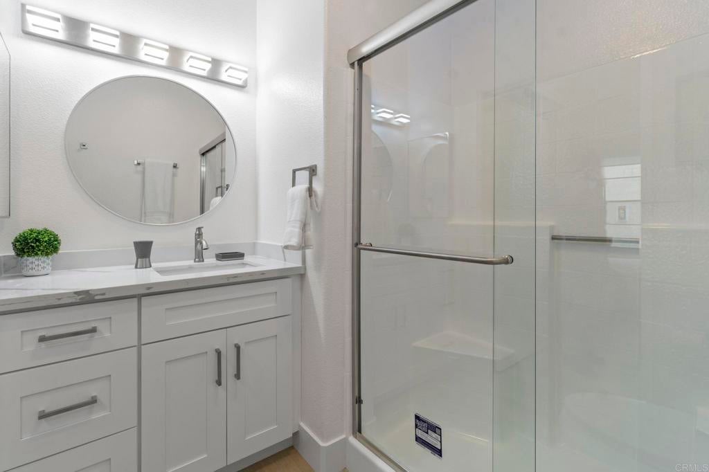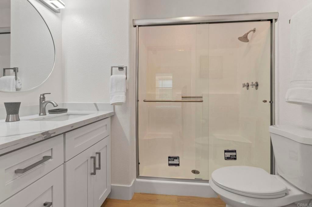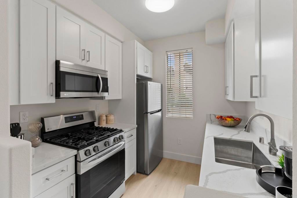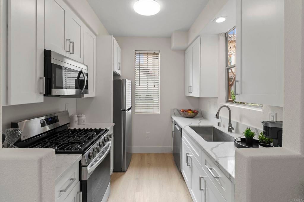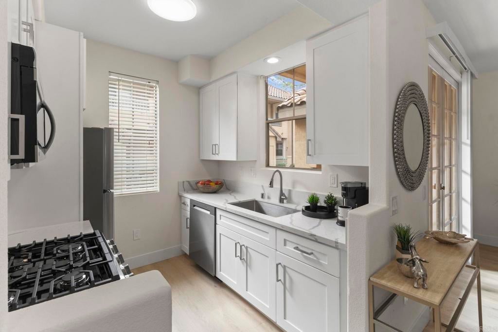 Step into this beautifully renovated 2-bedroom, 2-bathroom condo that seamlessly combines comfort and convenience. Located in a desirable community with resort-style amenities, this home offers the perfect setting for relaxed Southern California living. Enjoy cozy evenings by the charming fireplace in the open living room and dining area. Get creative in the updated kitchen, which boasts ample counter space and storage, featuring all-new shaker cabinets, quartz countertops, and stainless-steel appliances. The spacious primary suite includes a private en-suite bathroom and generous closet space, complete with custom cabinets from San Diego Closet Design. The second bedroom is ideal for guests, a home office, or a family room. It also includes an updated bathroom with a new vanity and countertops, custom closets, and a refinished tub/shower. Unwind on your private decks or take advantage of the community amenities, which include a sparkling pool, spa, and fitness center. This condo offers in-unit laundry, two assigned parking spaces, and a prime location close to shopping, dining, and freeway access. This home truly has everything you need and more. Don't miss out on this rare find—come see it today and envision yourself living the easy, breezy lifestyle you deserve!