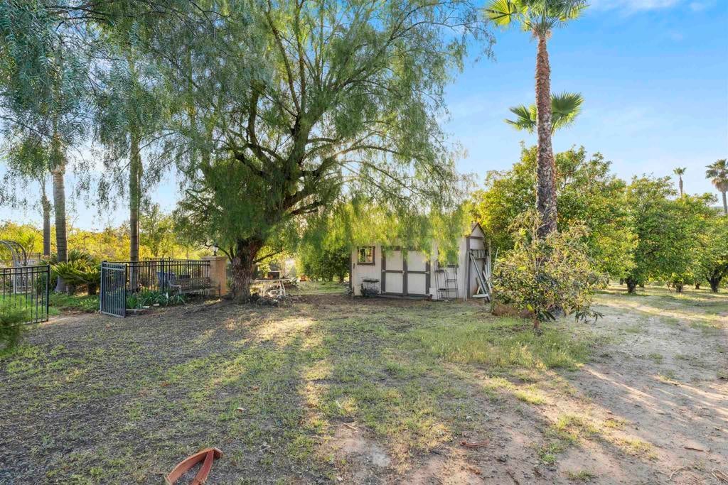 A fabulous single level home of 3014 sq. ft. with 4 bedrooms, 2 full baths and 1 half bath. Three car garage with storage cabinets. The fantastic Interior Features of a well designed floor plan emphasizes comfort and functionality with high ceilings, arched doorways, large living room area and dining room. A large family room with a fireplace and a built in cabinet/shelf area for entertainment equipment with the open space to the large kitchen and breakfast area. Laundry room with washer & dryer and the prefect sink for all cleaning desires, with multiple storage cabinets. Duel zone for all heating and air conditioning for perfect comfort. Stepping outside to discover an expansive covered patio adorned with rustic wooden beams and ornate ironwork, providing the perfect setting for outdoor dining and or gatherings. A built outdoor kitchen, complete with a propane gas BBQ grill, side burner, sink, and counter space, enhances all your outdoor culinary experiences. The large patio has the entrance to a pool deck that frames a stunning free-form inground pool with a tranquil waterfall feature. Adjacent is a luxurious spa, offering a serene spot for unwinding and relaxation. This residence embraces modern sustainability with a ground-mounted solar photovoltaic system near the orchard, delivering clean, efficient energy to the home. A solar-heated water system also located near the orchard warms the pool, spa ensuring environmentally friendly and cost-effective operation. With well water provided for the pool and landscaping water usage. Solar system for the home reduces utilities costs for electrical and only the following