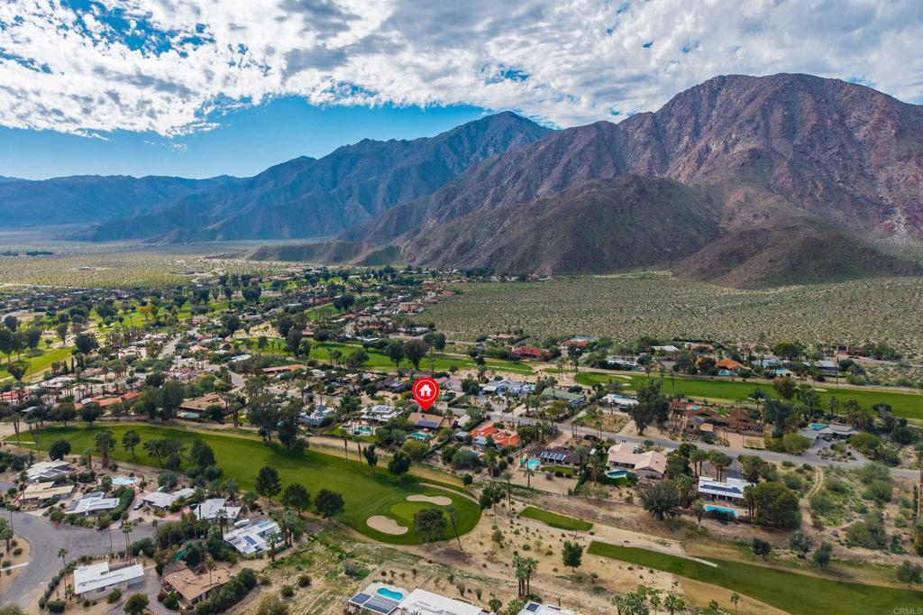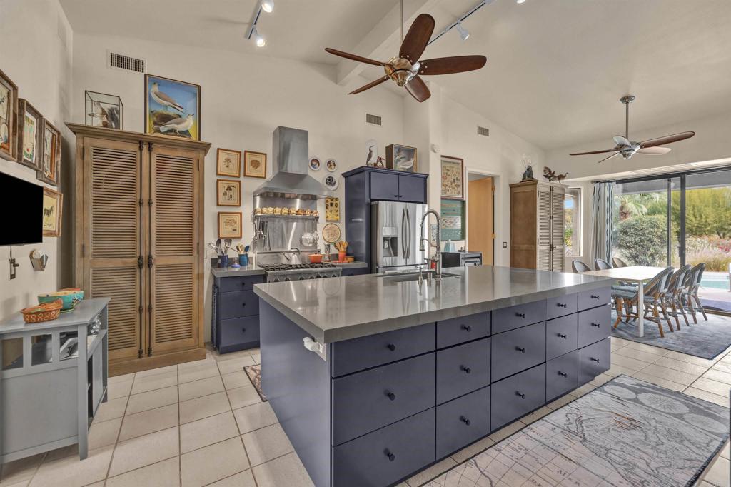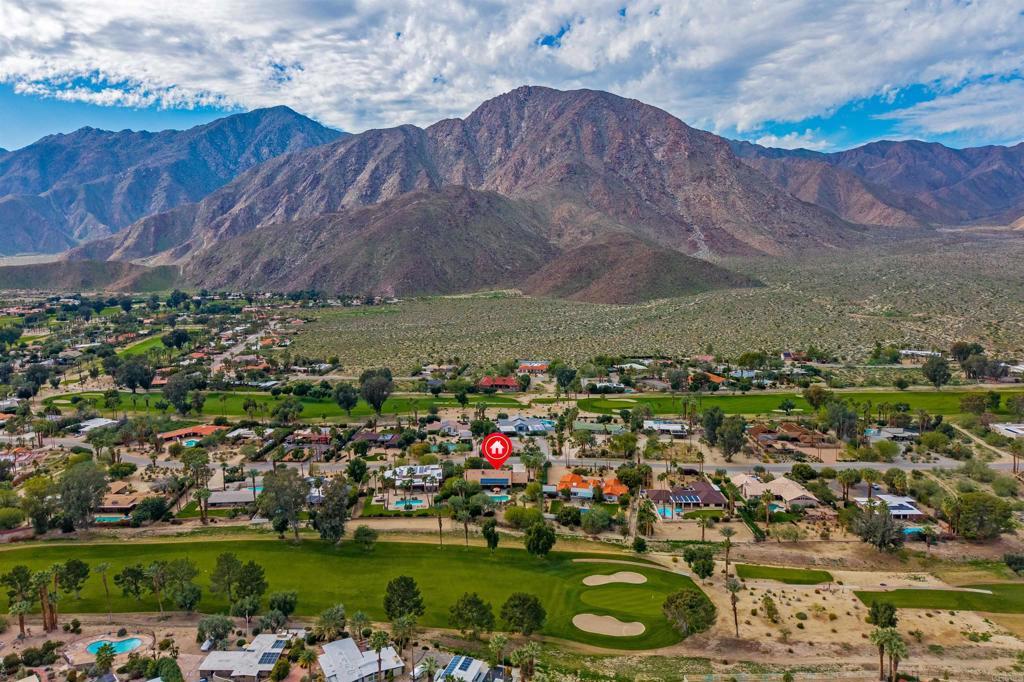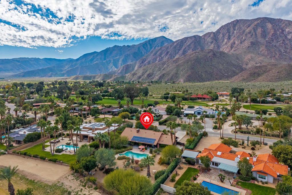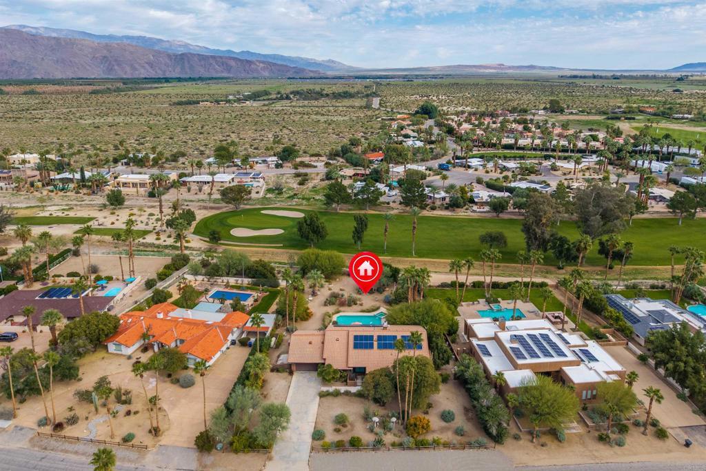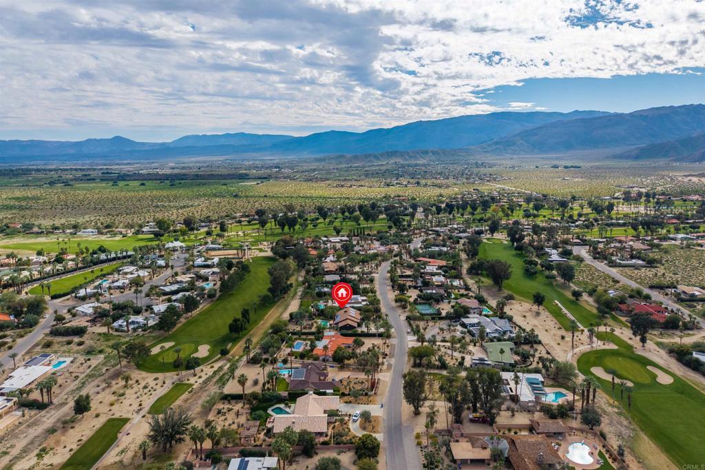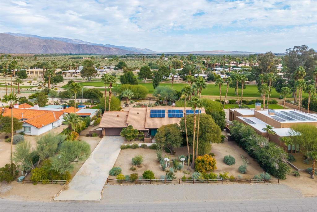 Spacious open floor plan with vaulted ceilings throughout the main living areas. The welcoming foyer opens into a bright living room featuring a cozy fireplace and sunken bar, perfect for entertaining. The working kitchen is equipped with a Viking range, large center island, and adjoining breakfast area. A functional laundry room, plus an additional side room ideal for extra refrigerator and storage and a convenient half bath with direct access to the backyard and pool area. The home offers three bedrooms, two full baths, and a powder room off the main hallway. Enjoy mature landscaping, a private pool area, and stunning views of the mountains and golf course. Owned solar adds efficiency and long-term value.