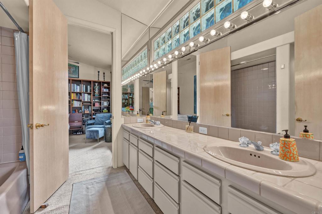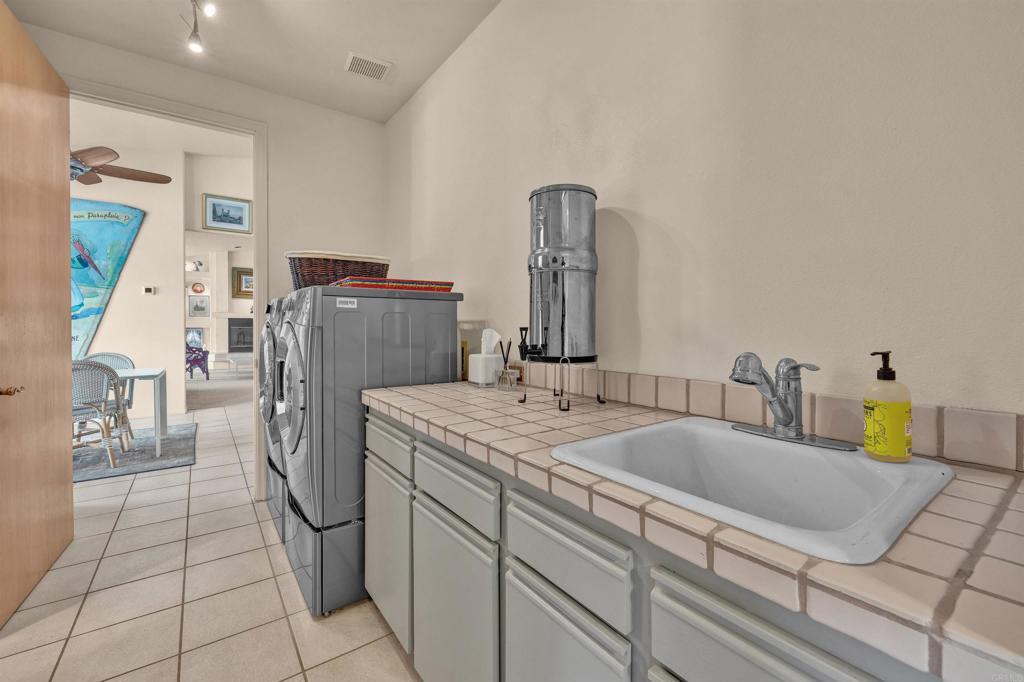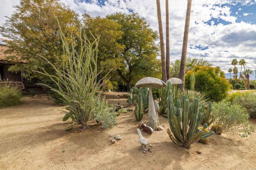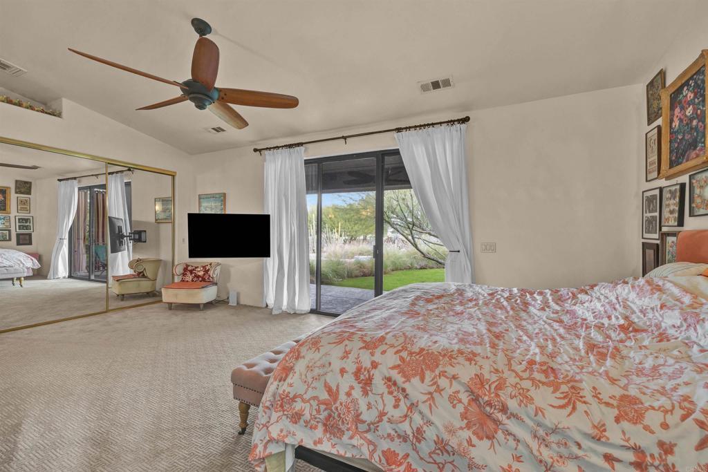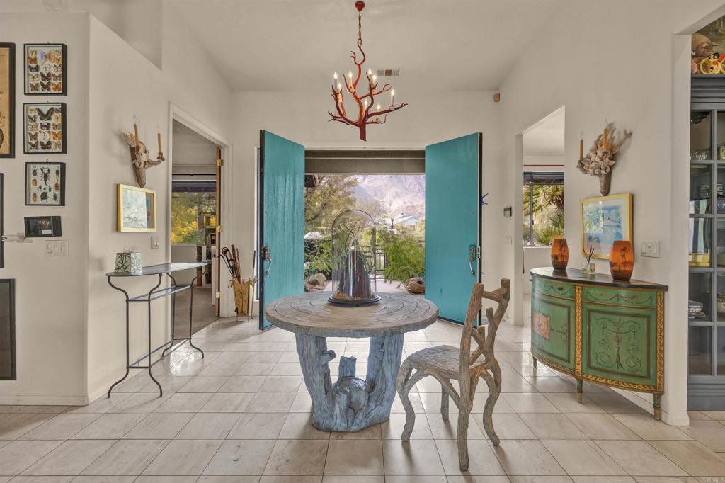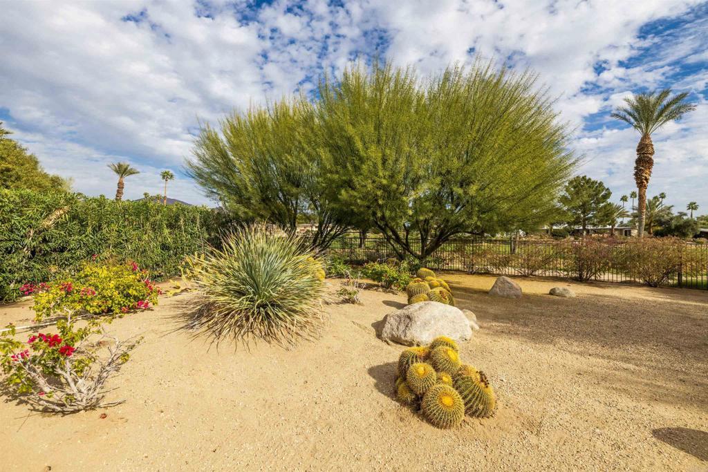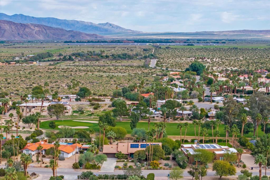 Spacious open floor plan with vaulted ceilings throughout the main living areas. The welcoming foyer opens into a bright living room featuring a cozy fireplace and sunken bar, perfect for entertaining. The working kitchen is equipped with a Viking range, large center island, and adjoining breakfast area. A functional laundry room, plus an additional side room ideal for extra refrigerator and storage and a convenient half bath with direct access to the backyard and pool area. The home offers three bedrooms, two full baths, and a powder room off the main hallway. Enjoy mature landscaping, a private pool area, and stunning views of the mountains and golf course. Owned solar adds efficiency and long-term value.