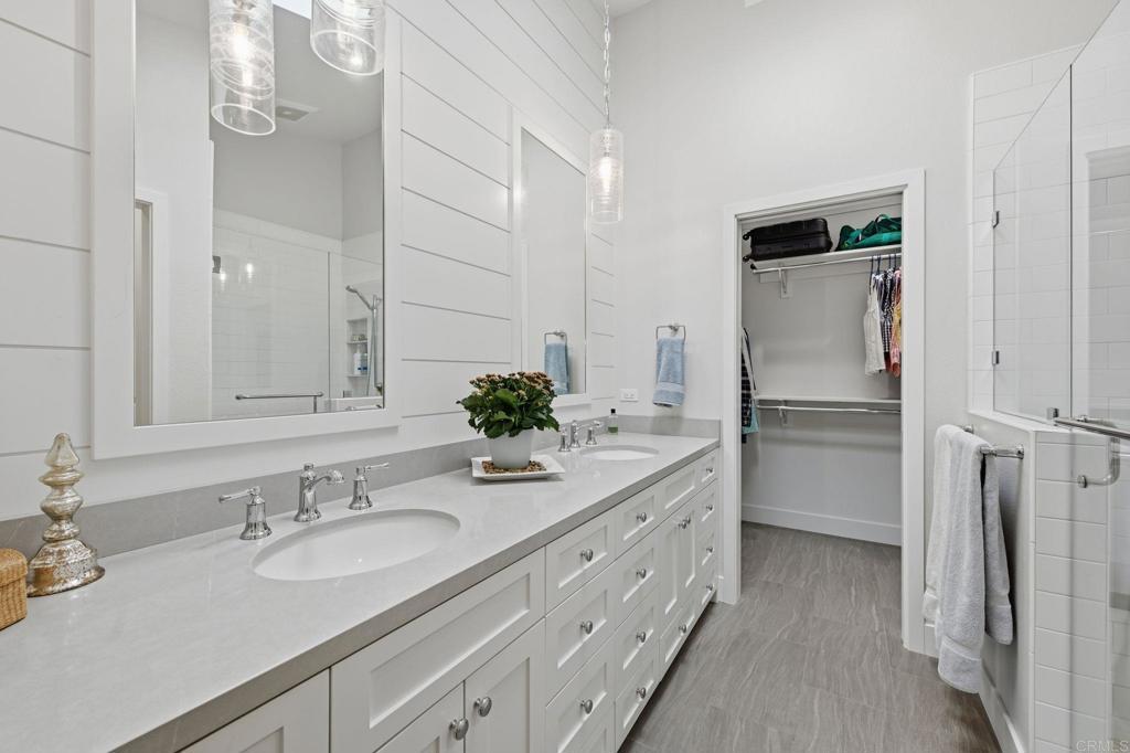 Coastal single-story living at its finest—just minutes from the ocean. Welcome to the highly coveted, gated community of Sea Cliff, where this beautifully upgraded detached single-level 2-bedroom, 2-bath residence is tucked away on a serene cul-de-sac and offers one of the most sought-after features in the community—a generous private driveway that accommodates two cars, a special and authorized convenience. Together, these rare attributes provide exceptional privacy, ease, and everyday functionality, all within a resort-style setting. Soaring ceilings and multiple skylights flood the home with natural light. Custom designer touches are woven throughout the home, with thoughtfully curated finishes, high-end materials, and refined details that elevate every space. The open-concept floor plan is designed for easy living and seamless indoor-outdoor entertaining. The inviting living room features a striking fireplace with decorative fire glass, a stylish shiplap accent wall, and custom built-in cabinetry—creating a warm, coastal-modern ambiance. Multiple sliding glass doors seamlessly connect the interior to a private rear wraparound patio, ideal for morning coffee, al fresco dining, or unwinding after a day at the beach. The chef’s kitchen is a standout, thoughtfully upgraded with high-end stainless-steel appliances including a 36" Thermador cooktop with center griddle, custom exhaust hood, Thermador convection oven, and Samsung refrigerator and dishwasher. Quartz countertops, a Kohler farmhouse sink, custom cabinetry with a lighted China cabinet, and a Velux Low-E skylight complete this stunning space. Luxury vinyl plank flooring flows throughout, complemented by energy-efficient Milgard windows and patio doors. The serene primary suite features a shiplap accent wall, a beautifully upgraded bath with quartz counters, and a walk-in closet with a conveniently located washer and dryer. The secondary bedroom and guest bath are equally refined, with custom finishes, designer lighting, and thoughtful details throughout. Step outside to your private garden-style patio, surrounded by lush greenery—your own tranquil outdoor retreat for entertaining or relaxation. Residents of Sea Cliff enjoy resort-style amenities, including two pools and spa, tennis courts, a clubhouse, and scenic walking trails that wind around peaceful ponds and streams, all set within impeccably maintained grounds. Single-story homes near the coast in Carlsbad are rare—this is your opportunity to live the lifestyle you’ve been waiting for, with the beach, award-winning schools, top dining, and premier shopping just moments away.