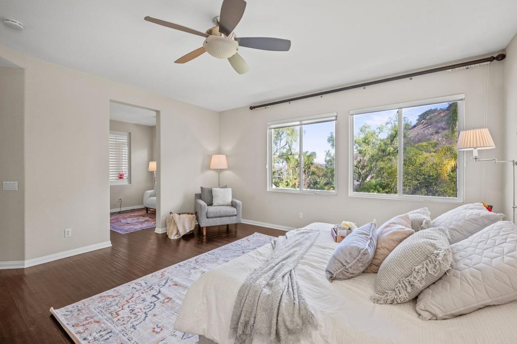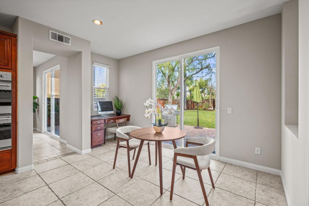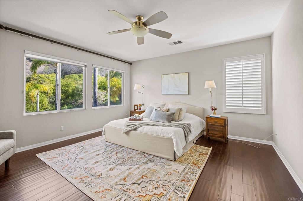 Welcome to this well maintained home in the highly sought-after Rancho Dorado community of San Marcos known for its charming streets, peaceful ambiance, and close-knit feel. From the moment you step inside, you'll notice how thoughtfully this floor plan has been designed to bring comfort, connection, and effortless living together. The expansive family room is truly the heart of the home, featuring a dreamy gas fireplace perfect for cozy evenings, and large picture windows that flood the space with natural light while framing serene views of the backyard. A highly desirable downstairs bedroom with a full bath offers flexibility that is ideal for guests, multigenerational living, or a quiet home office. The spacious kitchen complete with Viking Appliances, a generous center island, granite countertops, a walk-in pantry, and even a built-in desk area just off the breakfast nook perfect for homework, planning, or everyday organization. Upstairs you’ll find a welcoming second level with room for everyone. Two bedrooms share a convenient Jack-and-Jill bathroom. The large upstairs laundry room has its own sink, storage, and built-in cabinetry—makes laundry days an absolute breeze. The primary suite feels like a private retreat, offering its own sitting area, dual walk-in closets, dual vanities, and a centered soaking tub that invites you to unwind. Throughout the home, custom white plantain shutters add timeless elegance and an elevated, cohesive feel. The large backyard is just as inviting, offering a pool-sized space with lush grass area, beautiful landscaping, and a the paved patio is perfect for dining al fresco, entertaining, or simply enjoying the Southern California sun. Home has solar Solar and 3 car tandem garage.