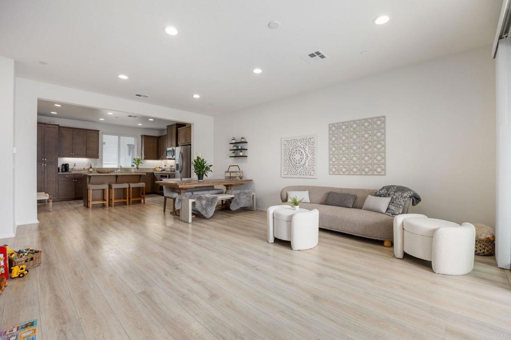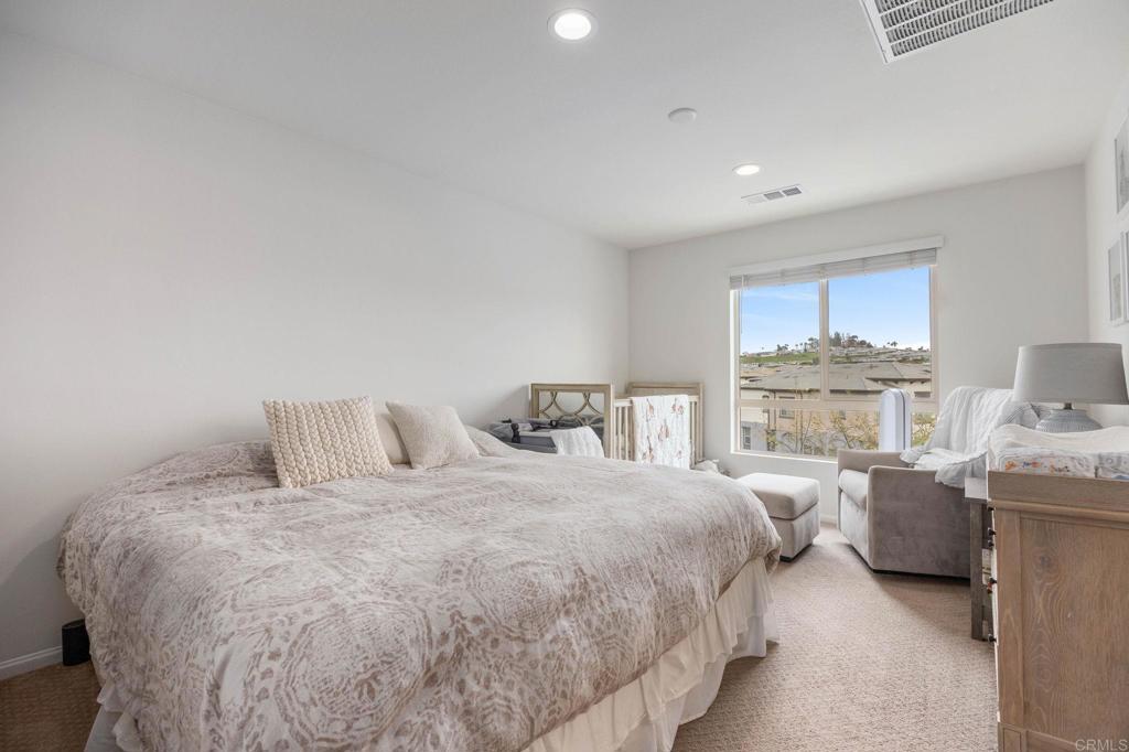 Welcome home to this model-perfect townhome in the gated community of Solana, at Skyline. This stunning home features an entry-level bedroom and full bath, with two matching primary suites on the third floor, each with a full bathroom. Both primary suites also include full walk-in closets. Enjoy the open-concept great room with a double slider to a walkout deck for your morning coffee or evening relaxation over looking the community pool. The kitchen boasts a slab granite island, handsome wood shaker cabinetry, LED lighting, stainless steel appliances, with gas stove cooktop and luxury vinyl flooring. The home is equipped with smart home features, air conditioning, fire sprinklers, an ADT security system. Two-car garage provides ample storage space. Community amenities include a pool, spa, BBQ area, playground, and extra guest parking with EV spots. Located near Bressi Ranch shopping, countless restaurants, local parks, hiking trails in Rancho Carrillo, and just minutes from the best coastal beaches and I-5 for effortless commuting. Don't miss this incredible opportunity to own a beautiful townhome in a highly sought-after communities!