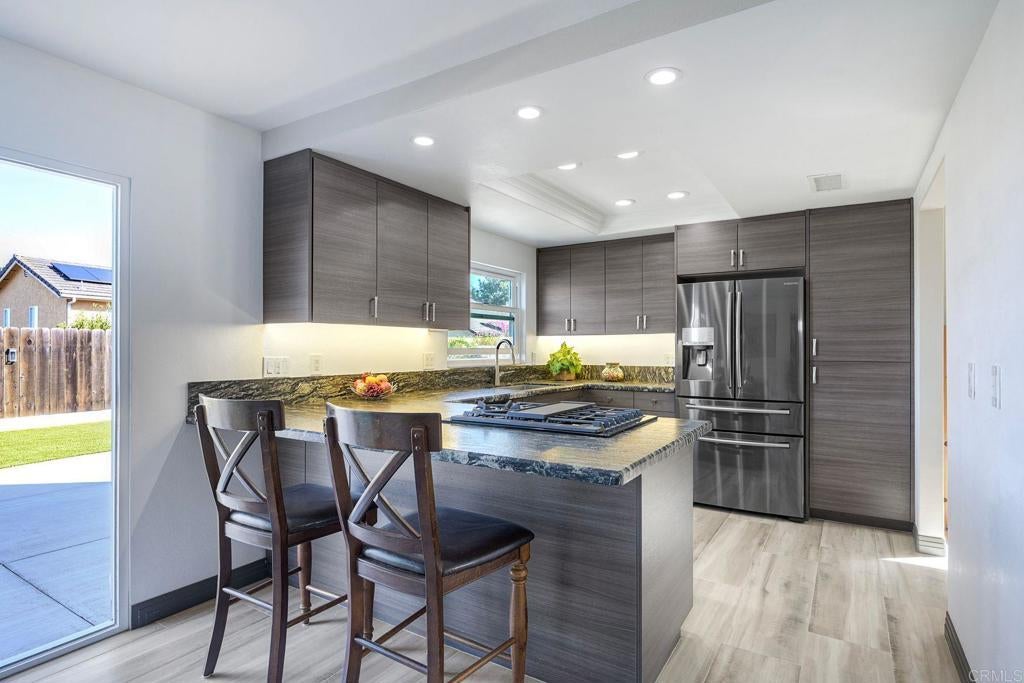 Must See! This turnkey stunner has been tastefully updated throughout, and shows beautifully. Located on a quiet cul-de-sac in the acclaimed San Marcos School District, this lovely 4 bed, 3 bath home features a bedroom and adjacent bath on the main floor, a gas fireplace in the living room, a roomy dining area, and a spacious family room with upgraded windows throughout. The primary suite features an opening leading to the adjacent bedroom (currently used as an office) and could easily be closed to restore the 4th bedroom to it's original configuration. The open kitchen layout boasts upgraded cabinetry with soft-close drawers, and topped with beautiful "leather" granite. Paid solar and artificial grass keep the utility bills low! Thoughtfully landscaped for low maintenance, the backyard features a roomy patio perfect for cookouts and entertaining, and a mini orchard with several fruit trees including Fuji Apple, Asian Pear, Lemon, Orange, Apricot and Persimmon. NO HOA!