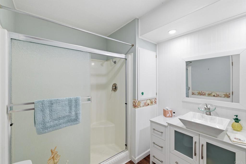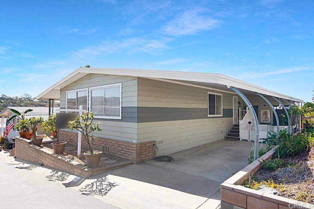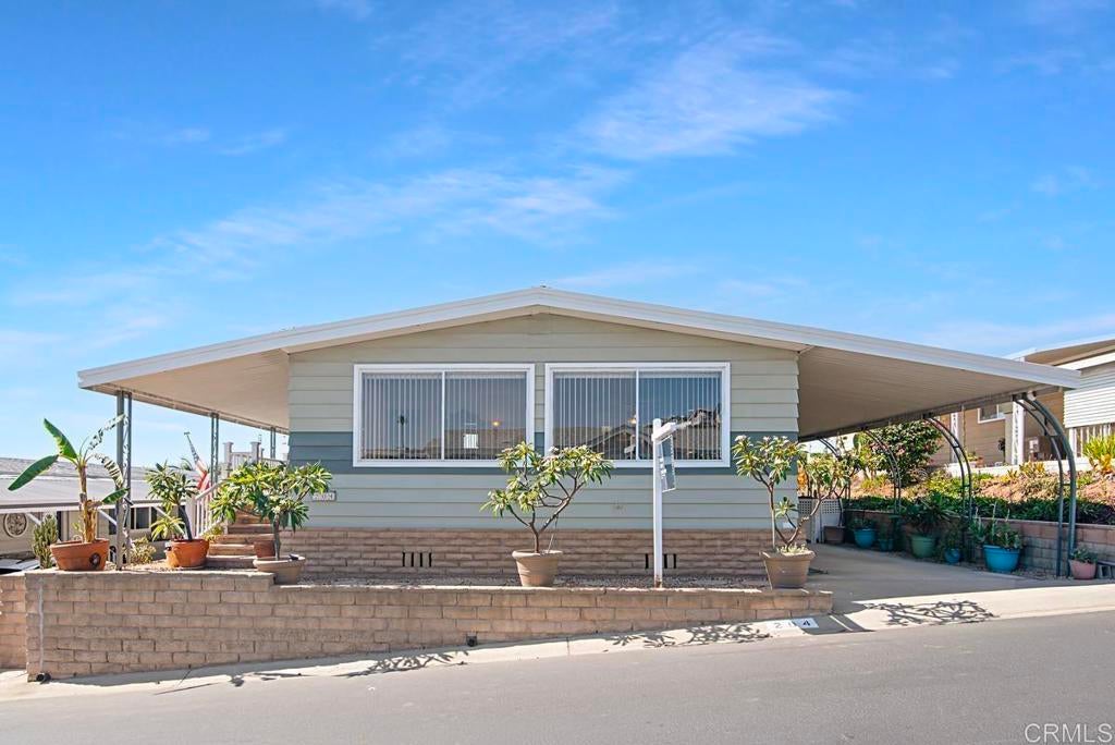 DO NOT look any further, I repeat, DO NOT look any further UNLESS you like ocean views and beautiful sunsets. Arguably, one of the top 20 lots in the swanky 55+Community of Palomar Estates West, this two bedroom / two bath home is ready to be yours! Besides the views, this home also comes with a RARE large backyard. Approximately, 45’x25’, it is beautifully landscaped with plenty of space for entertaining, gardening, or just relaxing and enjoying the wonderful ocean breezes. Some other details I love about this home: The roof and exterior paint is less than 4 years old. There is an extra large storage room at the end of the carport that is perfect for that needed workshop, craft or exercise space, or just storage--I LOVE storage!! In addition, there is a separate garden shed for your tools, pots and potting soil! The “California” room, which you can access from the exterior or 2nd bedroom, adds an additional 130+sqft! Another overlooked detail is that the curved awning poles give you more space for parking and guest parking is conveniently located across the street. Palomar Estates West is a 5 star 55+/35+ senior rent controlled park. Yes, the space rent is capped here! There are many activities and amenities including a beautiful clubhouse, pool, spa, sauna, gym, billiards, putting green, dog park, ping pong, and tennis courts. Did you say pickleball? Someone said pickleball and yes, there are 4 beautiful courts. This community offers you the opportunity to be as active or as social as you wanna be. Monthly breakfasts, themed parties, craft fairs, meditation classes, pickleball club, and more! Gated RV parking offered if needed. This home is located minutes to Lake San Marcos dining and golf as well as local Carlsbad beaches, shopping, and restaurants. The question is not why would you live here, it's why wouldn't you?!