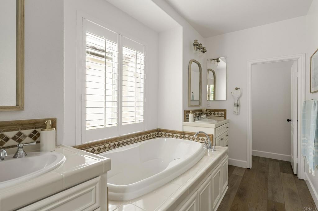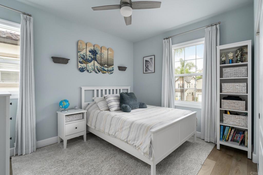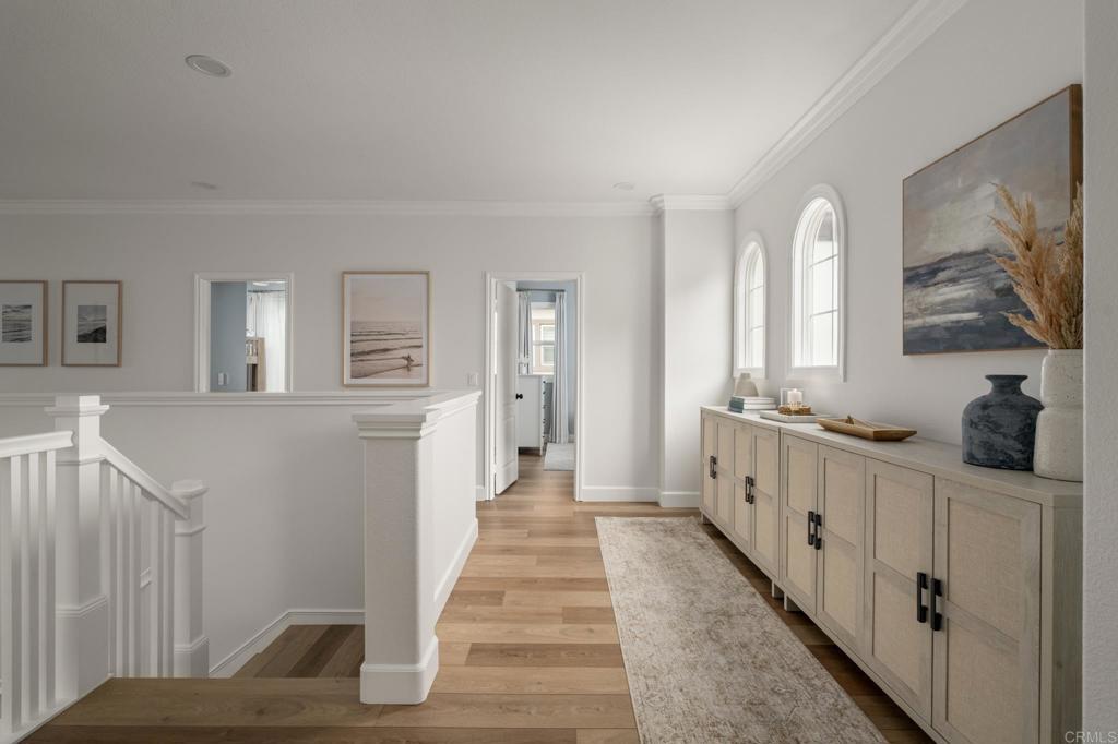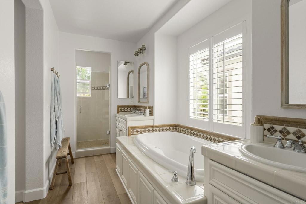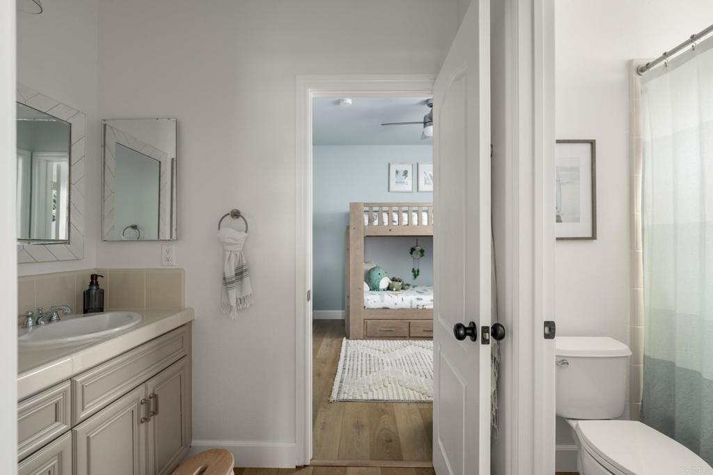 Entertainer's yard with modern upgrades! This stunning 5 bedroom plus office plus loft, 4 bath home is largest floor plan in the Venzano community near San Elijo Hills. Recently refreshed with new paint inside and out, this beautifully upgraded 3,437 sq ft residence delivers seamless indoor/outdoor living and designer finishes throughout. Inside, light-filled spaces feature luxury vinyl plank flooring and updated lighting. The remodeled chef’s kitchen is a true centerpiece with white shaker cabinetry, soft-close drawers, a dramatic Quartz double waterfall island, custom pendant lighting, and herringbone backsplash. High-end appliances include a Dacor built-in refrigerator, range with custom hood, double ovens, Bosch dishwasher, wine fridge, and appliance garage. A butler’s pantry with second wine fridge and walk-in pantry provides exceptional storage. La Cantina doors open to a private backyard retreat with a sparkling pool and Baja shelf, spa with waterfall, built-in BBQ with outdoor refrigerator. Designed for easy maintenance and year-round enjoyment, it’s an entertainer’s dream. The main level includes a full bedroom and bath, spacious living and dining areas, and a private office with custom built-ins. Upstairs features four additional bedrooms and a generous primary suite with dual closets, jetted tub, and oversized shower. Also equipped with owned solar for home and pool, dual A/C, tankless water heater, laundry room, a two-car garage with extra storage and newer windows. Located on quiet, wide streets with a neighborhood tot lot, it's close to popular Questhaven park. There are trails leading to San Elijo Elementary and Middle Schools and it is zoned for San Marcos High. Experience the best of San Elijo Hills living with Town Center shopping and dining nearby and 18 miles of scenic trails for hiking, biking, and outdoor adventure. Modern living and move-in ready!