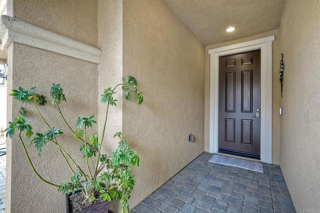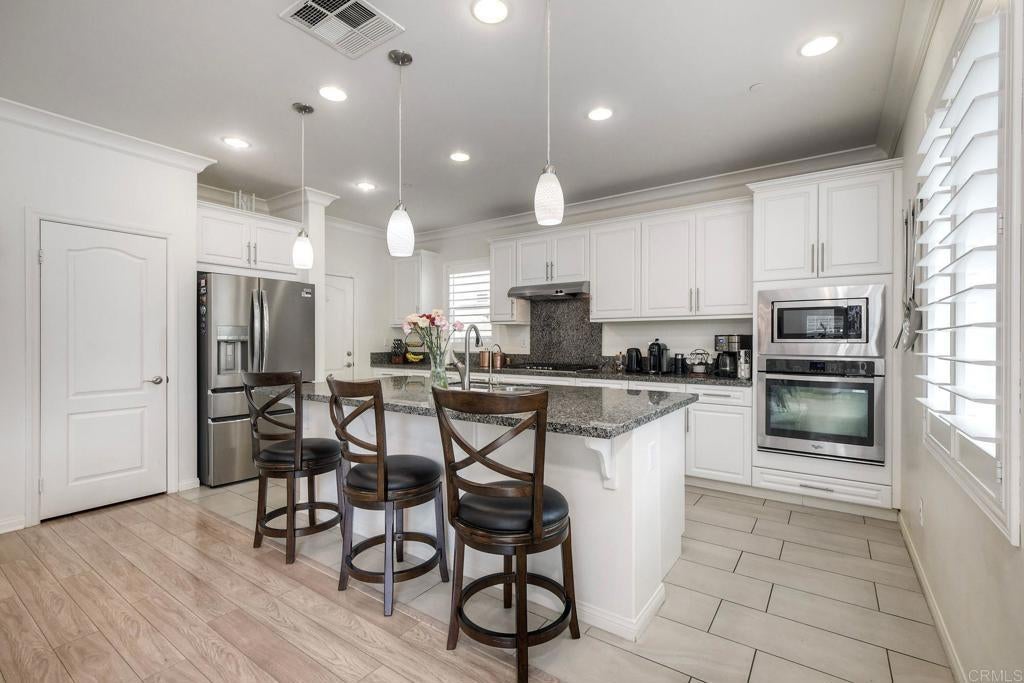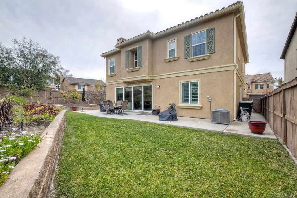Charming 2013-built Rancho Santalina's Vista Collection of KB homes, 4-Bed, 3-Bath 2,608 sq ft home on a 0.17-acre private corner lot. Multi-gen layout, features 1 bedroom and a standalone full bath with a stall shower on the main level. Primary suite includes dual sinks, a soaking tub & walk-in shower. 4-panel stacking sliding door opens to a landscaped backyard with a wraparound concrete patio, retaining wall, lawn and 14+ fruit and vegetable trees indoor-outdoor living. Upgrades include SPC waterproof flooring, crown molding, plantation shutters, custom window treatments, bidet toilets, a white gourmet kitchen, upgraded stove, Kohler Touchless kitchen faucet, RainSoft whole-home water purification system, CleanStart laundry system with kitchen under-sink filtration, 27-panel owned solar, and EV charger. Washer, dryer, laundry cabinetry, and outdoor dining set may convey. Located near shopping, dining, schools, Palomar College, California State University San Marcos, and easy access to Highway 78. A Turn-Key Home with Upgrades.
