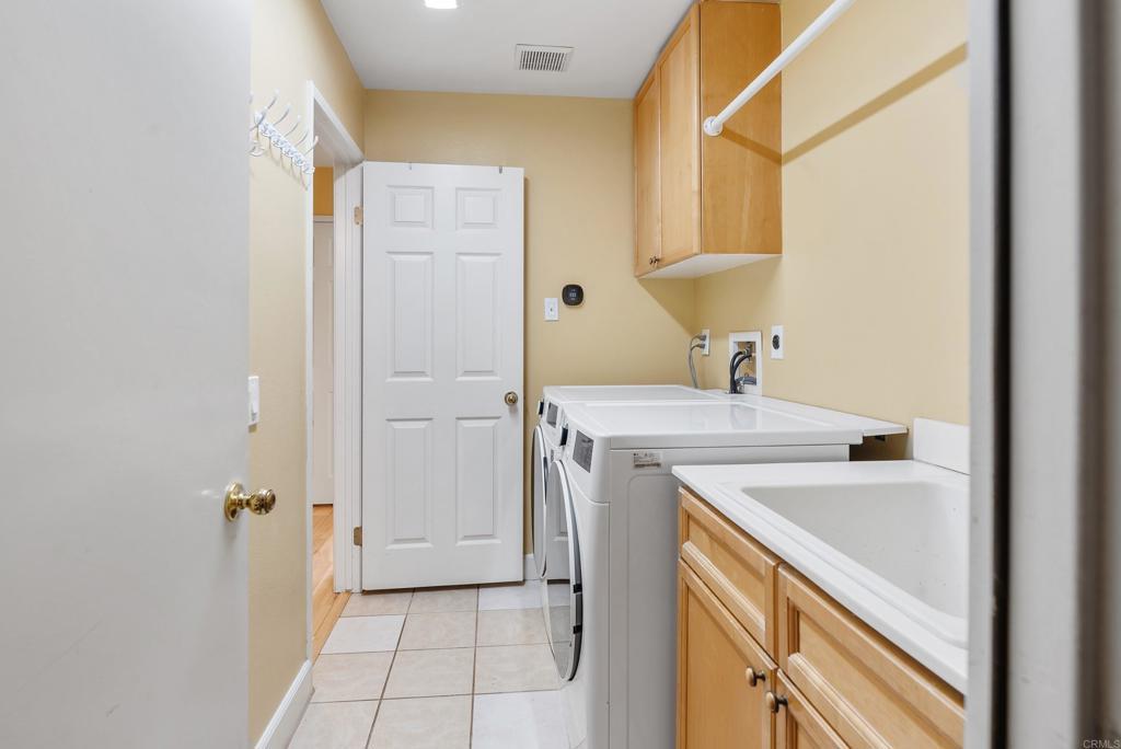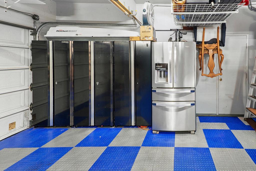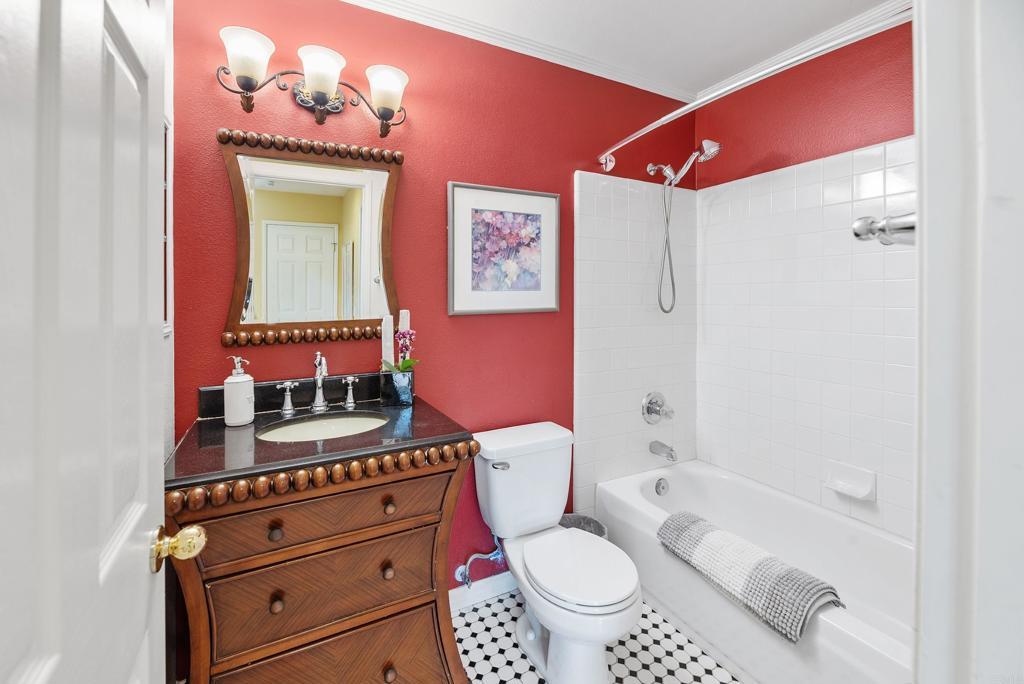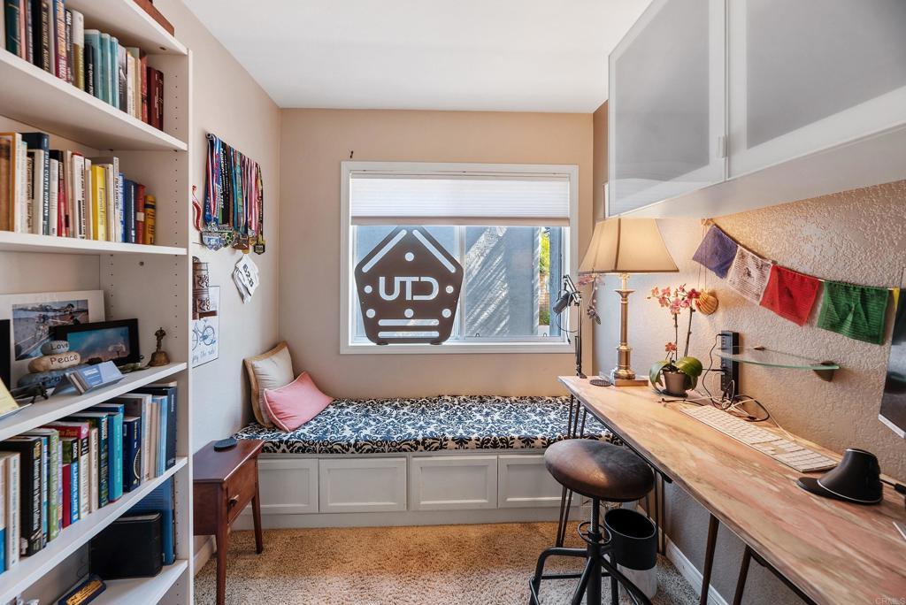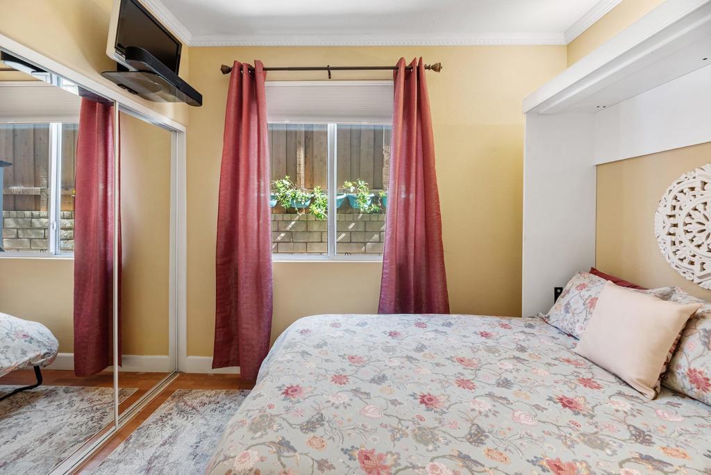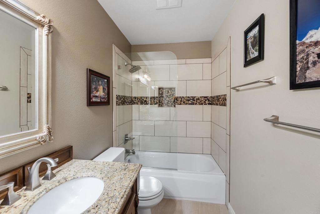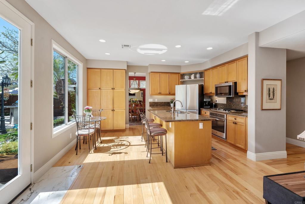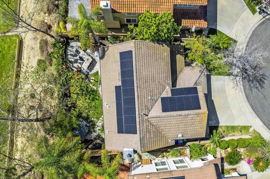 Welcome to this charming, HIGHLY CUSTOMIZED remodeled cul-de-sac home in the sought-after PACIFIC RIDGE neighborhood of Sorrento Valley. SEE DRONE TOUR as this home is Ideally situated adjacent to scenic HIKING/BIKING TRAILS, this light-filled residence offers energy efficiency with OWNED SOLAR. (Current Electric Bill is $0) Step through the double leaded-glass entry doors onto newer hickory hardwood floors. Soaring ceilings and dual-pane windows with custom casings bathe the home in natural light. Added custom features are the mounted TV in living room and refrigerated wine closet. The gourmet kitchen features granite countertops, newer stainless-steel appliances, a cozy breakfast nook and center island with counter seating. The kitchen opens seamlessly to the inviting family room, highlighted by a REBUILT stainless steel wood burning fireplace, newer flue and custom mantel. Designed for indoor-outdoor living, the SOUTH FACING BACKYARD, is an entertainer’s dream. Enjoy mountain views and sunny afternoons surrounded by lush, easy-care, mature landscaping, redwood planters, and soothing fountains, complete with an above-ground spa and a granite surfaced patio island with grill & stools. The DOWNSTAIRS BEDROOM includes a Murphy bed and is serviced by a beautifully remodeled full bath. Upstairs, the carpeted hardwood staircase leads to the stunning primary suite, where you can greet the MORNING SUNRISE from your bed. The expanded primary bath offers 2 separate granite vanities, custom lighted drawers, hidden medicine chest, large walk-in shower, soaking tub, heated towel rack, heat lamp, multiple windows, and TWO walk-in closets—creating a spa-like retreat. upstairs are 3 more bedrooms—one oversized-ideal as a bonus room/office, plus a remodeled hall bath with dual sinks. The 3-car garage has blue-and-white RACEDECK flooring, abundant storage, overhead racks, 20 AMP charger outlet.
