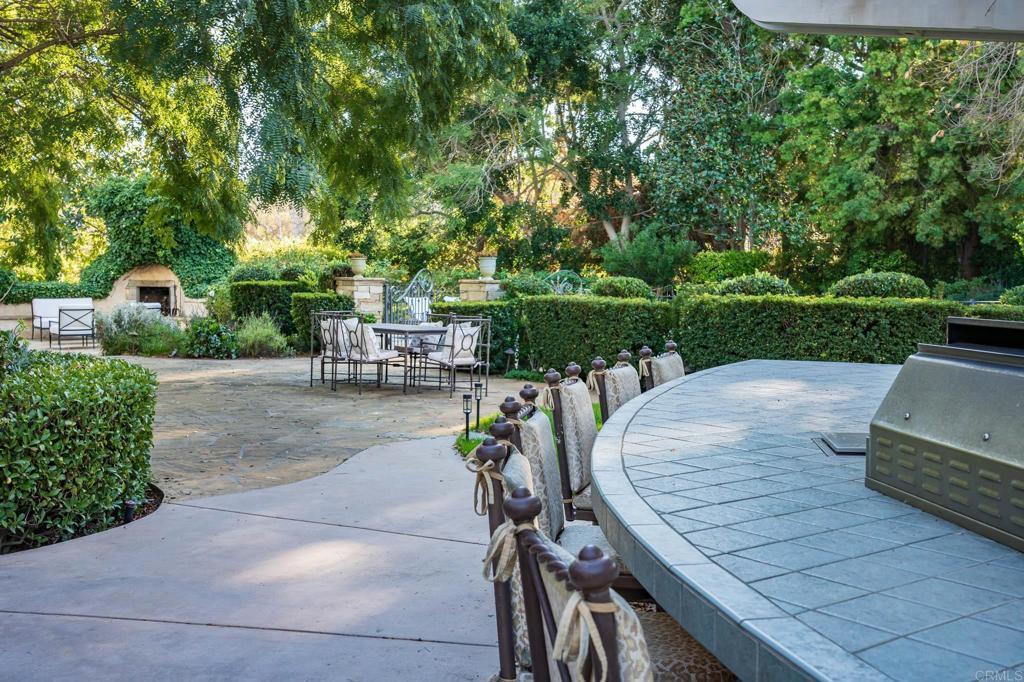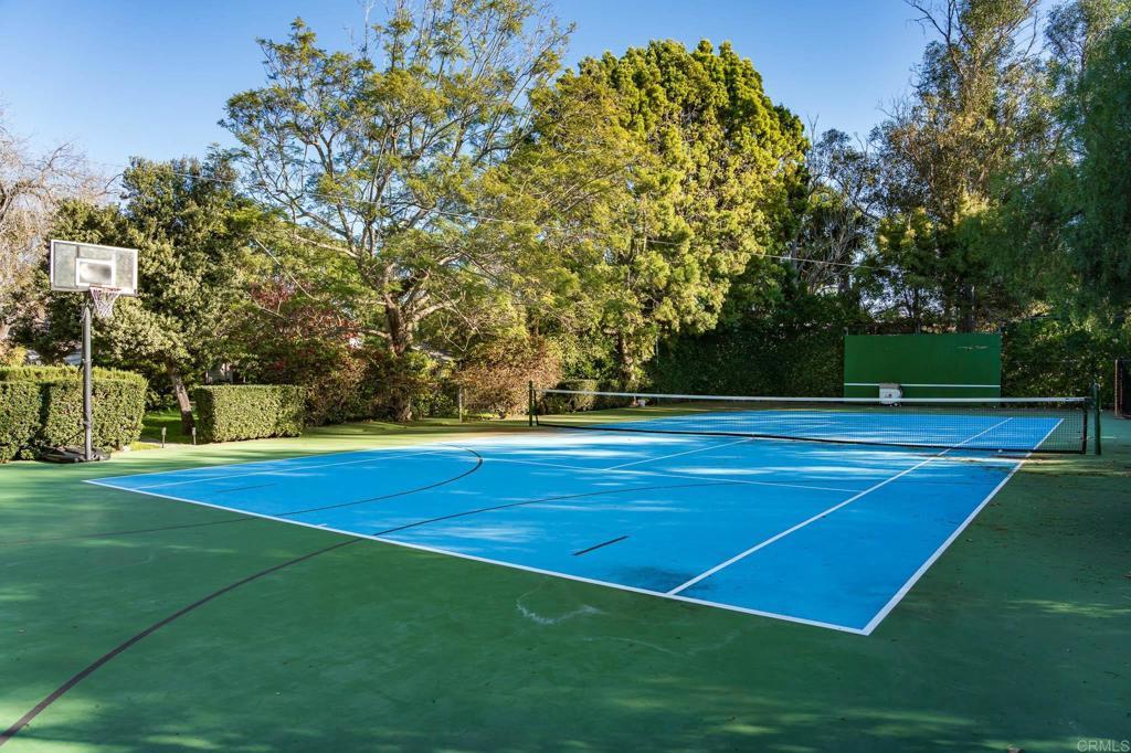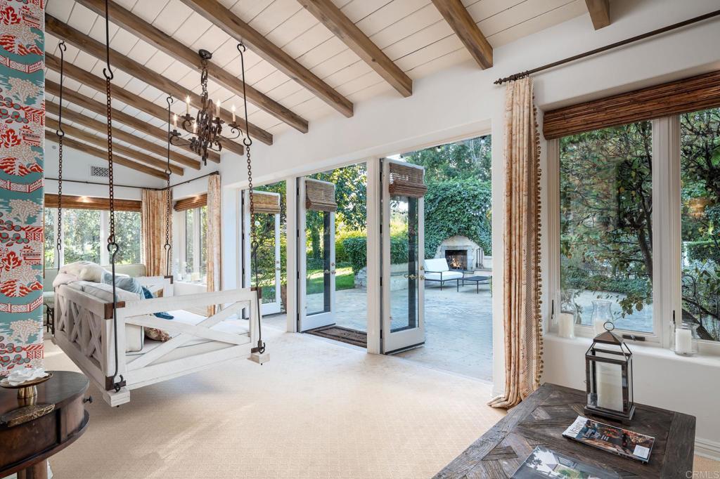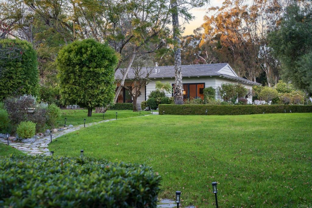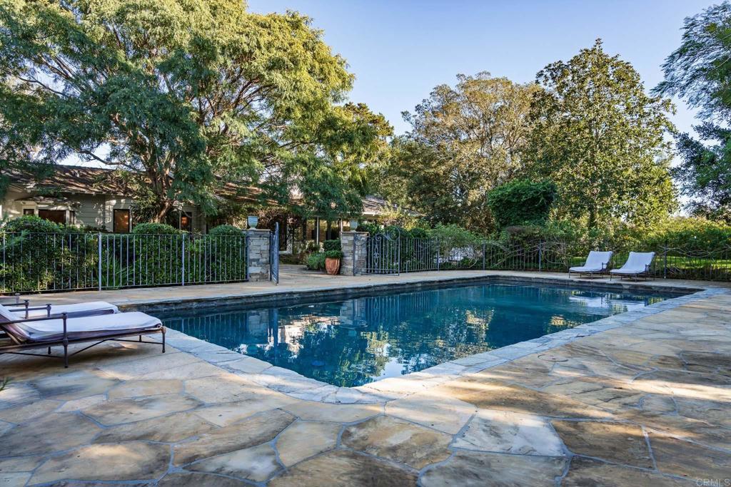 Nestled in a peaceful, private setting, this timeless residence has been thoughtfully renewed to suit contemporary family living. The gracious layout features a serene primary sanctuary, a dedicated family wing with five en-suite bedrooms, and a spacious game room enhanced by a cozy fireplace and adjoining catering kitchen. Numerous French doors create effortless flow from the main living spaces to the inviting outdoor areas. The level, fully usable 4.19 acres include a 1,081 sq. ft. two-bedroom, two-bath guest house, tennis court, gated pool, citrus and fruit orchard, and expansive lawns. This classic Covenant property sits on meticulously maintained grounds with a built-in barbecue, fireside gathering spot, and vibrant flowering gardens. Inside, the refined primary suite has been transformed into a luxurious haven featuring premium finishes, custom millwork, and marble accents. The warm, welcoming kitchen is equipped with top-tier amenities complemented by Calcutta marble countertops and custom refinished cabinetry. Formal living and dining rooms highlight exceptional craftsmanship, including detailed beamed ceilings, abundant built-in cabinetry, and an impressive carved limestone fireplace. A sunroom just off the living room provides yet another inviting space to enjoy the surrounding scenery. The charming guest cottage—complete with kitchenette, living area, and laundry—boasts plentiful windows that flood the space with natural light and frame views of the beautiful grounds. Main residence: 7,592 sq. ft. | Guest house: 1,081 sq. ft. | Garage: 950 sq. ft.