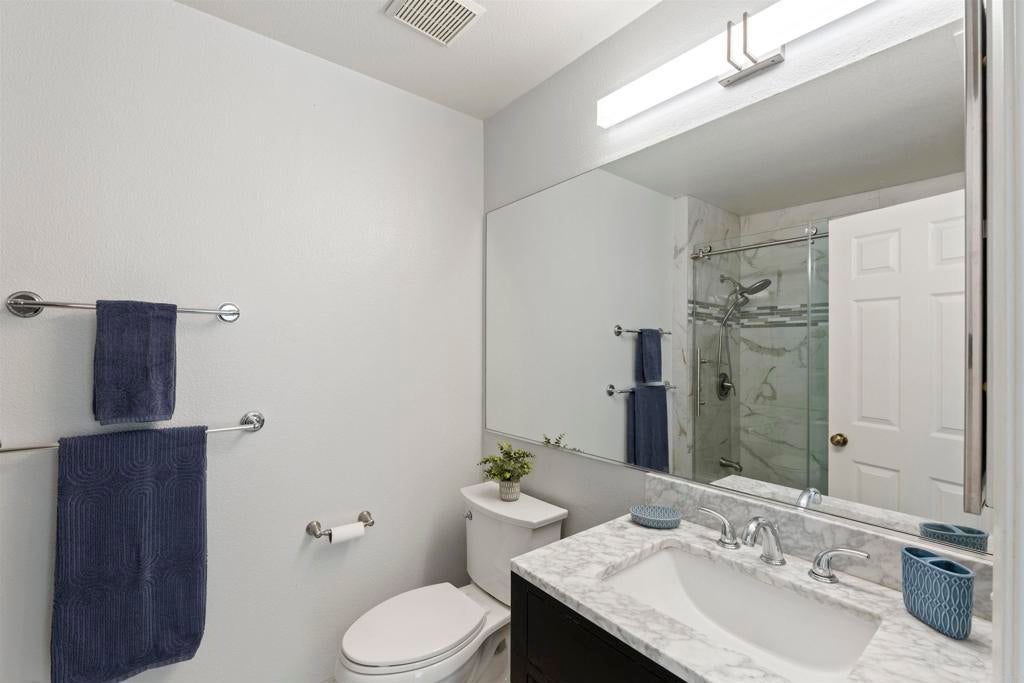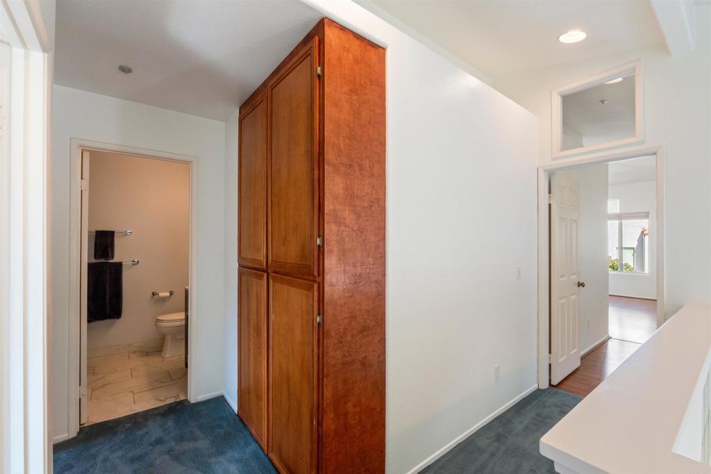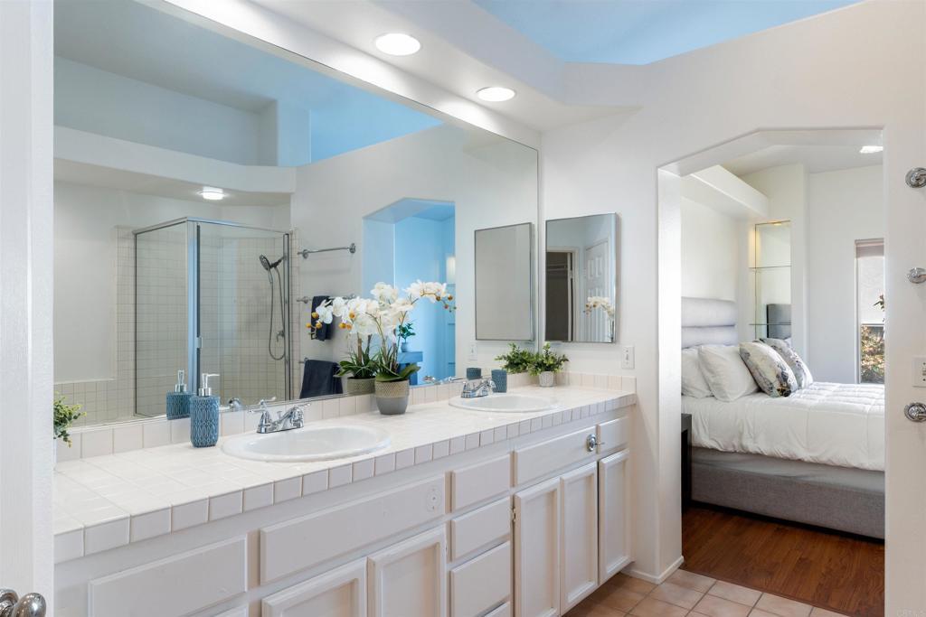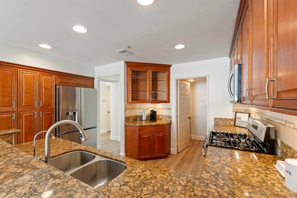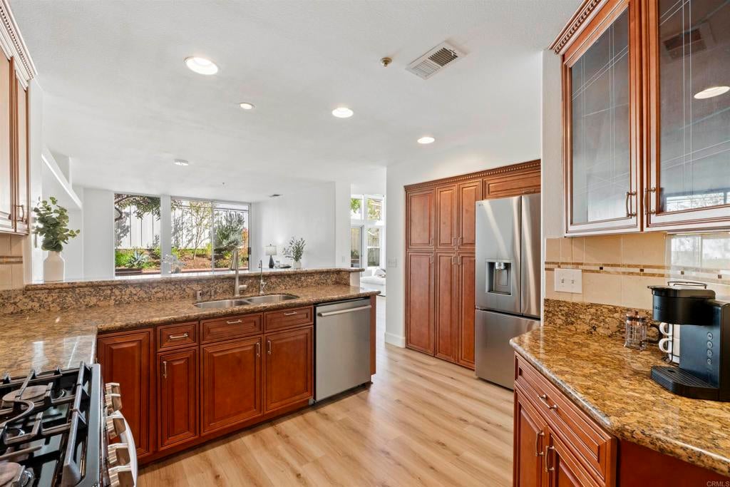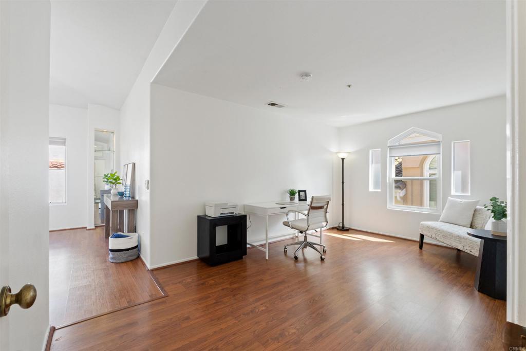 This nearly 1,900 sq ft townhome is the largest floor plan in the gated community of Calypso in Shadowridge. Offering 3 bedrooms plus an optional 4th bedroom and 2.5 bathrooms, this move-in ready home combines space, functionality, and thoughtful upgrades. Features of the home include fresh interior paint, vinyl plank flooring, a newly updated powder room, newer windows, whole house attic fan, A/C, and a Moen Smart Water monitoring system. The living room is light and bright and offers vaulted ceilings, a cozy fireplace and a slider out to the back patio. The chef’s kitchen is appointed with custom soft-close cabinetry, granite countertops, stainless steel appliances, and a breakfast bar. A combo laundry room and walk-in pantry located off the kitchen includes a newer, full-size washer and dryer along with plenty of shelving for food storage. Adjacent to the kitchen is additional living space, which could be used as a family room, dedicated dining space, or both. Upstairs, you’ll find two guest bedrooms and a full bath, along with a spacious primary suite featuring a flexible retreat area, ideal for a home office, nursery, or optional fourth bedroom. The large primary bath includes dual sinks, a soaking tub, separate shower, and a walk-in closet. Residents of Calypso enjoy access to a sparkling community pool and spa and are directly across from Buena Vista Park Pond & Open Space, perfect for walking trails, outdoor recreation, and enjoying nature. Located approximately seven miles from the coast with convenient access to Highway 78, shopping, dining, schools, and the Shadowridge Golf Course, this home offers both comfort and convenience in one of Vista’s most sought-after neighborhoods.