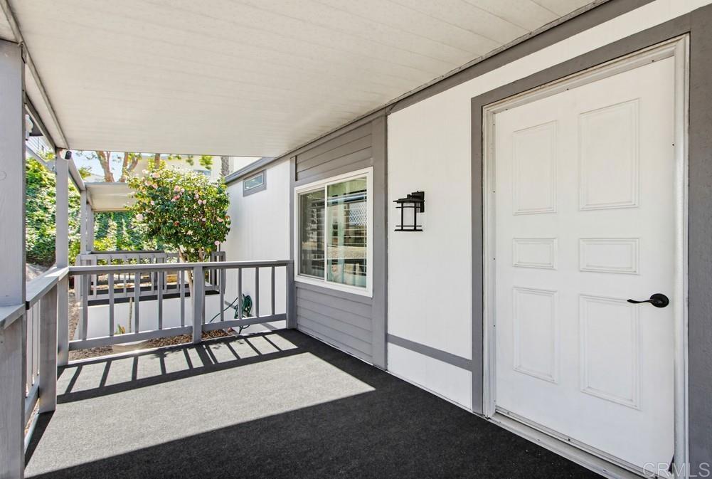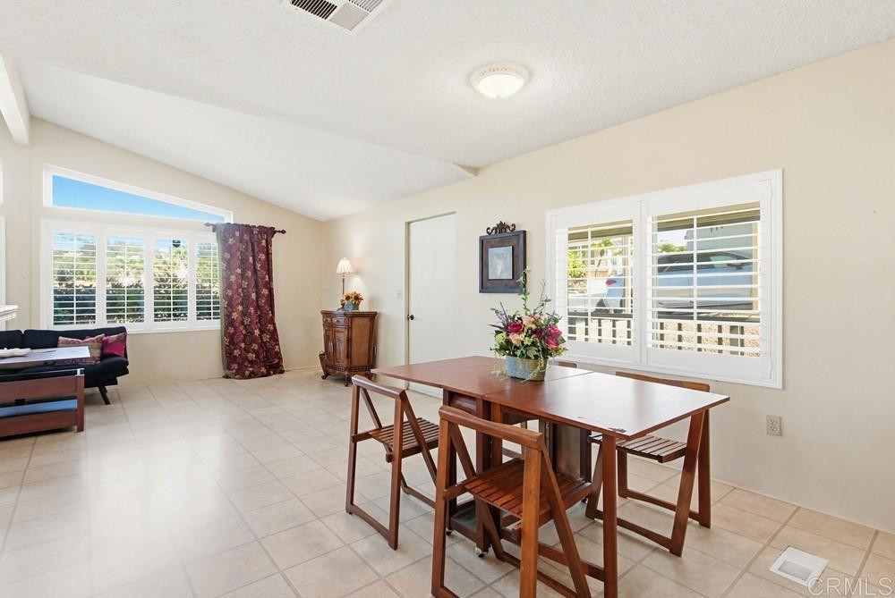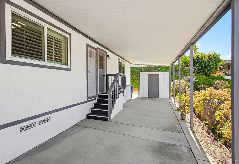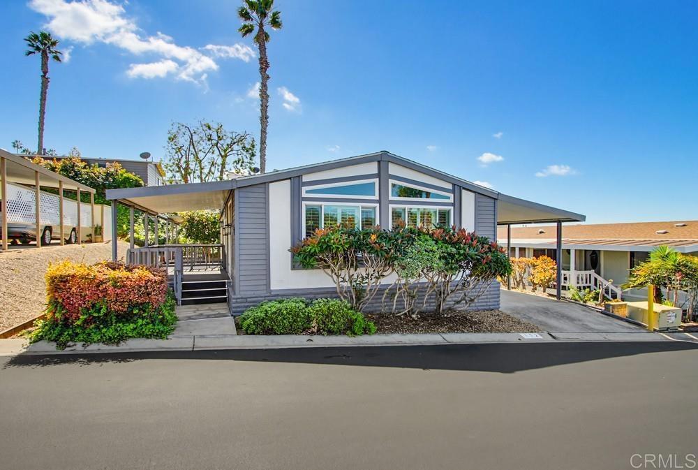 Wonderful two bedroom and two bath home in highly desired Palomar Estates West. The open floor plan and vaulted ceiling in the living room make this home feel very spacious. The remodeled kitchen has beautiful wood cabinets, an island with a bar top, and stainless steel appliances. The home has vinyl dual-pane windows and plantation shutters throughout the main living areas and bedrooms. Both bathrooms have been remodeled as well. Outside you have two porches to enjoy the wonderful San Marcos climate, a small yard, and some mature citrus trees. A shed gives you extra space to store your items. Palomar Estates West is a 5 star 55+/35+ senior rent controlled park with many activities and amenities including a beautiful clubhouse, heated pool, spa, gym, putting green, pickleball courts, and tennis courts. This home is located minutes to Lake San Marcos dining and golf as well as local Carlsbad beaches, shopping, and restaurants.