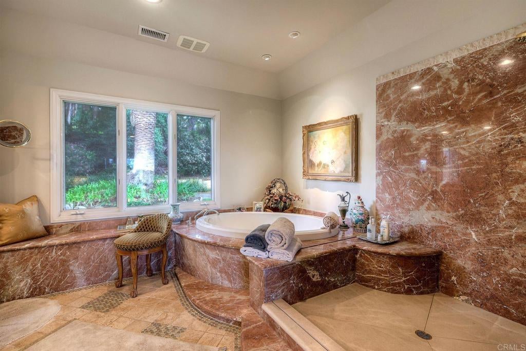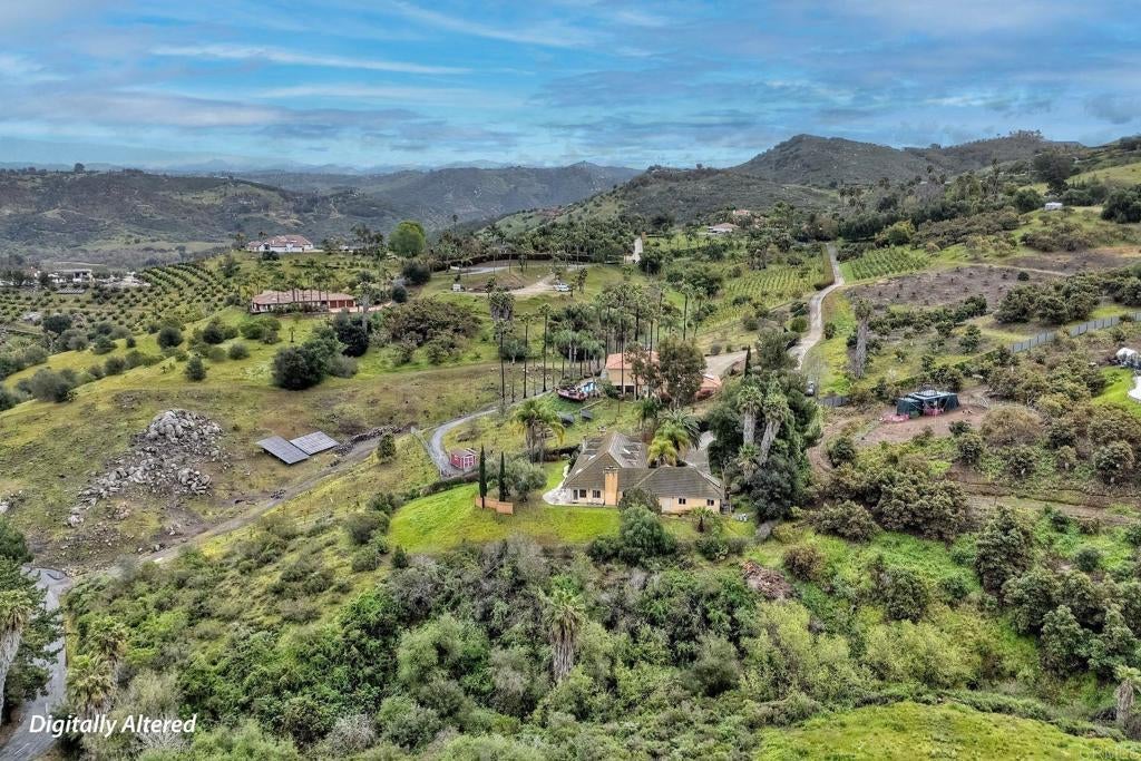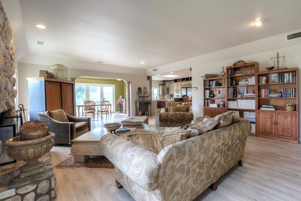 Welcome home to your own private estate nestled in the picturesque hills of Bonsall. Set on over four sprawling acres, this SINGLE STORY custom residence offers the perfect blend of privacy, exclusivity, and timeless elegance. Step through the formal entry and you’re immediately greeted by soaring ceilings and walls of windows that flood the home with natural light. The formal living area showcases wide-plank flooring, a statement fireplace, and French doors that open seamlessly to the backyard — creating an effortless indoor-outdoor flow. Just off the entry, a dedicated office provides flexibility and can easily be converted back into a bedroom if desired. The formal dining room features a recessed ceiling and custom chandelier, setting the stage for memorable gatherings. Travertine flooring leads you into the beautifully remodeled kitchen, complete with custom cabinetry, granite countertops, double ovens, and even a warming drawer — thoughtfully designed for hosting holiday dinners and entertaining with ease. The adjacent family room offers a stunning stone fireplace, perfect for cozy winter evenings. An added sunroom extends the living space and provides the ideal setting to relax while taking in the breathtaking hillside views. Toward the rear of the home, you’ll find an additional office space and full bathroom, offering versatility for guests or multigenerational living. On the opposite wing, the primary suite serves as a true retreat — generously sized with a private sitting area and its own fireplace, designed for comfort and seclusion. Surrounded by rolling green hills and set well apart from neighboring properties, this exceptional estate delivers the peace, space, and lifestyle you’ve been searching for.